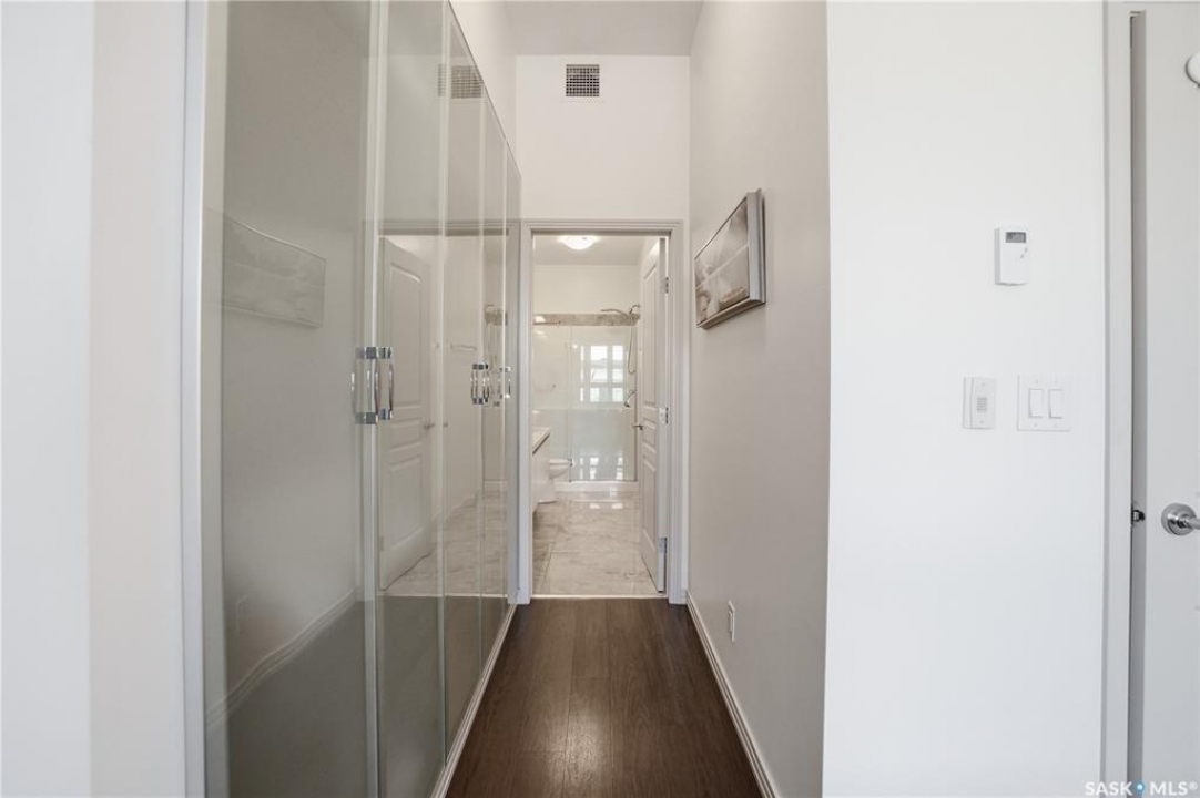 Spectacular top-floor condo in Sequoia Square! This impressive 2-bedroom, 2-bathroom residence features 10-foot ceilings and oversized windows that flood the space with natural light. The open-concept floor plan is beautifully finished and includes in-floor heating throughout for year-round comfort. The kitchen is designed to impress with quartz countertops, soft-close cabinetry, stainless steel appliances, and seamless flow into the dining and living areas. The primary bedroom is a true retreat, offering large windows, a sophisticated dressing/closet area, and a modern en-suite with double sinks, heated tile flooring, and a walk-in shower. A second bedroom, four-piece bathroom, and convenient laundry/storage room complete the interior. Additional highlights include a spacious balcony, central air conditioning, one underground parking stall with storage cage, and one electrified surface parking stall. Both parking spots are close to doors and elevator. The building offers a welcoming main lobby and recreational rooms on each floor. Ideally located with easy access to the University of Saskatchewan and surrounding amenities.