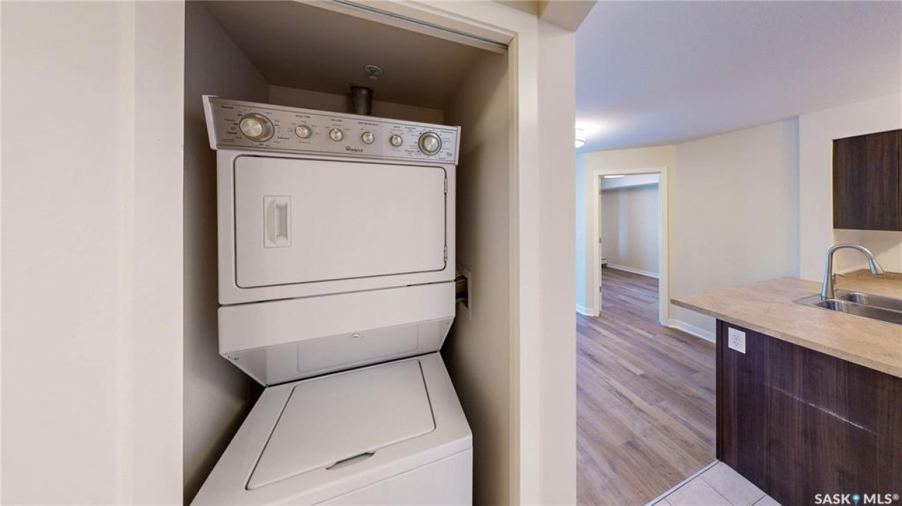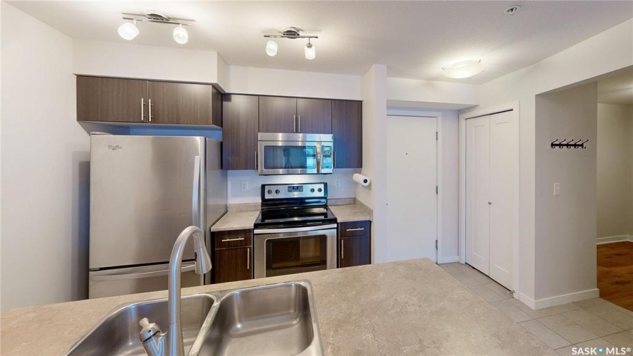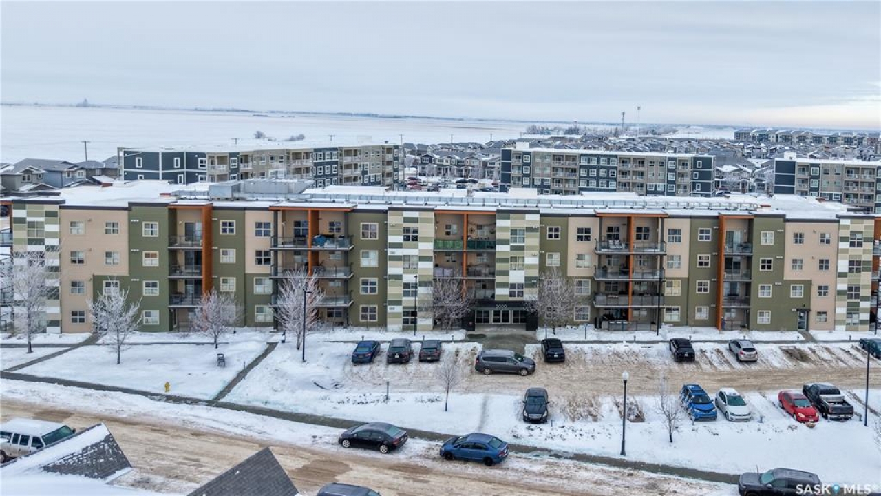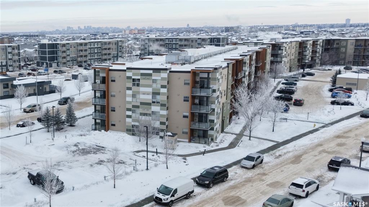 Welcome to unit 2115 at 5500 Mitchinson Way located in the highly convenient neighborhood of Harbour Landing where shopping, restaurants, parks, and everyday amenities are all just minutes from your door. This 2015 built, 812 square foot, 2 bedroom 2 bathroom plus a den apartment style condo is on the main level of the building making it wheelchair accessible. You enter the suite into the foyer with a coat closet. The kitchen features tile flooring and includes the stainless steel fridge, stove, microwave hood fan and dishwasher. The living room has a bright north facing window and access to your private patio. There is ample street parking here as well making this another great entrance to your home. All of the vinyl plank flooring in this suite is brand new! The primary bedroom has closet space and a 4 piece ensuite bathroom. The second bedroom is next followed by the main 4 piece bathroom. Finishing off the unit is a den that makes a wonderful office or storage space and your in-suite laundry with included washer and dryer is tucked neatly behind a door just outside the den! The condo fees are $519 a month and include common insurance, sewer, common area maintenance, exterior building maintenance, snow removal, lawn care, water, garbage, heat and reserve fund. You also have two personal parking spaces. One outside in the parking lot and one underground!
