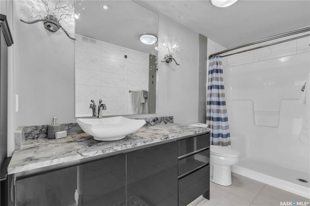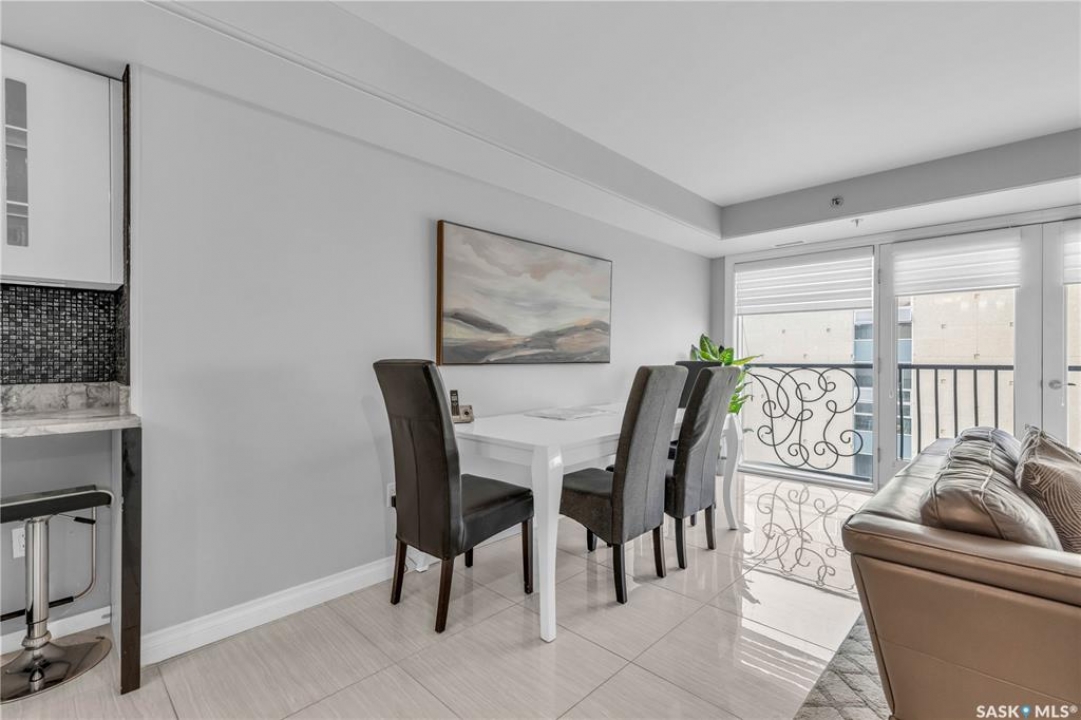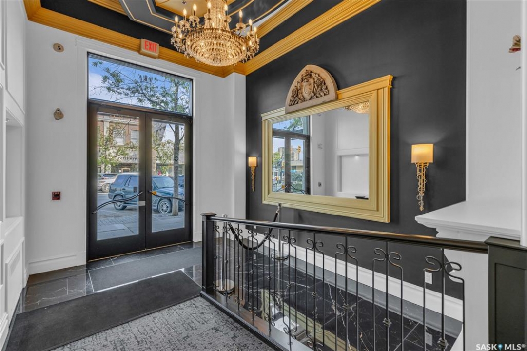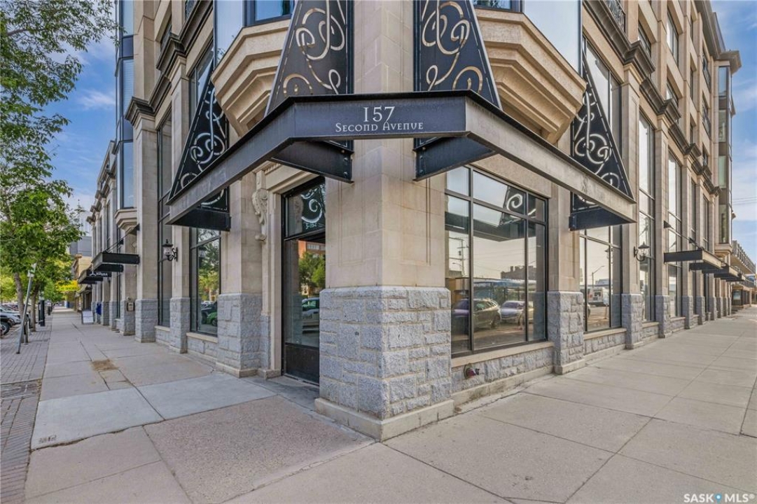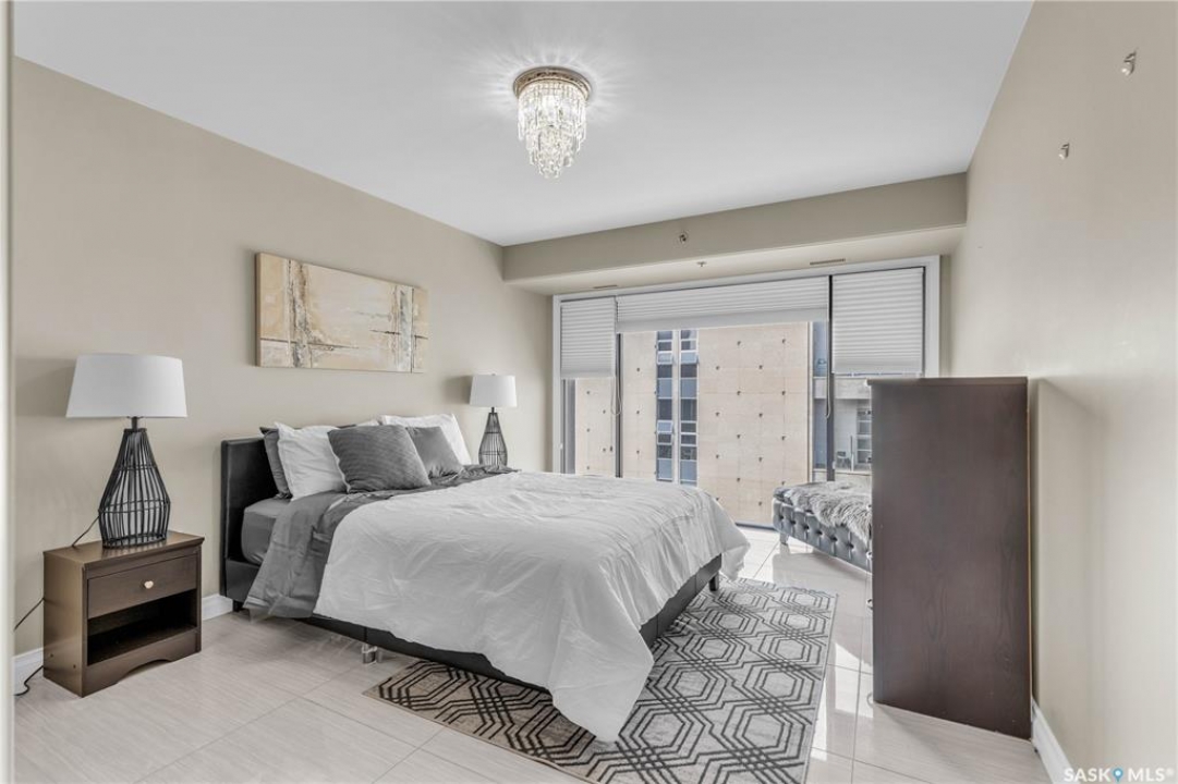 Fully-furnished top-floor executive suite with 2 bedrooms, 2 bathrooms and 2 Underground Parking Stalls! Historic elegance meets modern luxury at the Residences at King George. This iconic landmark is close to shops, dining and just a few blocks from the scenic riverfront. Luxurious limestone tile flows throughout, and floor to ceiling windows provide tons of natural light. The kitchen features sleek granite countertops and high-gloss white cabinetry with glass shelving and built-in accent lighting. A full stainless steel appliance package adds to the kitchen's functionality and style. Two sizeable bedrooms provide plenty of room for rest and relaxation, with ample closet space. The primary bedroom includes a private ensuite bathroom, ensuring a touch of luxury and privacy. The second bedroom is equally spacious, with easy access to the main bathroom, making it perfect for guests or a home office. Enjoy the convenience of in-suite laundry, and two secure underground parking spaces, providing peace of mind and protection for your vehicle year-round. For those who love to entertain or simply relax outdoors, you'll have access to a stunning rooftop deck. Complete with fully equipped outdoor kitchen, this expansive space is perfect for hosting friends or unwinding while taking in panoramic views of Saskatoon. Don't miss this chance to experience the best of historic charm and contemporary luxury at the Residences at King George.