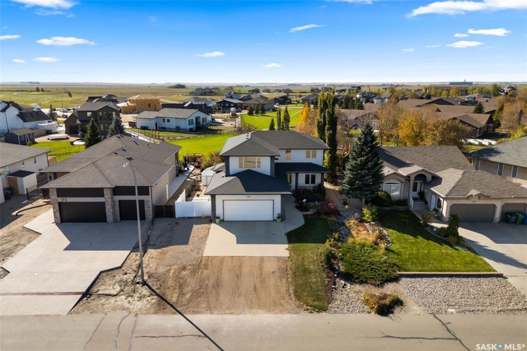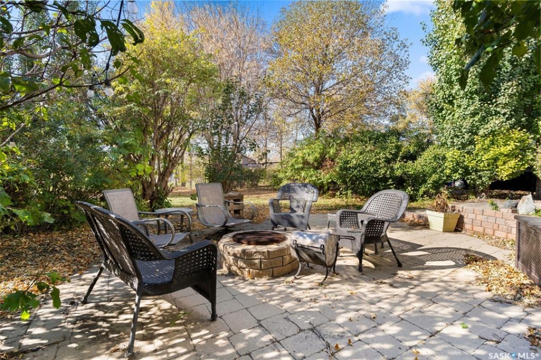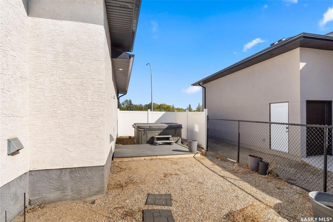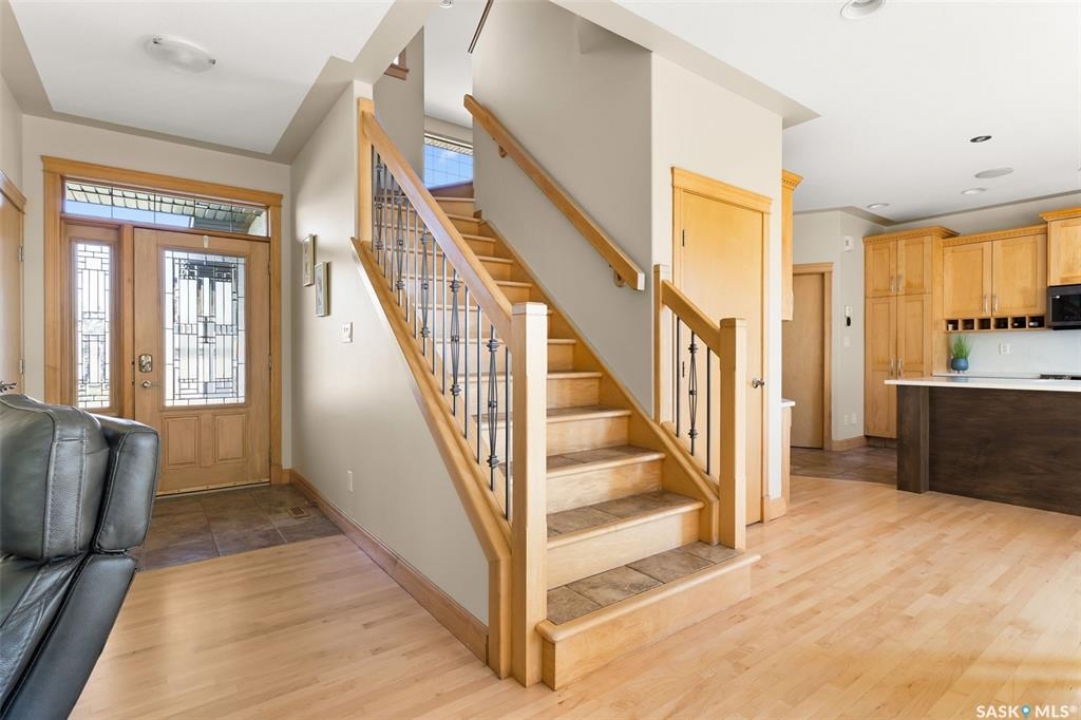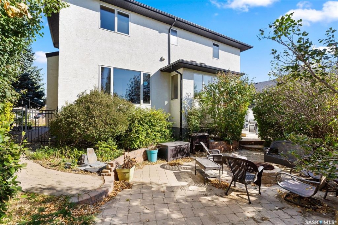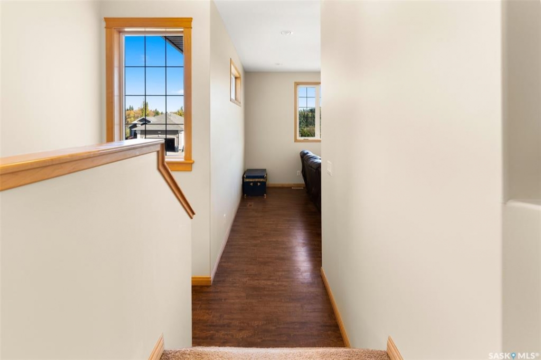 Gorgeous 2 story home in Emerald Park in prime location. Custom built home by Ripplinger Homes is nearly 2200 sq/ft and backs green space and southern exposure. Loads of natural light throughout. Welcoming entrance with ceramic tiled flooring transitions into maple hardwood floors. Main floor office is the perfect space for those who work from home. Spacious living room with natural gas fireplace with tiled accent and maple trim. There's an open view to the backyard thanks to a large picture window. Nice transition to the formal dining and kitchen area, upgraded kitchen island with quartz countertops ('24), stainless steel appliances and two piece bathroom. Main floor hardwood flooring was refinished in 2025. Direct entry to the 26 x 28 garage. Second level features 3 large bedrooms PLUS a bonus room that's the perfect media space. Walk-in closet in the primary bedroom and large ensuite. Basement is fully finished with additional bedroom and rec-room area and 3 piece bathroom. (current vanity will be changed out). Gorgeous and private backyard with mature trees, storage shed and hot tub included. Other recent upgrades include: shingles ('2018), new paint (2024), furnace ('23), c/air ('24). Move in ready family home is close to schools, shopping and Regina's east end amenities.