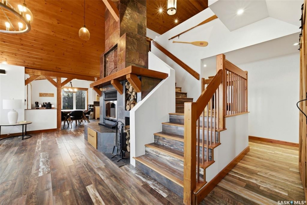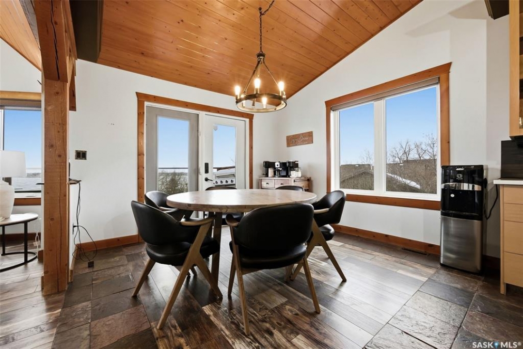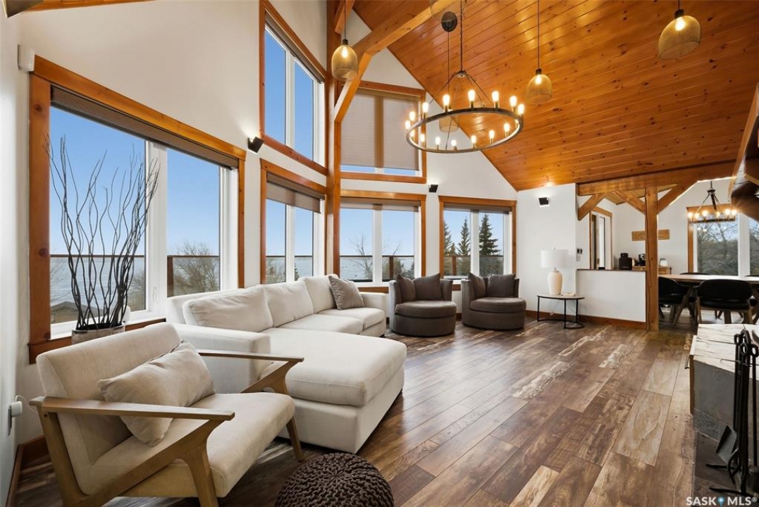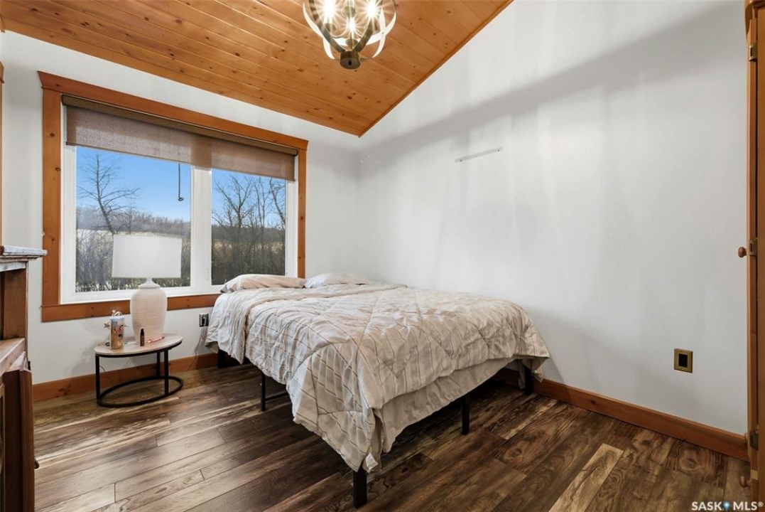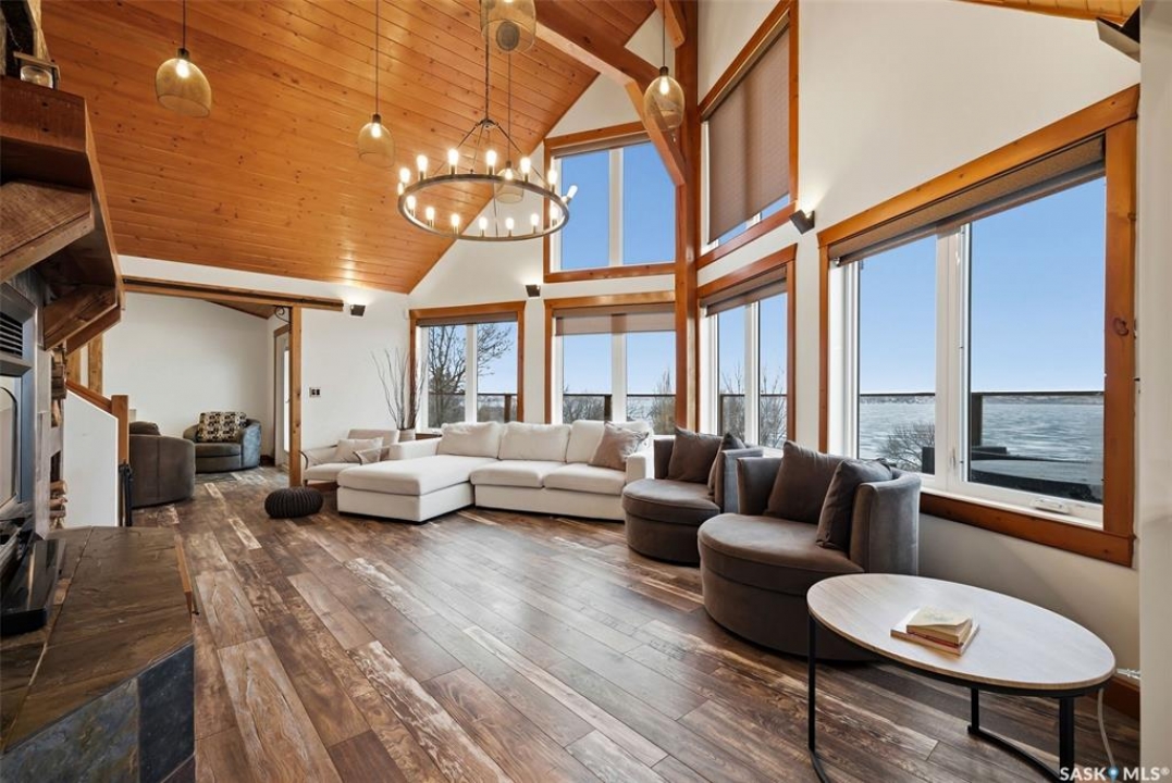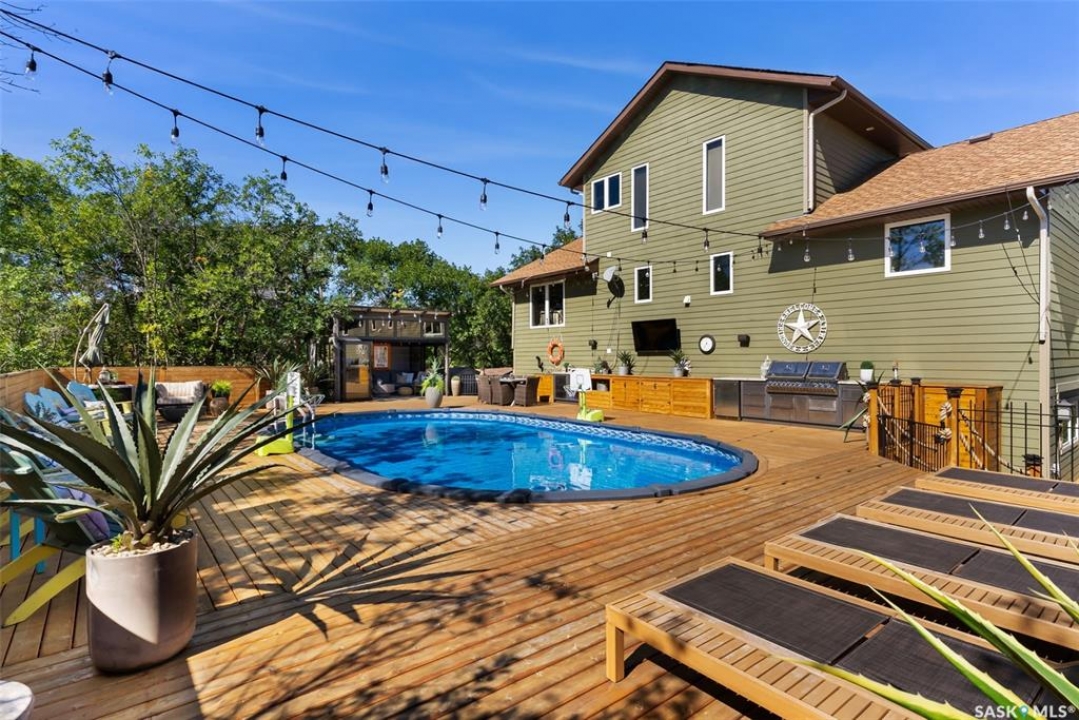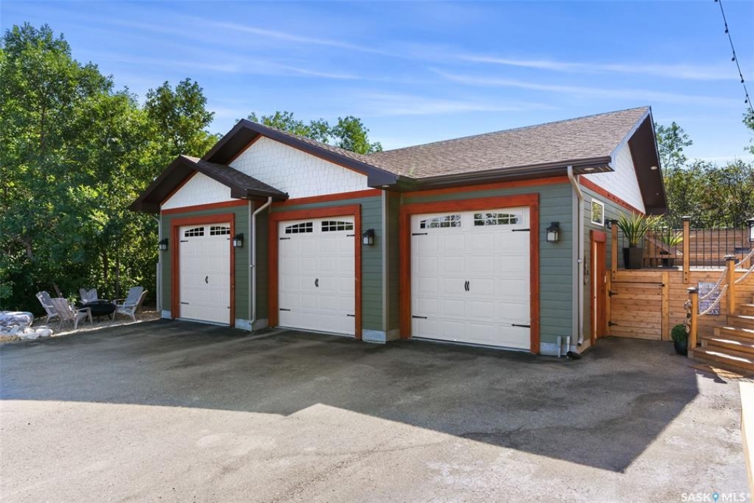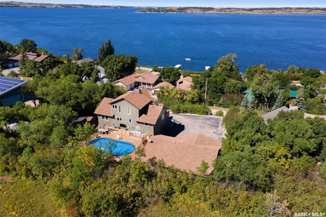 Don't miss this one-of-a-kind, private paradise in Kinookimaw with panoramic views of Last Mountain Lake. This property truly must be seen. Great room features prow front, knotty pine cathedral ceilings & recycled timber accent plus a wall of windows with lake views & wood burning fireplace. Open to the living area is a dining space with patio doors to the upper wrap around deck. Upgraded kitchen boasts light oak cabinetry, quartz countertops, fingerprint resistant slate appliances, subway tile backsplash & butlers pantry. There are 2 bedrooms on the main level, one has a seating area and patio doors to the 500 sqft upper deck. The upgraded 3 pc bath with clawfoot tub & laundry room complete the main level. On the 2nd floor is the primary suite with ample closet space with mirrored doors & a nook for reading. The 3 piece ensuite has a quartz topped vanity & tiled walk in shower. A wooden staircase leads down to the walkout basement, an entertainer's dream. Large seating area boasts a projector & screen with blackout power blinds plus games area and 3 pc bath. Patio doors lead to a lower deck with a putting green. Original garage has been converted into a side entrance on the lower level with a mudroom & extra space currently used as an office that could be converted to a 4th bedroom. Around the back of the home is a 33x18 above ground pool with 2000 sqft of cedar decking giving it the effect of an in-ground pool. Outdoor kitchen (2021) & 3 season Suncoast enclosure w/ electrical (2020) & added power retractable screen (value $21,000) complete this space. Triple detached garage w/ epoxy floor & floor drain, newer drive way & 2 storage sheds w/power are sure to hold all of your toys & vehicles. Spend your days floating in the pool & working on your golf game at this gorgeous property! Points to note: Access to & use of waterfront dock, deck & shed. Shingles on house, garage & sheds 2023. Downspouts on exterior of house & garage 2023. Septic tank pipe replaced 2023.