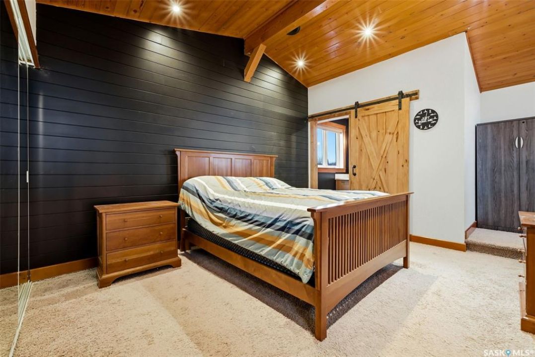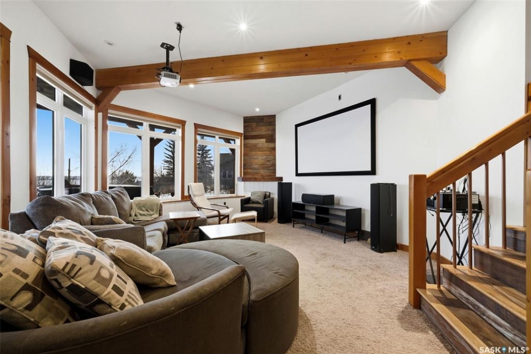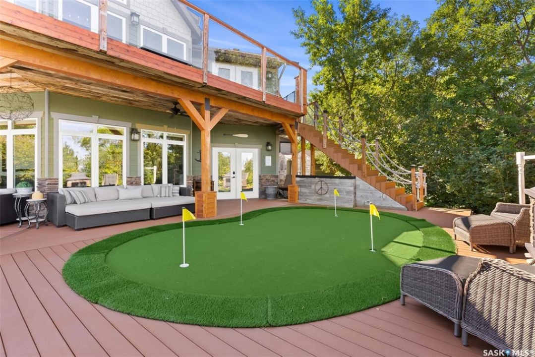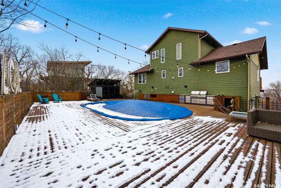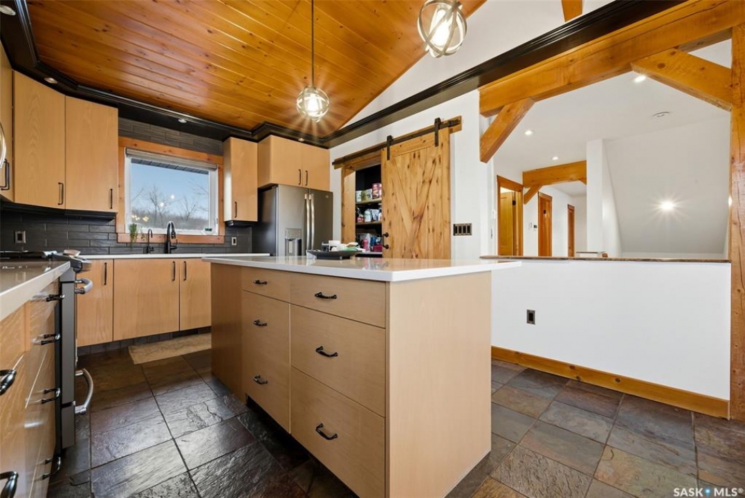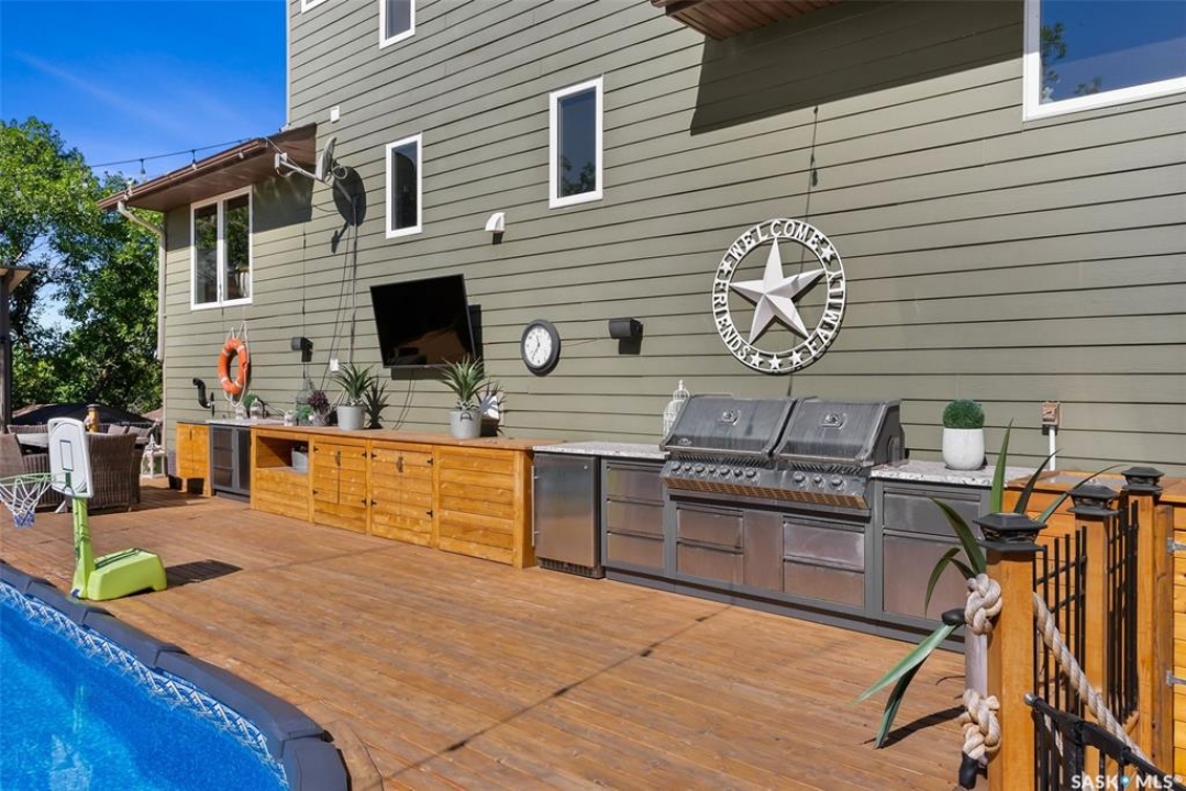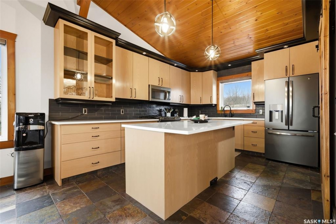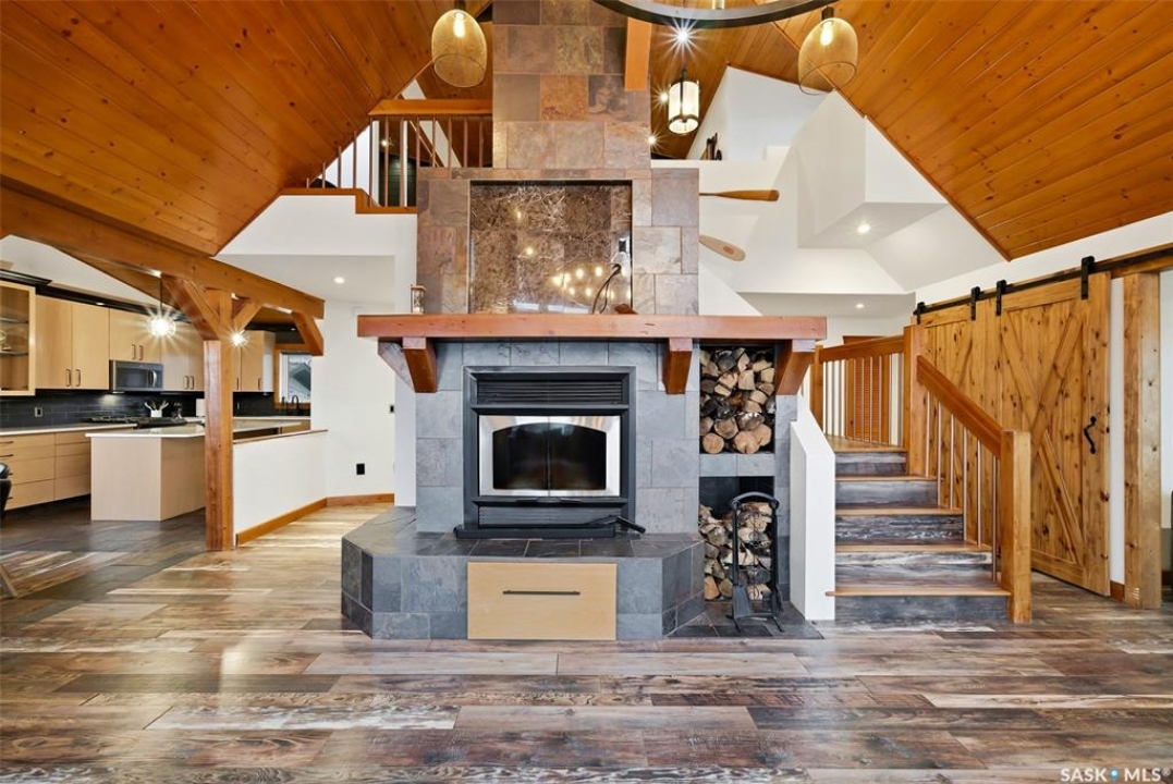 Don't miss this one-of-a-kind, private paradise in Kinookimaw with panoramic views of Last Mountain Lake. This property truly must be seen. Great room features prow front, knotty pine cathedral ceilings & recycled timber accent plus a wall of windows with lake views & wood burning fireplace. Open to the living area is a dining space with patio doors to the upper wrap around deck. Upgraded kitchen boasts light oak cabinetry, quartz countertops, fingerprint resistant slate appliances, subway tile backsplash & butlers pantry. There are 2 bedrooms on the main level, one has a seating area and patio doors to the 500 sqft upper deck. The upgraded 3 pc bath with clawfoot tub & laundry room complete the main level. On the 2nd floor is the primary suite with ample closet space with mirrored doors & a nook for reading. The 3 piece ensuite has a quartz topped vanity & tiled walk in shower. A wooden staircase leads down to the walkout basement, an entertainer's dream. Large seating area boasts a projector & screen with blackout power blinds plus games area and 3 pc bath. Patio doors lead to a lower deck with a putting green. Original garage has been converted into a side entrance on the lower level with a mudroom & extra space currently used as an office that could be converted to a 4th bedroom. Around the back of the home is a 33x18 above ground pool with 2000 sqft of cedar decking giving it the effect of an in-ground pool. Outdoor kitchen (2021) & 3 season Suncoast enclosure w/ electrical (2020) & added power retractable screen (value $21,000) complete this space. Triple detached garage w/ epoxy floor & floor drain, newer drive way & 2 storage sheds w/power are sure to hold all of your toys & vehicles. Spend your days floating in the pool & working on your golf game at this gorgeous property! Points to note: Access to & use of waterfront dock, deck & shed. Shingles on house, garage & sheds 2023. Downspouts on exterior of house & garage 2023. Septic tank pipe replaced 2023.