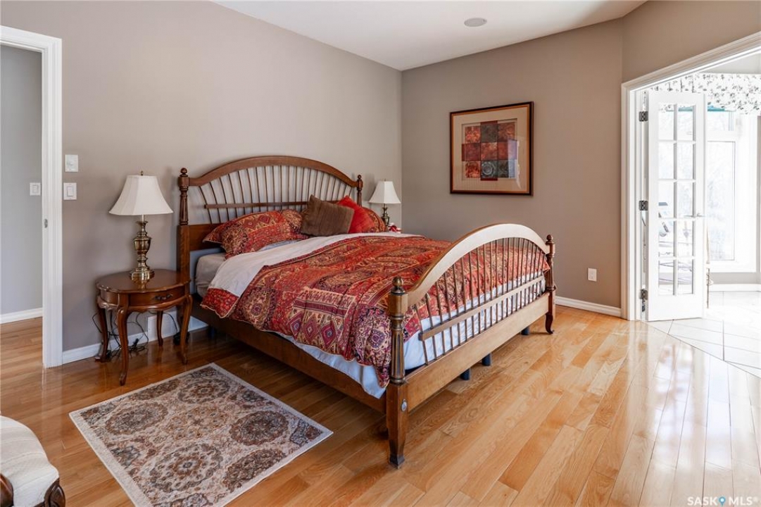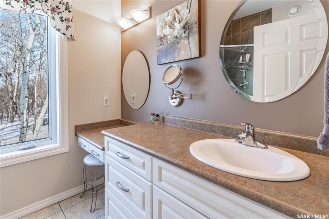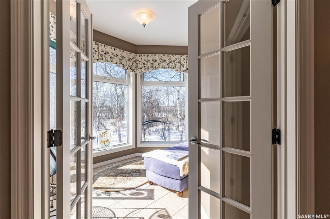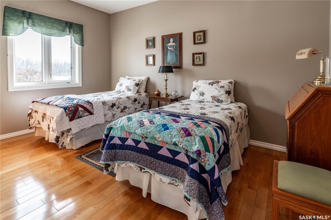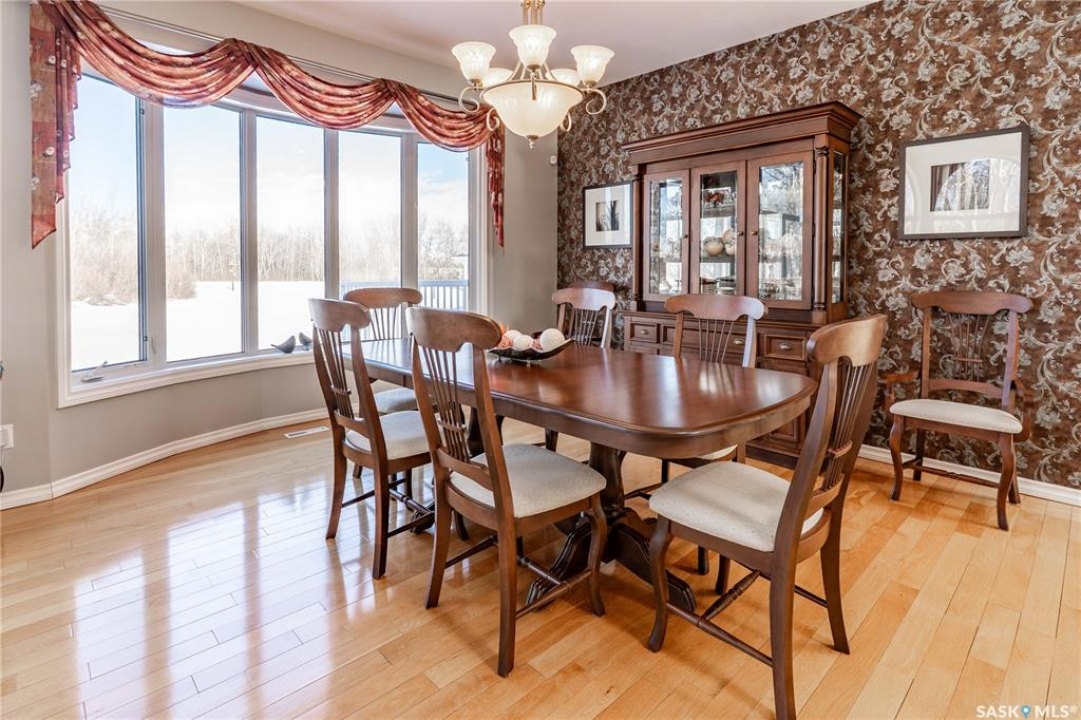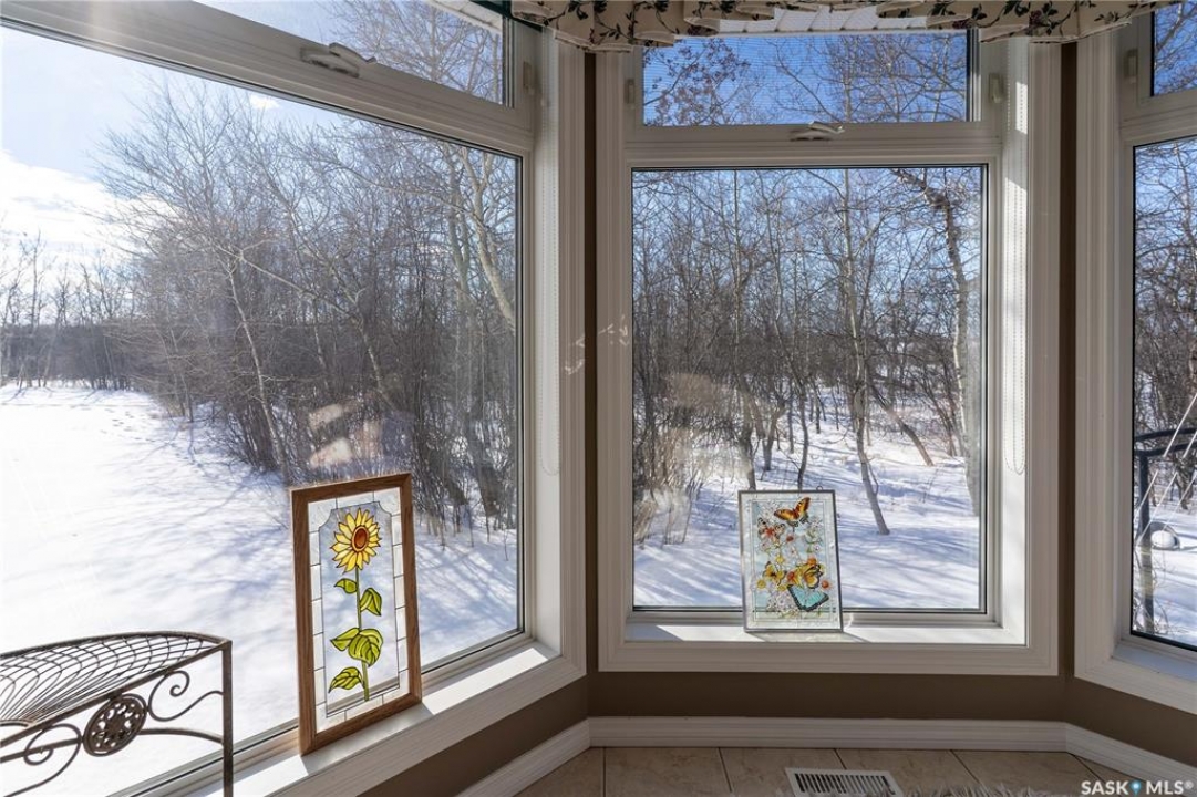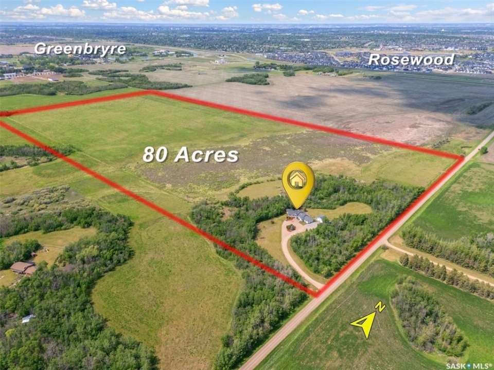 Welcome to The Meadow, 80 acres of pure serenity on the southeast doorstep of Saskatoon. This peaceful paradise offers the privacy and tranquility of country living, just minutes from Costco and Greenbryre Golf & Country Club. This sprawling, custom-built Ehrenburg bungalow is designed for comfort, beauty, and connection to the nature. The grand front entry welcomes you with soaring vaulted ceilings and a sweeping sense of space. The centerpiece of the great room is a stunning wood-burning fireplace, creating a warm, inviting atmosphere enhanced by floor-to-ceiling windows that frame breathtaking views of the wilderness waiting for you out your back door. White oak hardwood gleams throughout the main floor, paired with slate tile in the foyer and kitchen. The spacious kitchen features a large 8-foot granite island, gas stove, built in oven, ample cupboard space, and easy flow into a turret-shaped sun porch—perfect for morning coffee or sunny, lazy afternoons. This south-facing gem is flooded with natural light and designed to make the most of every season. The main floor also includes laundry, three well-appointed bathrooms, and three bedrooms. The primary bedroom offers a peaceful retreat, complete with a three-piece ensuite and a private turret-shaped sunroom for year-round quiet moments of rest and reflection. Additional features include a heated double attached garage and a wide single detached garage with shower and bathroom facilities—an ideal workshop with ample space for storage and tons of room for any project. The full basement is ready for your custom development, with in-floor heating lines already roughed in. Whether you're looking to raise a family, escape the city, or simply enjoy life in harmony with nature, The Meadow delivers the best of all worlds—privacy, space, and proximity to everything you need. Must be experienced to be fully appreciated. Call your favourite Realtor � to arrange a private viewing today!