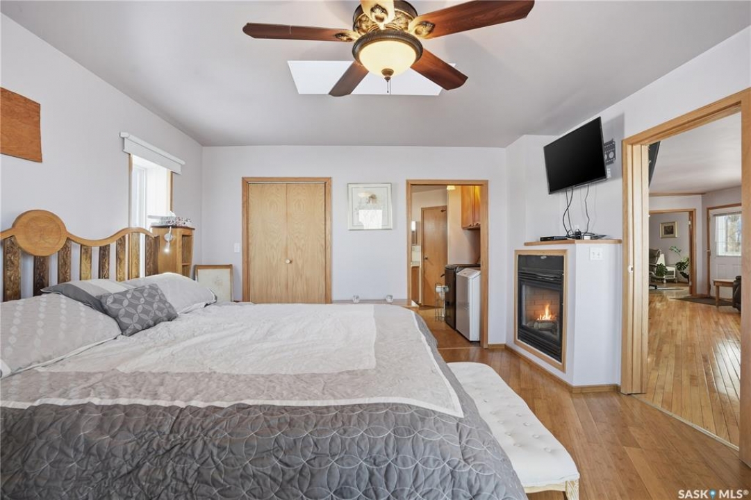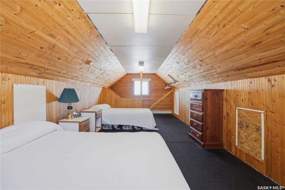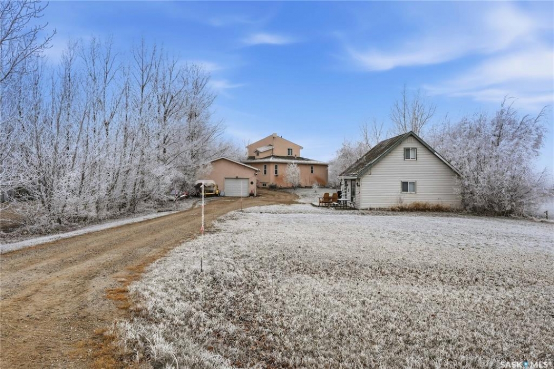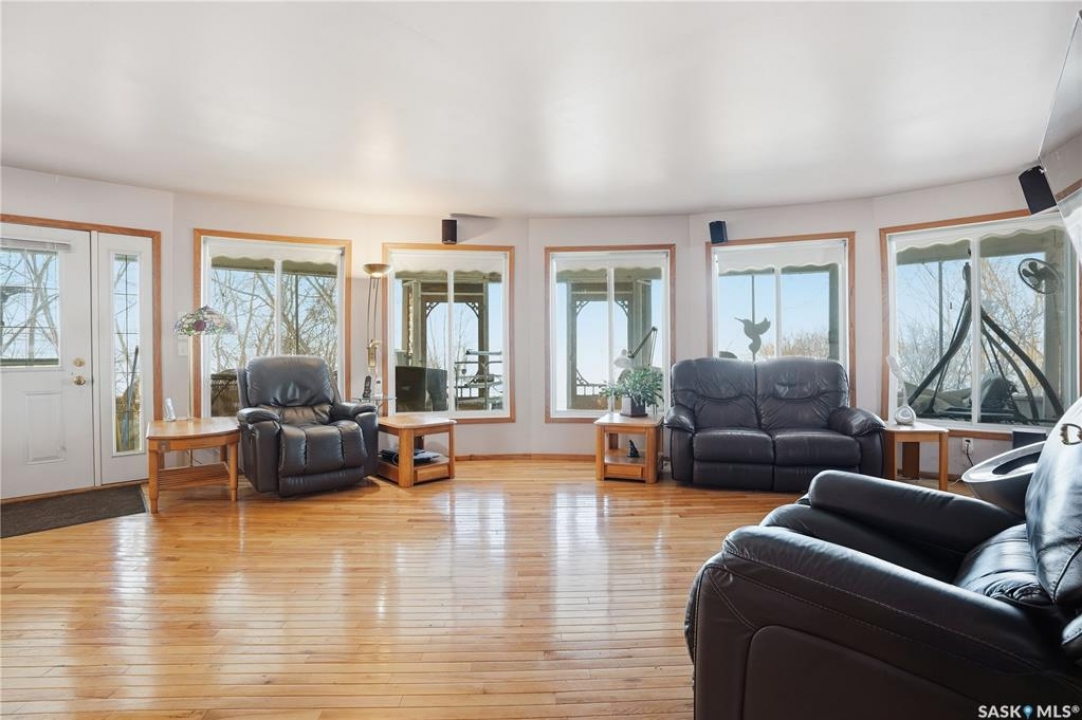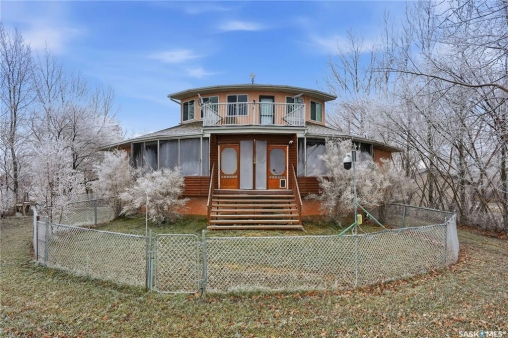 Experience the ultimate in lakeside living with this extraordinary four-season retreat, where architectural innovation meets breathtaking natural beauty. This unique 1 1/4 story home is defined by its striking panoramic arc, featuring a continuous span of large windows along the north and west elevations that frame stunning views of the water. This architectural masterpiece flows seamlessly through the den, living room, and master suite, while a massive 10-foot-wide covered and screened deck mirrors the curve outside, offering a protected sanctuary to enjoy the lake breeze and beach views. The main level welcomes you with a sun-drenched living room and a kitchen equipped with an abundance of cabinetry and pantry storage. This floor also hosts two spacious bedrooms, a flexible den, and a generous five-piece bathroom featuring a luxurious soaker tub with direct access from the master suite. For those seeking a quiet escape, the upstairs loft serves as a private sanctuary, complete with its own west-facing balcony—the perfect vantage point for watching the sunset. Built for longevity, the home features Insulated Concrete Form (ICF) construction for the full basement and main floor walls, providing superior energy efficiency. Comfort is guaranteed year-round with a gas boiler system providing cozy in-floor heat across all levels. The lower level offers immense potential, already featuring electrical and drywall work for two expansive recreation areas, an additional bedroom and funtional three piece bathroom. The expansive 22,000 sq. ft. lot offers incredible space for gardening and play, bordered by the lake and a public green space. This property also includes a separate guest house (appliances included), making it an ideal setup for visitors. Conveniently located just 15 minutes from K-12 schooling in Strasbourg and 25 minutes from Bulyea, this home is the perfect blend of robust construction and serene lakefront luxury.