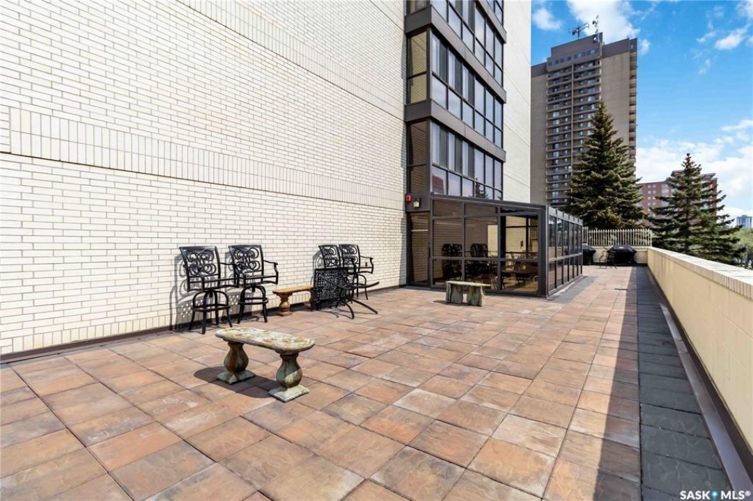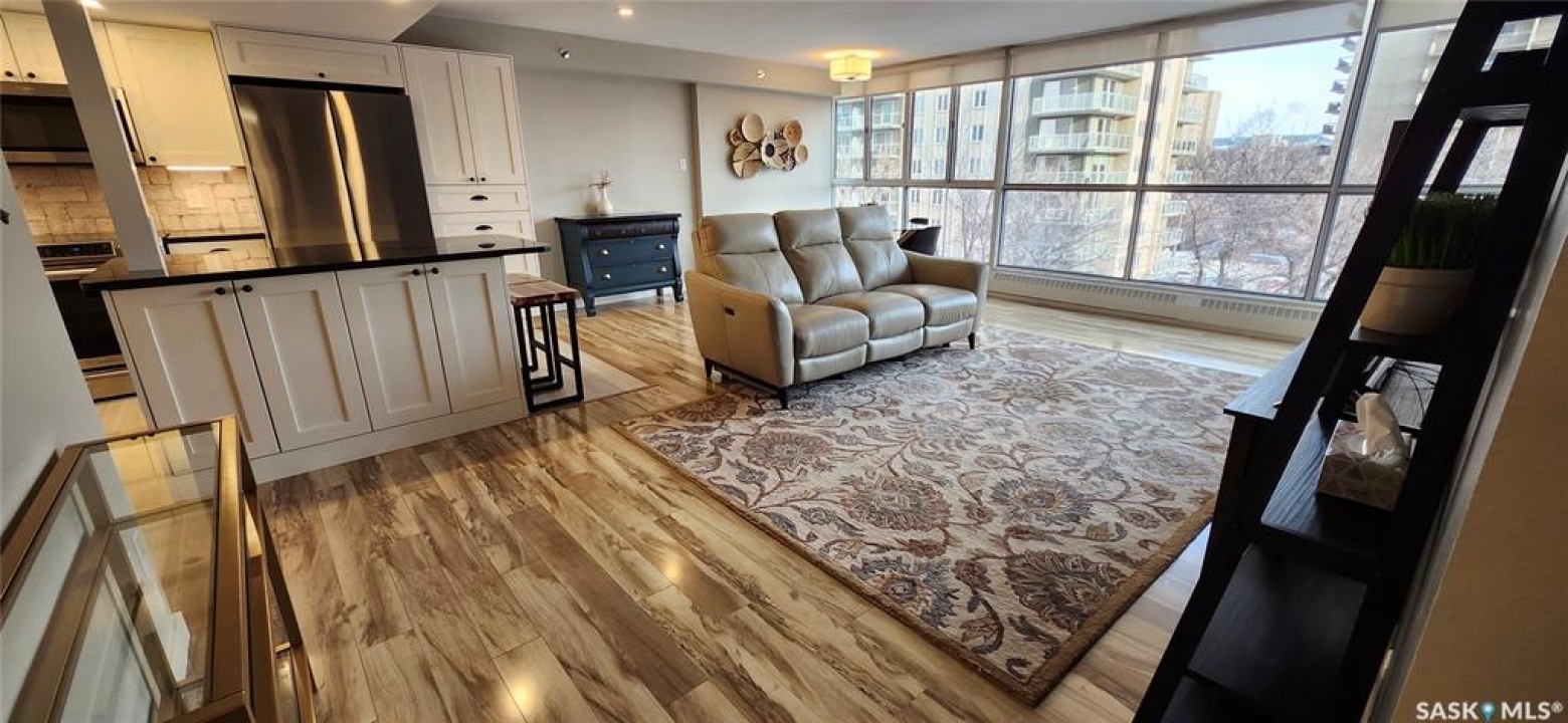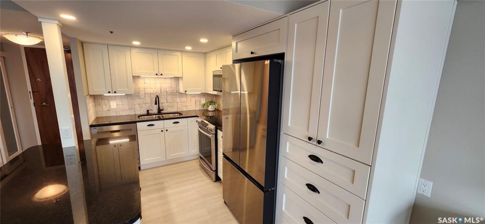 Convenient, luxurious downtown living in The Terrace condo building. Walk to the river, the U of S, & downtown amenities. This immaculate 2 bedroom / 2 bath 1076 sq ft condo is light and bright with a wall of floor to ceiling east facing windows. The new kitchen is sure to impress with quality white cabinetry, granite countertops, undermount double sinks, stainless steel appliances, updated lighting, and a huge island for food prep or entertaining. Attention paid throughout with customized closets, pantry, and storage room to maximize storage space. Boiler & forced air heat & central air conditioning keep you comfortable. Indoor heated parking. The Terrace building amenities include a swimming pool, hot tub, sauna, 4th floor community room & outdoor patio/BBQ area, a guest suite + a roof top patio for 22nd floor panoramic views. This unit and building are definitely worth a look!