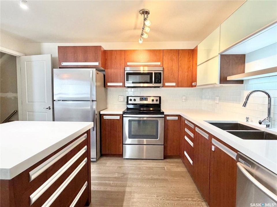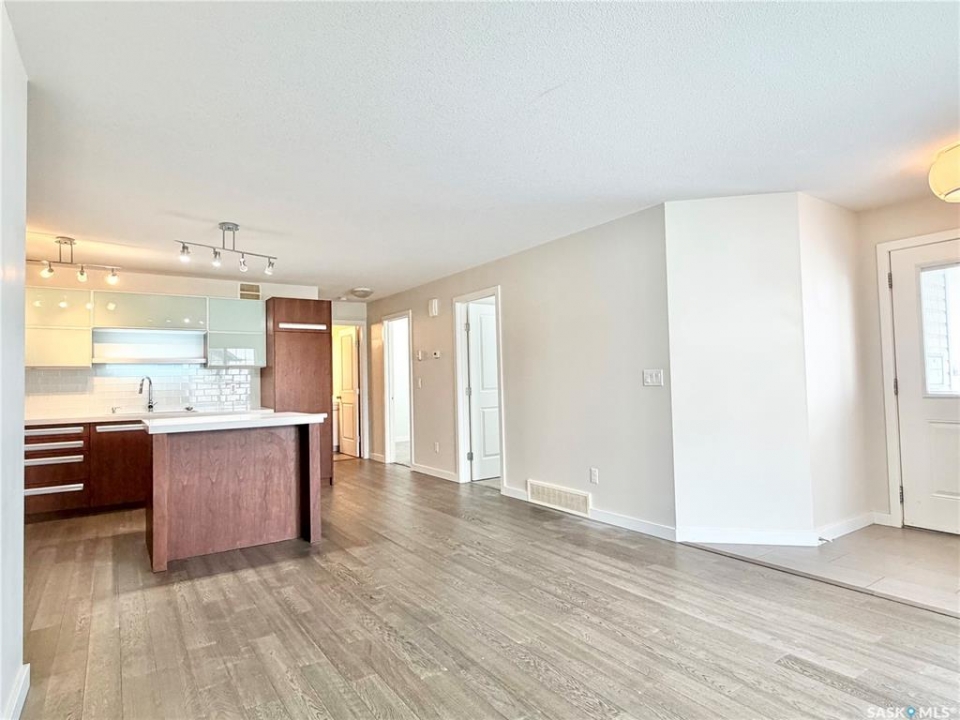 Arguably the best location in the Ginger Lofts complex, this 910 sq. ft. main-floor bungalow townhouse is ideally positioned at the very end of the development, offering outstanding privacy and unobstructed views overlooking U of S farmland. Set well away from internal traffic, the setting is quiet, peaceful, and highly desirable. The home features newer flooring throughout, including oak engineered hardwood in the living room and kitchen/dining area, with carpet in both bedrooms. The kitchen is finished with quartz counter tops, a glass tile back splash, upgraded stainless steel appliances, and a pantry with pull-out shelving. Convenient in-suite laundry is located next to the four-piece bathroom. The full basement is open and ready for future development. A rare bonus, this unit includes two parking stalls. Residents enjoy access to an excellent clubhouse with an indoor saltwater pool, hot tub, games room, and fitness center. Call today!