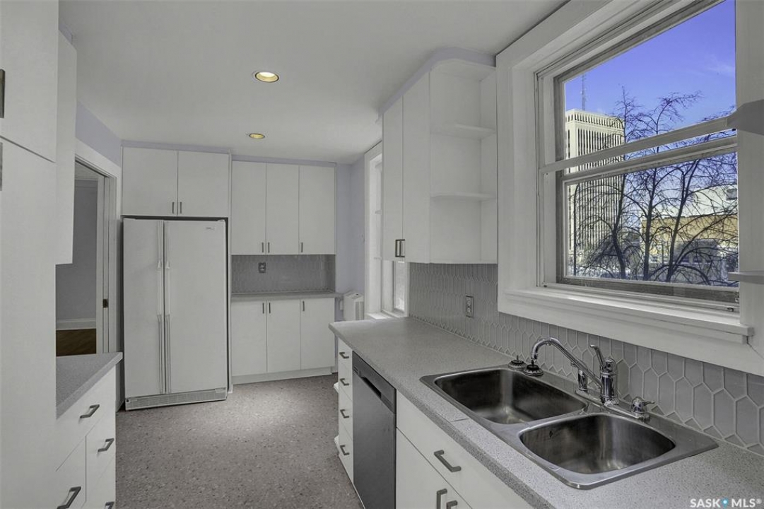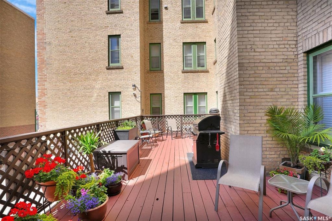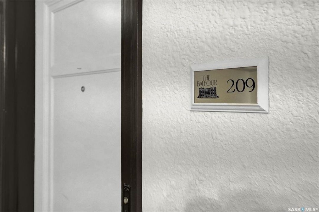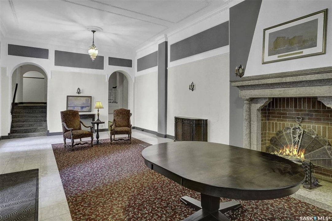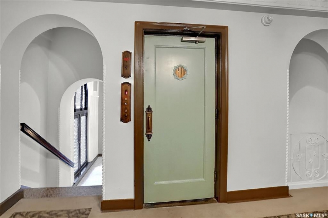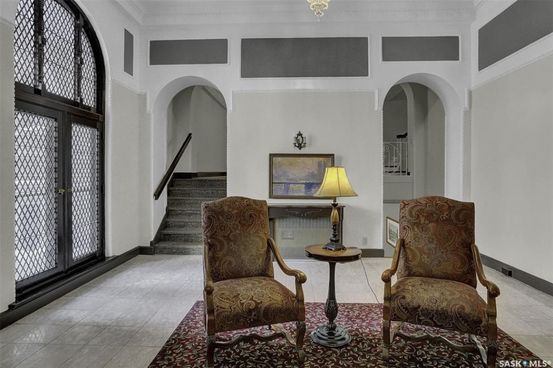 Discover timeless elegance in this well appointed 2-bedroom, 2 bathroom condo in the iconic Balfour Building—one of Regina's most historic residences. The building entrance welcomes you w/ beautiful stonework & wrought-iron gates. A charming foyer w seating sets the tone for the building's warm, heritage character. The circa 1929 elevators have been restored: preserving nostalgic charm & offering modern convenience. Inside the suite, a front entry display area & closet/ storage space greet you w/ hardwood flooring that enhances the natural elegance felt throughout. The versatile floor plan offers various furniture arrangements. Off this space is the living room w/ lots of natural light, picture rails & a wall of custom built-ins w/ lighting for displays & storage. The bright, white kitchen provides lots of custom cabinetry, pull-out pantry storage, built-in dishwasher, tiled backsplash, window & pocket style sliding French doors. The primary bedroom includes a “rare find” 3/4 ensuite & second bedroom has 2 closets . Bright freshly painted interior including main bathroom. This unit shares front balcony space w/ a nice view of downtown & Victoria Park. Throughout the building, you find seating areas perfect for visiting. A spacious lounge, complete w/ kitchenette, opens to a common outdoor deck w/ bbq area. Shared laundry facilities in basement are bright, clean, & well-maintained. Residents also enjoy convenient bike storage & well-lit storage locker. area. This unit comes w/ 2 storage lockers. Included are the fridge, stove(Nov. 2025) built-in dishwasher(July 2024) safe & standalone air conditioning unit. Condo fees $681.21 per month include heat, water, sewer, common area maintenance, common area insurance, snow removal, lawn care & reserve fund. AI-generated pictures at end. The Balfour has long been celebrated for its beauty, uniqueness, & enduring quality that has stood the test of time. This could be your opportunity to be part of its story.