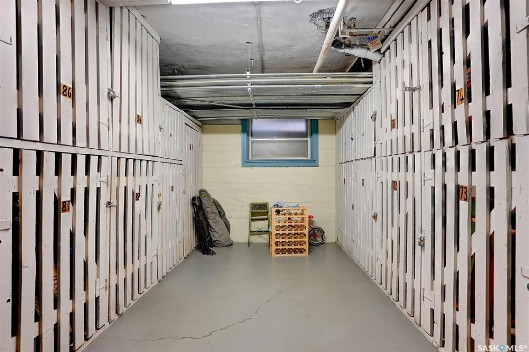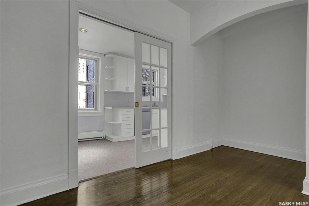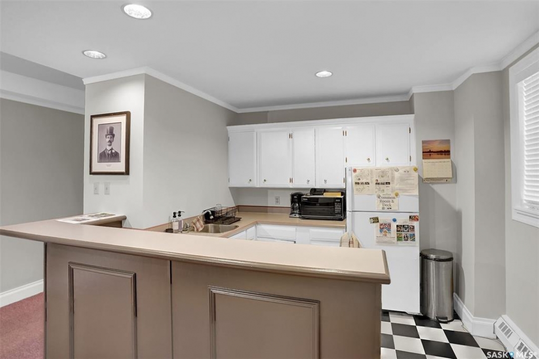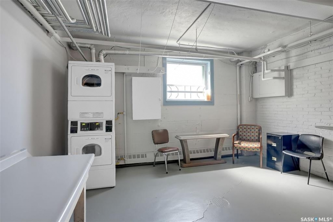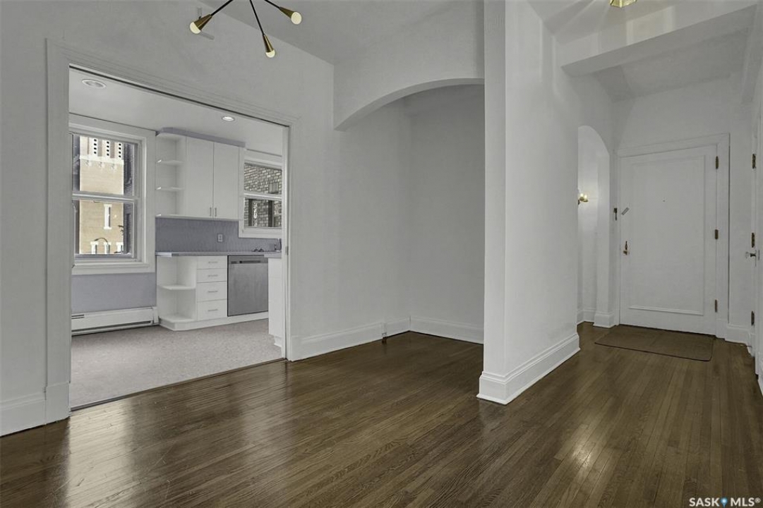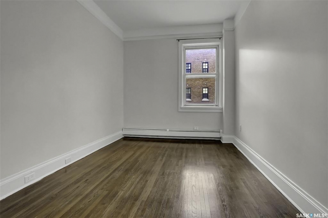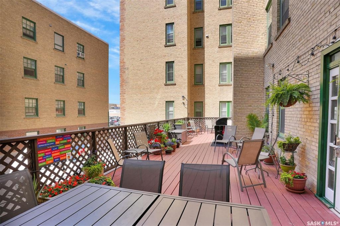 Discover timeless elegance in this well appointed 2-bedroom, 2 bathroom condo in the iconic Balfour Building—one of Regina's most historic residences. The building entrance welcomes you w/ beautiful stonework & wrought-iron gates. A charming foyer w seating sets the tone for the building's warm, heritage character. The circa 1929 elevators have been restored: preserving nostalgic charm & offering modern convenience. Inside the suite, a front entry display area & closet/ storage space greet you w/ hardwood flooring that enhances the natural elegance felt throughout. The versatile floor plan offers various furniture arrangements. Off this space is the living room w/ lots of natural light, picture rails & a wall of custom built-ins w/ lighting for displays & storage. The bright, white kitchen provides lots of custom cabinetry, pull-out pantry storage, built-in dishwasher, tiled backsplash, window & pocket style sliding French doors. The primary bedroom includes a “rare find” 3/4 ensuite & second bedroom has 2 closets . Bright freshly painted interior including main bathroom. This unit shares front balcony space w/ a nice view of downtown & Victoria Park. Throughout the building, you find seating areas perfect for visiting. A spacious lounge, complete w/ kitchenette, opens to a common outdoor deck w/ bbq area. Shared laundry facilities in basement are bright, clean, & well-maintained. Residents also enjoy convenient bike storage & well-lit storage locker. area. This unit comes w/ 2 storage lockers. Included are the fridge, stove(Nov. 2025) built-in dishwasher(July 2024) safe & standalone air conditioning unit. Condo fees $681.21 per month include heat, water, sewer, common area maintenance, common area insurance, snow removal, lawn care & reserve fund. AI-generated pictures at end. The Balfour has long been celebrated for its beauty, uniqueness, & enduring quality that has stood the test of time. This could be your opportunity to be part of its story.