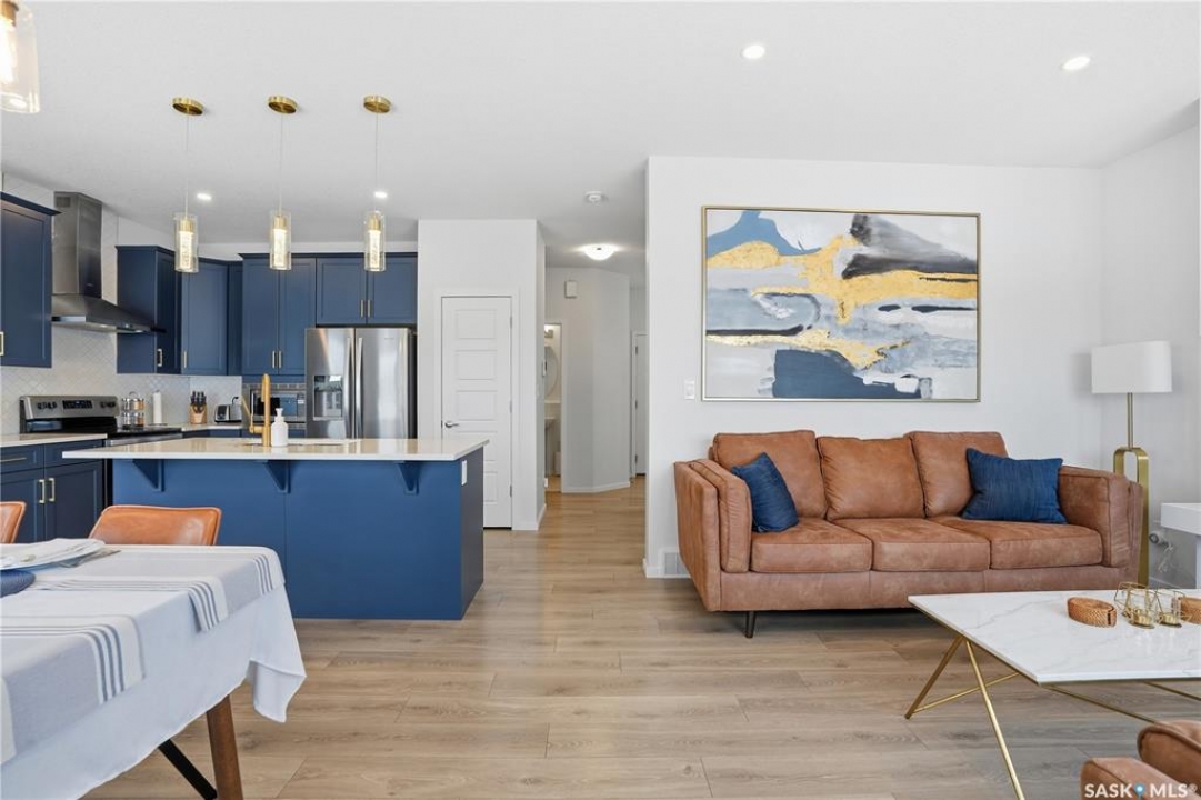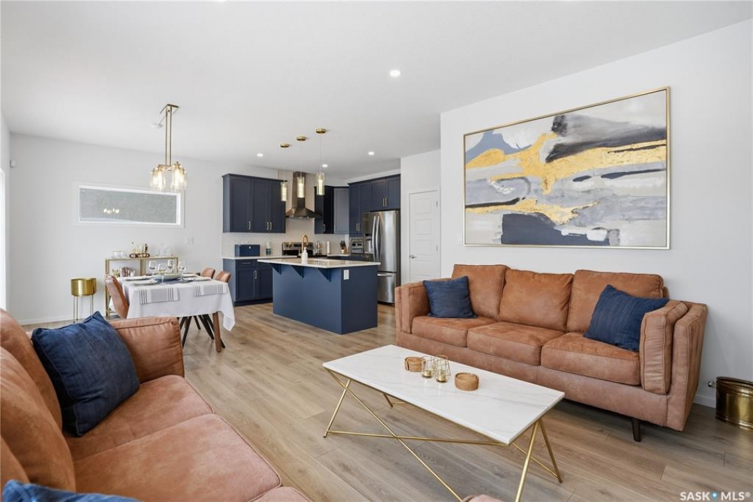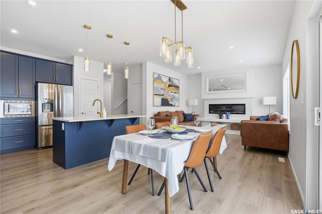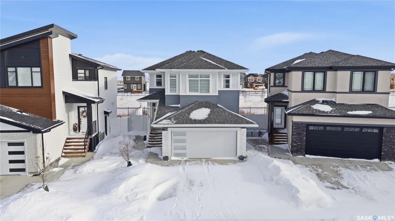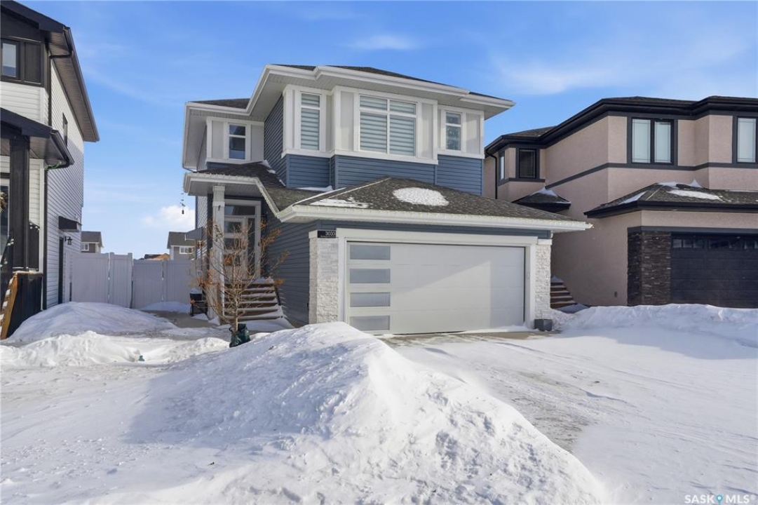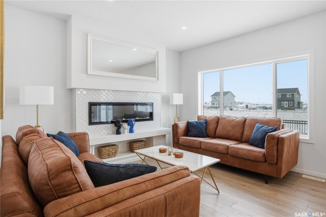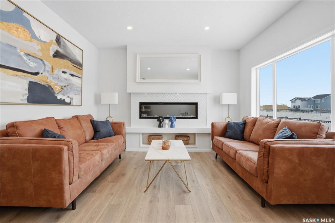 Located on a quiet crescent in East Regina's desirable Eastbrook neighbourhood, this beautiful two-storey home backs directly onto green space, offering privacy, peaceful views, and one of the area's most sought-after floor plans. A spacious front entry welcomes you into a bright, open-concept main floor flooded with natural light from large windows throughout. Designed for both entertaining and everyday living, the kitchen features quartz countertops, stainless steel appliances, a large island, and abundant cabinetry, flowing seamlessly into the dining area with patio doors leading to the backyard. The living room is centred around a modern electric fireplace, creating a warm and inviting focal point. A versatile main-floor office or flex space, convenient half bath, and direct access from the double attached garage complete this level. Upstairs offers a generous bonus room, two well-sized bedrooms, second-floor laundry, a full bathroom, and a spacious primary retreat with a walk-in closet and an ensuite with a shower and double sinks. The fully finished basement includes a beautiful one-bedroom legal suite with its own kitchen, laundry, and private entrance, providing excellent flexibility for extended family living or rental income as a mortgage helper. Additional highlights include 9' ceilings on the main floor, laminate flooring throughout main living areas, tile in all wet spaces, upgraded stair railings with metal spindles, a gold kitchen faucet and cabinet handles, rear deck with skirting, and fully fenced and landscaped yard. Backing naturalized green space and located in a quiet, family-friendly setting, this home offers exceptional value, versatility, and long-term potential. (Some furniture are negotiable)