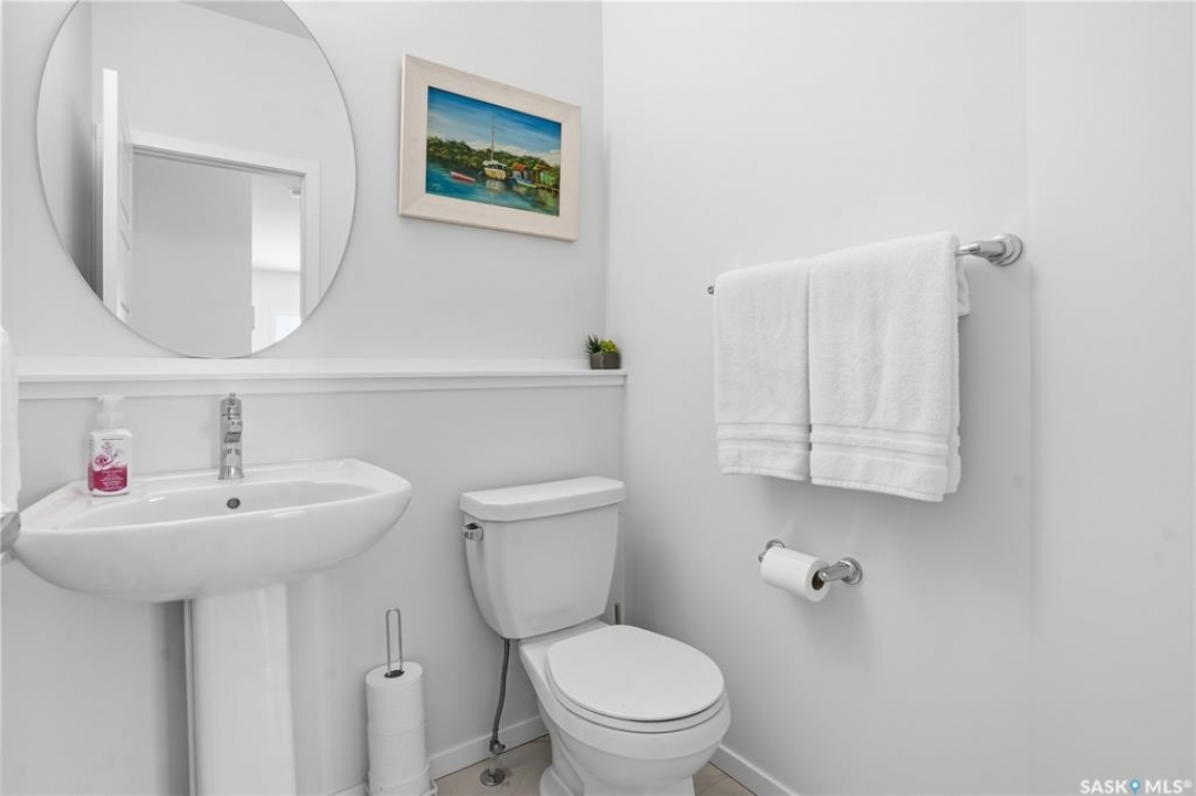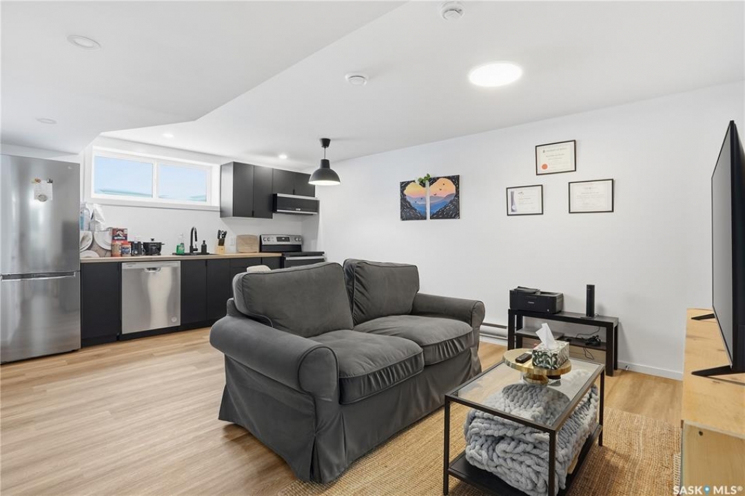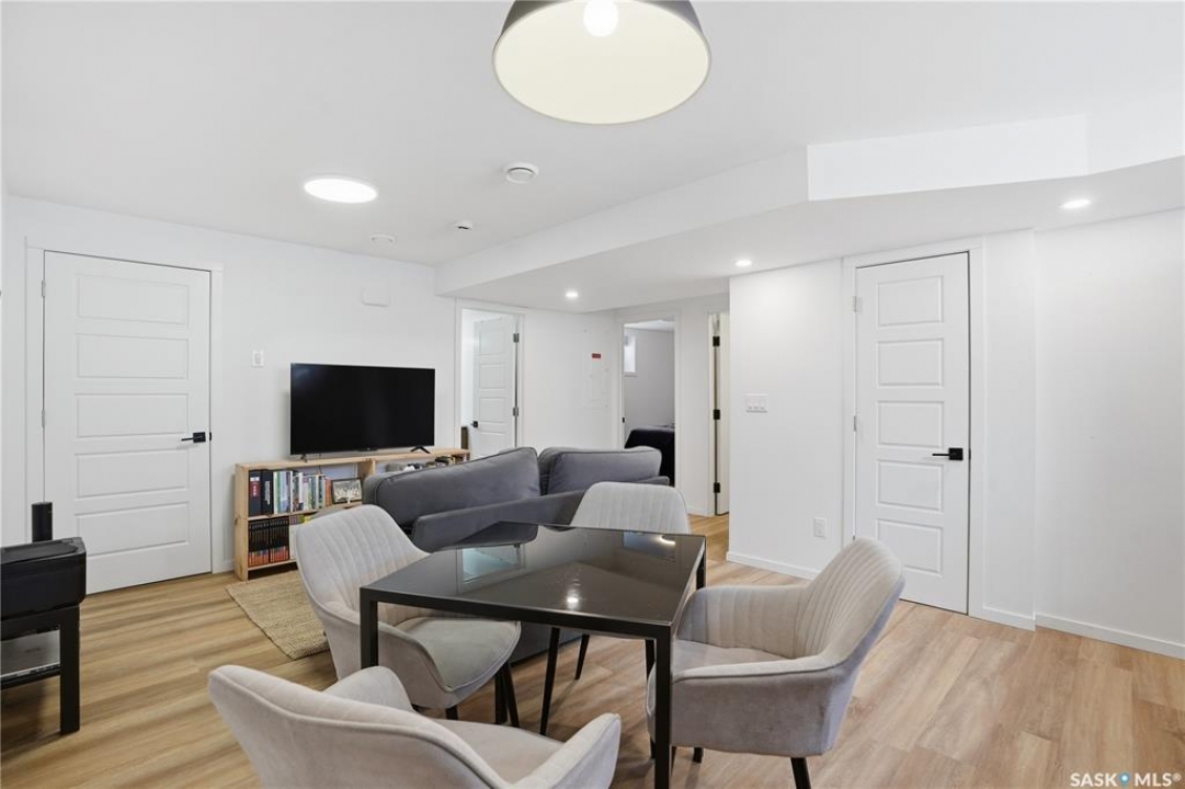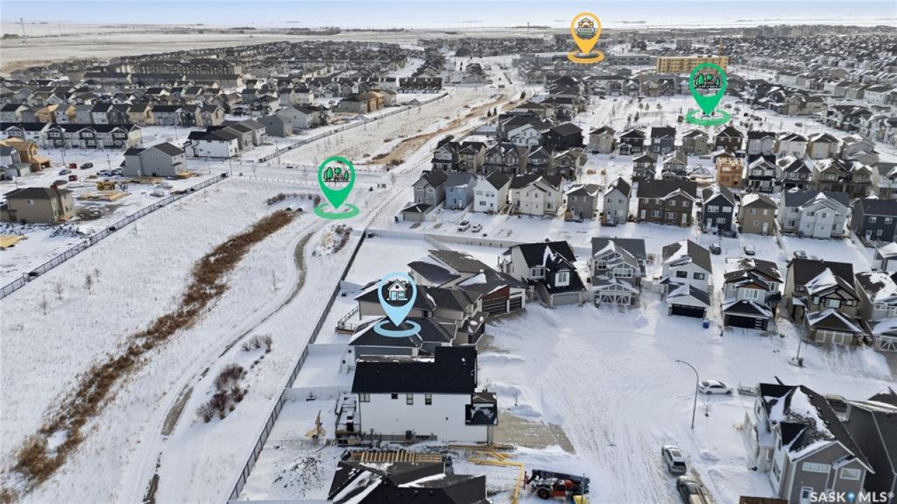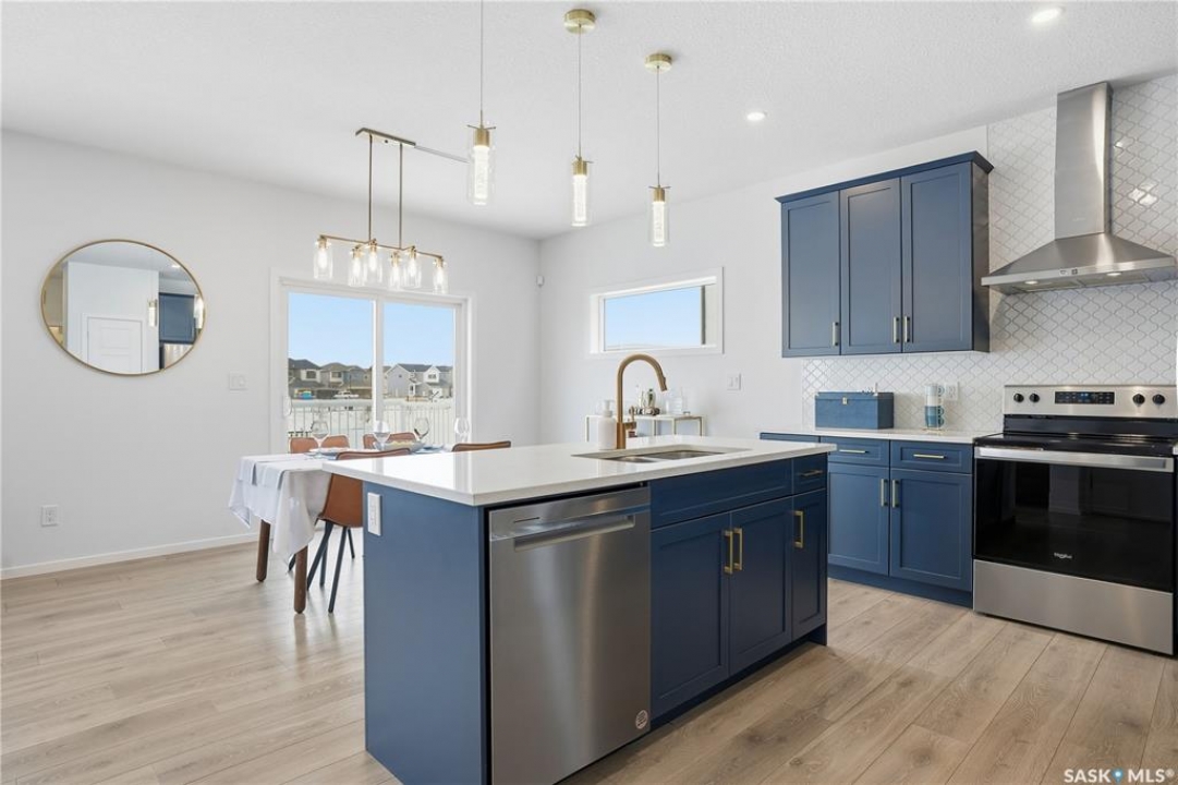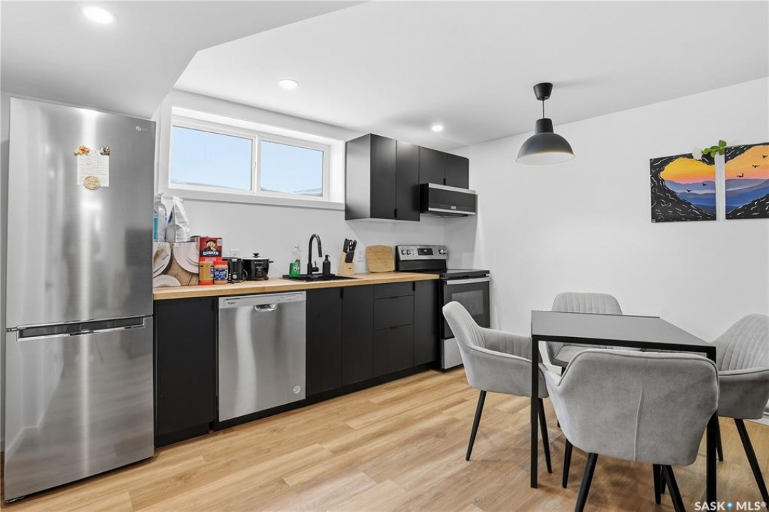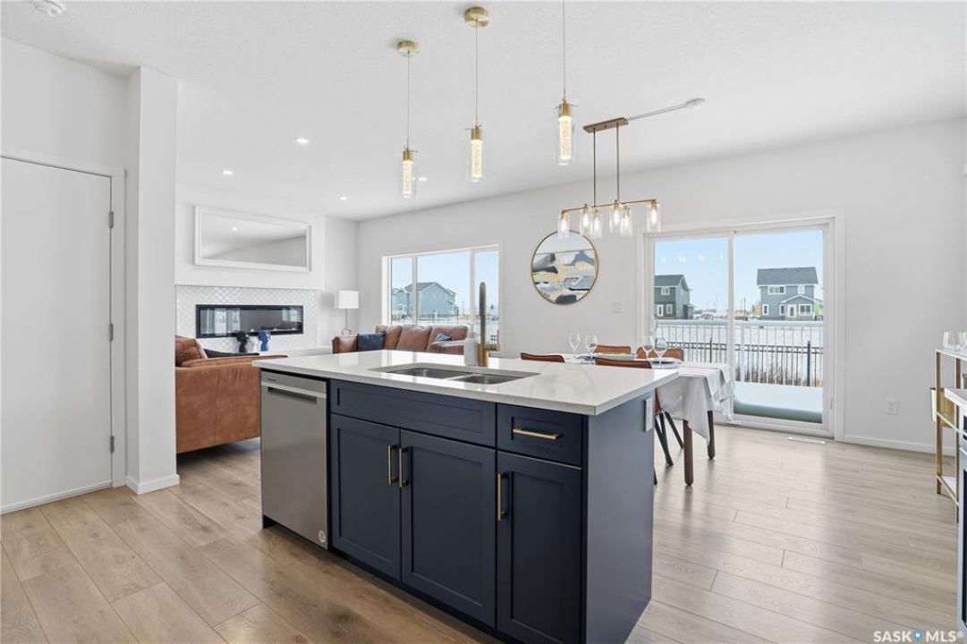Located on a quiet crescent in East Regina's desirable Eastbrook neighbourhood, this beautiful two-storey home backs directly onto green space, offering privacy, peaceful views, and one of the area's most sought-after floor plans. A spacious front entry welcomes you into a bright, open-concept main floor flooded with natural light from large windows throughout. Designed for both entertaining and everyday living, the kitchen features quartz countertops, stainless steel appliances, a large island, and abundant cabinetry, flowing seamlessly into the dining area with patio doors leading to the backyard. The living room is centred around a modern electric fireplace, creating a warm and inviting focal point. A versatile main-floor office or flex space, convenient half bath, and direct access from the double attached garage complete this level. Upstairs offers a generous bonus room, two well-sized bedrooms, second-floor laundry, a full bathroom, and a spacious primary retreat with a walk-in closet and an ensuite with a shower and double sinks. The fully finished basement includes a beautiful one-bedroom legal suite with its own kitchen, laundry, and private entrance, providing excellent flexibility for extended family living or rental income as a mortgage helper. Additional highlights include 9' ceilings on the main floor, laminate flooring throughout main living areas, tile in all wet spaces, upgraded stair railings with metal spindles, a gold kitchen faucet and cabinet handles, rear deck with skirting, and fully fenced and landscaped yard. Backing naturalized green space and located in a quiet, family-friendly setting, this home offers exceptional value, versatility, and long-term potential. (Some furniture are negotiable)