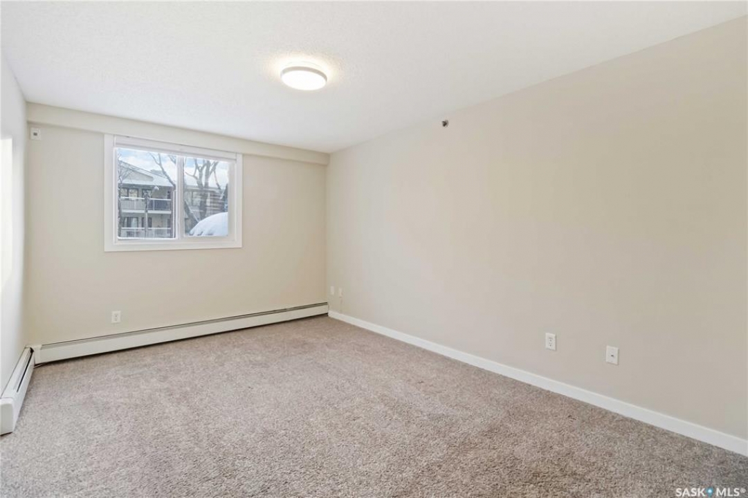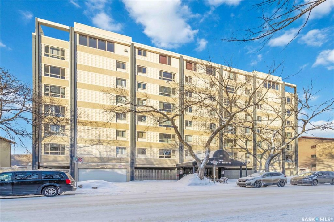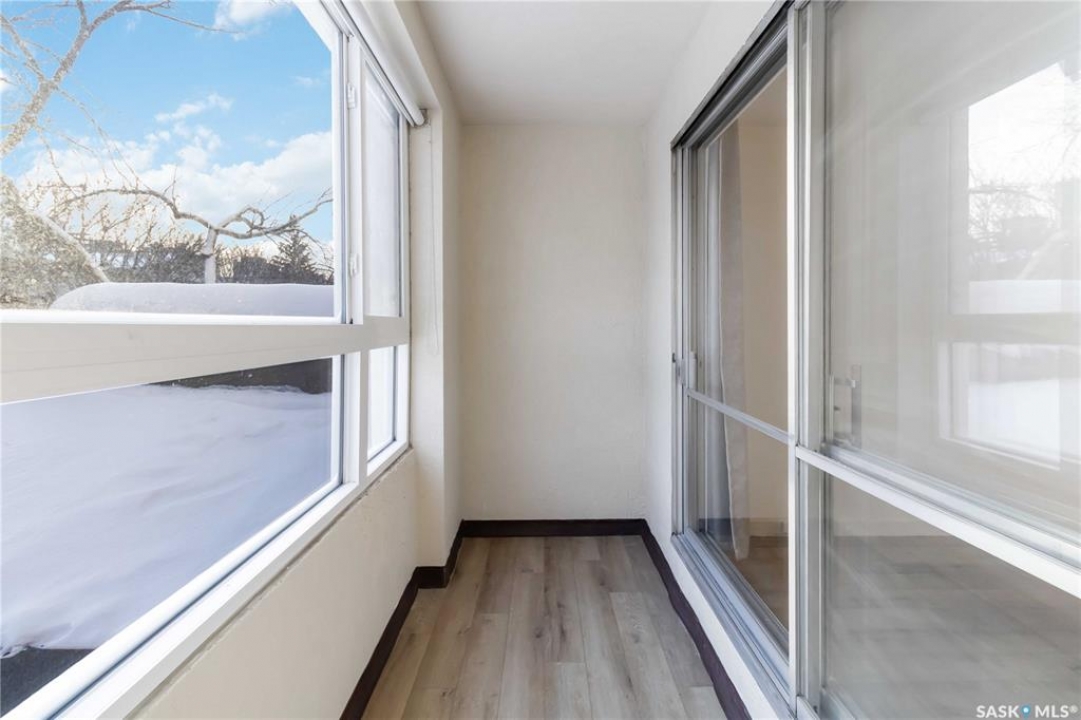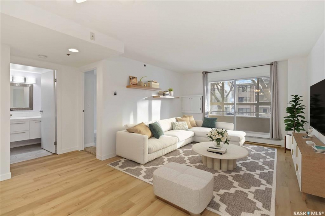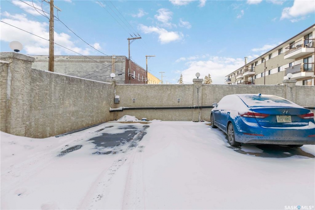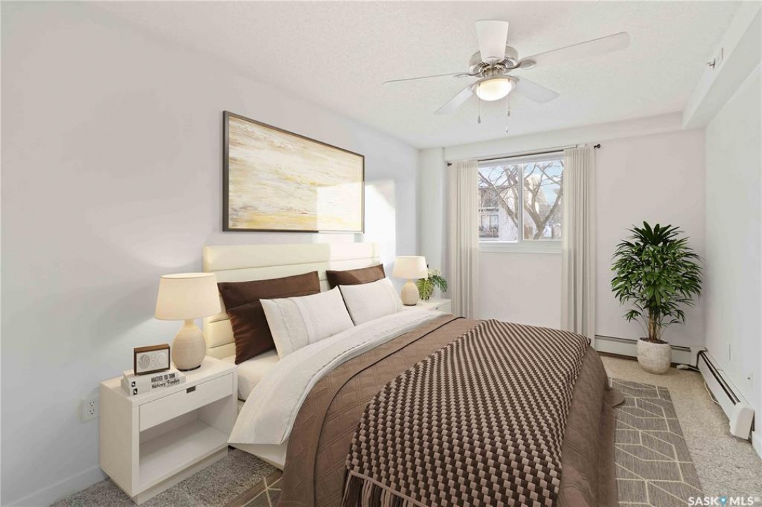 Spacious 990 sq. ft. two bedroom, two bathroom condominium apartment in the desirable City Park area. Generous primary bedroom with a renovated 3 piece ensuite and a second bedroom for a roommate or family member with a renovated 4 piece bathroom just down the hall. The kitchen boasts an island with a dining room/area. Laundry room with washer and dryer (2021) with storage area. All three exterior windows replaced new in (2024). Air Conditioner (2025) New vinyl plank flooring in (2026). Sun Room just off the living room for those bright summer days. One electrified parking spot included in behind the garage door for your security. Amenities room is on the same floor down the hallway for your use to have large groups over. There is also a roof top patio for entertaining friends or to have some downtime taking a view of the city. The City Park area is perfect for accessing downtown amenities, mere foot steps from City Hospital, Kinsmen Park, walking distance to the University of Saskatchewan, or some beautiful walks down by the South Saskatchewan River. Unique to the Building is the 1st floor elevated approximately 10 feet above ground level. NOTE: Bedrooms and Living Room are virtually staged. Give your REALTOR � a call today to view this beautiful property.