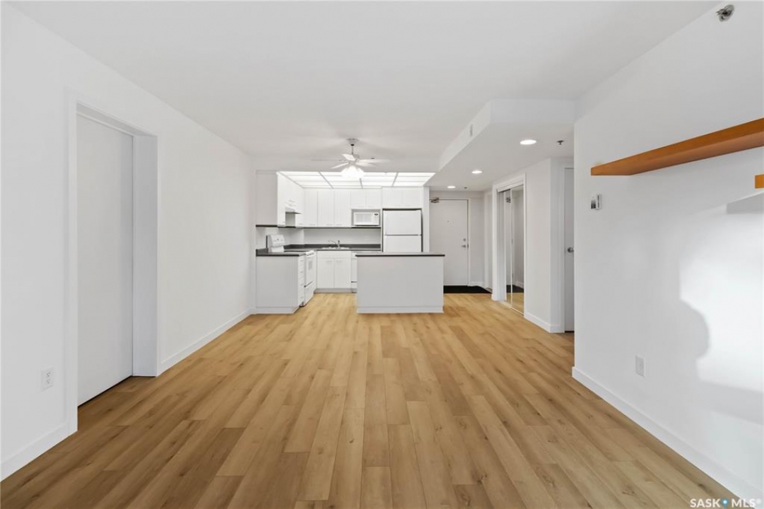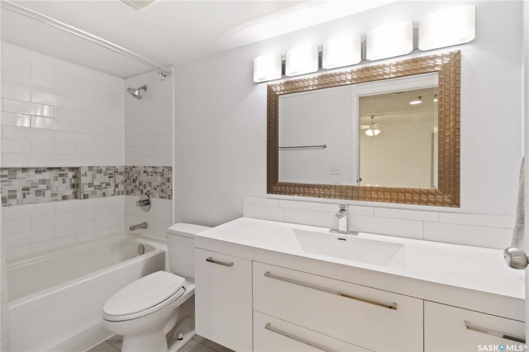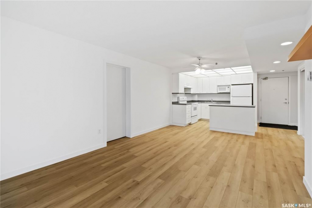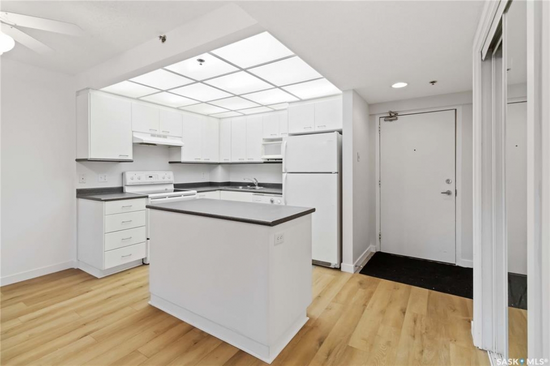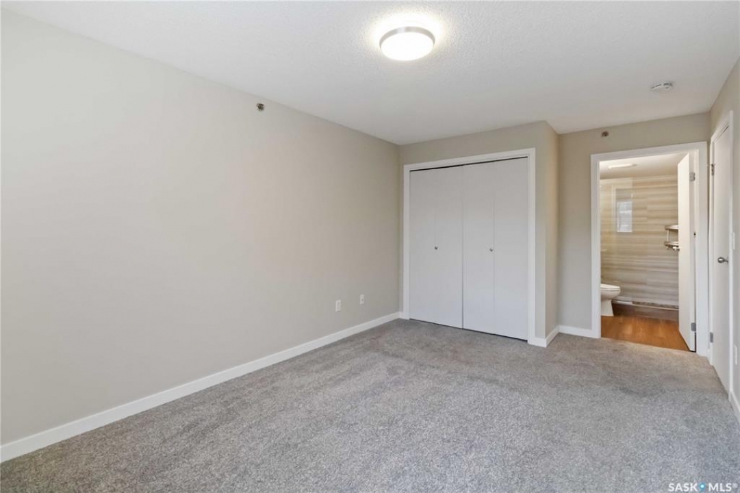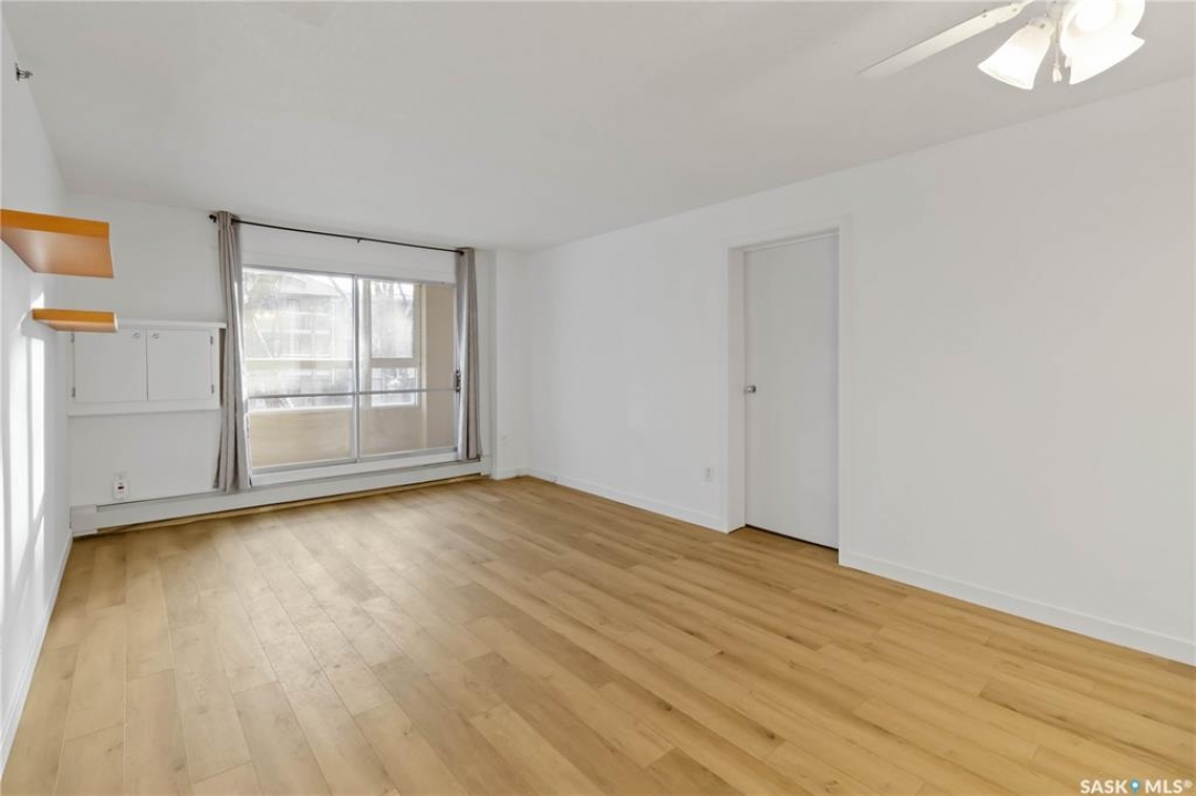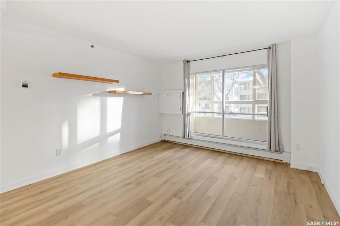 Spacious 990 sq. ft. two bedroom, two bathroom condominium apartment in the desirable City Park area. Generous primary bedroom with a renovated 3 piece ensuite and a second bedroom for a roommate or family member with a renovated 4 piece bathroom just down the hall. The kitchen boasts an island with a dining room/area. Laundry room with washer and dryer (2021) with storage area. All three exterior windows replaced new in (2024). Air Conditioner (2025) New vinyl plank flooring in (2026). Sun Room just off the living room for those bright summer days. One electrified parking spot included in behind the garage door for your security. Amenities room is on the same floor down the hallway for your use to have large groups over. There is also a roof top patio for entertaining friends or to have some downtime taking a view of the city. The City Park area is perfect for accessing downtown amenities, mere foot steps from City Hospital, Kinsmen Park, walking distance to the University of Saskatchewan, or some beautiful walks down by the South Saskatchewan River. Unique to the Building is the 1st floor elevated approximately 10 feet above ground level. NOTE: Bedrooms and Living Room are virtually staged. Give your REALTOR � a call today to view this beautiful property.