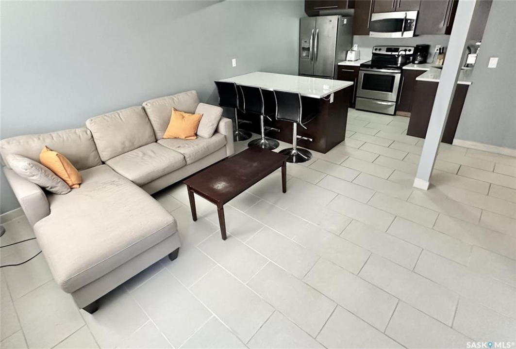Walk to work or easy commute to any corner of Regina. Fabulous downtown condo. Clean quiet building. Located on the middle floor with a balcony and choice of in-suite laundry if desired. Shared laundry in lower level. Open kitchen and living room design. Espresso cabinetry with light stone counters and under-mount stainless steel sink. Stainless steel fridge, stove, built-in dishwasher and microwave hood fan all included. Extra large island has 6 storage drawers and room for stools. Cute balcony off the living room. Good-sized bedroom and full 4-piece bathroom. Bathroom has deep soaker tub, body jets and rain shower head with custom tile surround. In-suite storage unit has laundry hook up for stacking washer and dryer. Washer and dryer not included. Ceramic tile flooring throughout. Location is right for the downtown professional or to expand your revenue portfolio. All furniture and items are optional to stay. Just move in. Parking stall in rear of building.