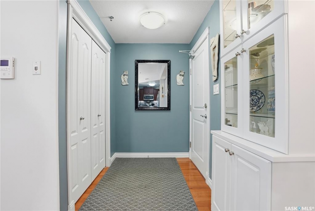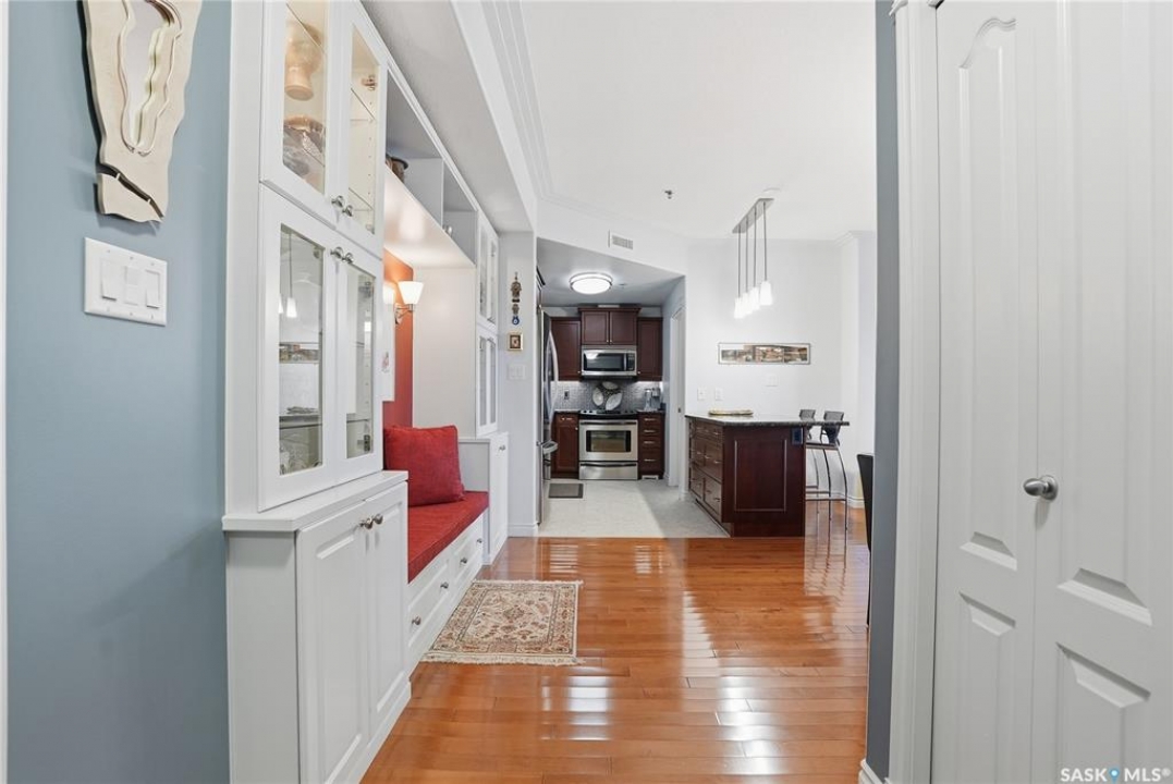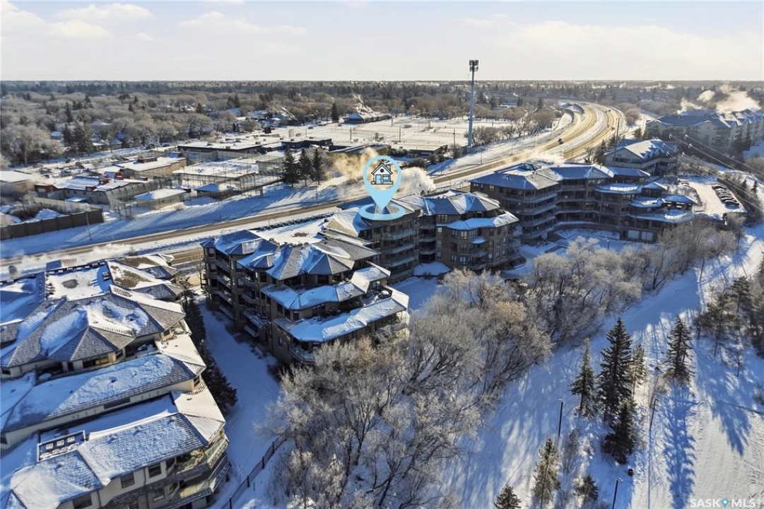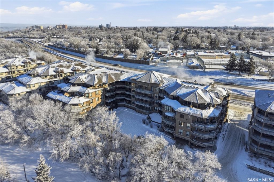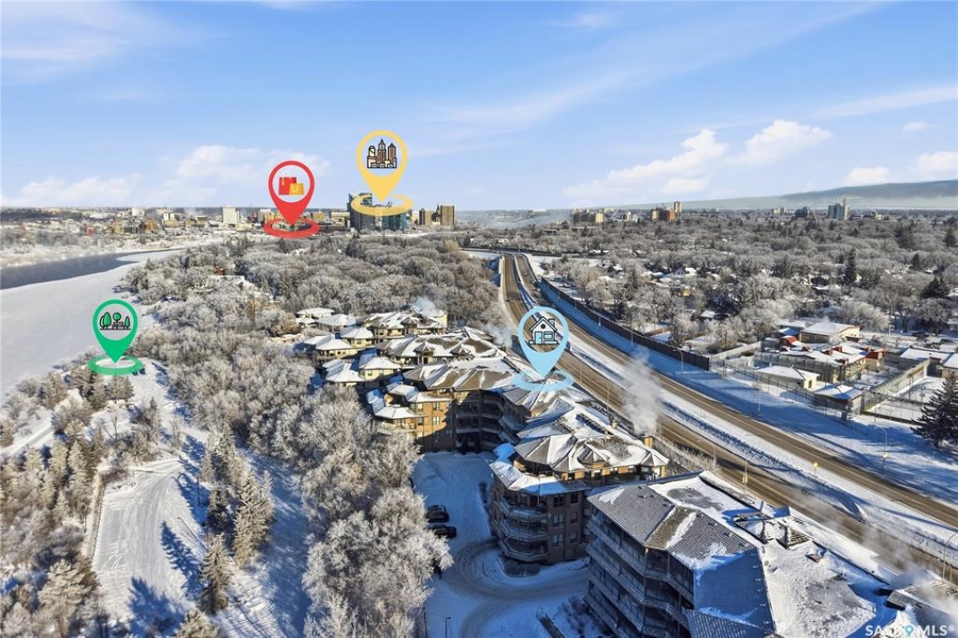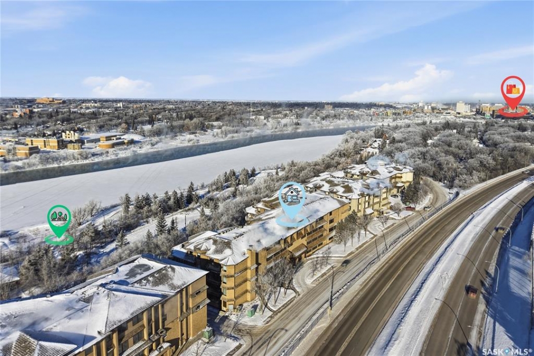 Perched along one of Saskatoon's most prestigious riverfront addresses on Saskatchewan Crescent West, this 1,079 sq ft executive condo offers a refined blend of calm, privacy, and uninterrupted views across the Meewasin Valley and South Saskatchewan River. Lovingly maintained by the original owner and lightly lived in (approximately four months per year), this home presents in mint condition, with timeless finishes that feel both elevated and enduring. Hardwood flooring and cabinetry, classic tile and grout, and custom built-in seating create a living space designed to be enjoyed fully and relaxed. The kitchen features stainless steel appliances and a thoughtful, functional layout with a large eat-up island that blends seamlessly into the open living and dining areas, ideal for quiet mornings or relaxed evenings at home. Two bedrooms and two bathrooms offer flexibility and comfort, including a river-facing primary suite with a walk-in closet and glass-enclosed walk-in shower. The second bedroom includes a beautiful custom Majestic-built Murphy bed and sits adjacent to a full 4-piece bathroom, making it equally suited to hosting guests or working from home. Central air conditioning, central vacuum, a retractable porch screen door, and underground parking add everyday ease, while the quiet, well-managed building offers premium amenities including a guest suite, amenities room, and exercise room. A refined riverfront lifestyle on where walkability, views, and understated luxury come together, this unit is sure to leave you feeling impressed. Located near nature, bus routes, downtown amenities, and the services on 8th St, you will love the accessibility and flexibility this home offers. Call your Realtor for your own exclusive tour now!