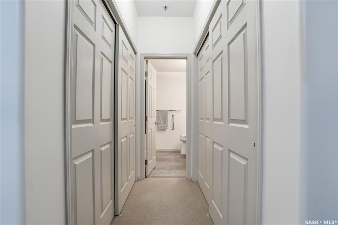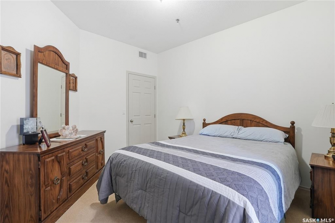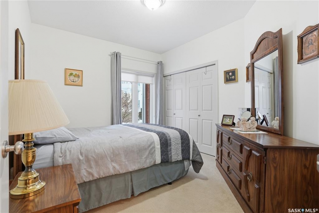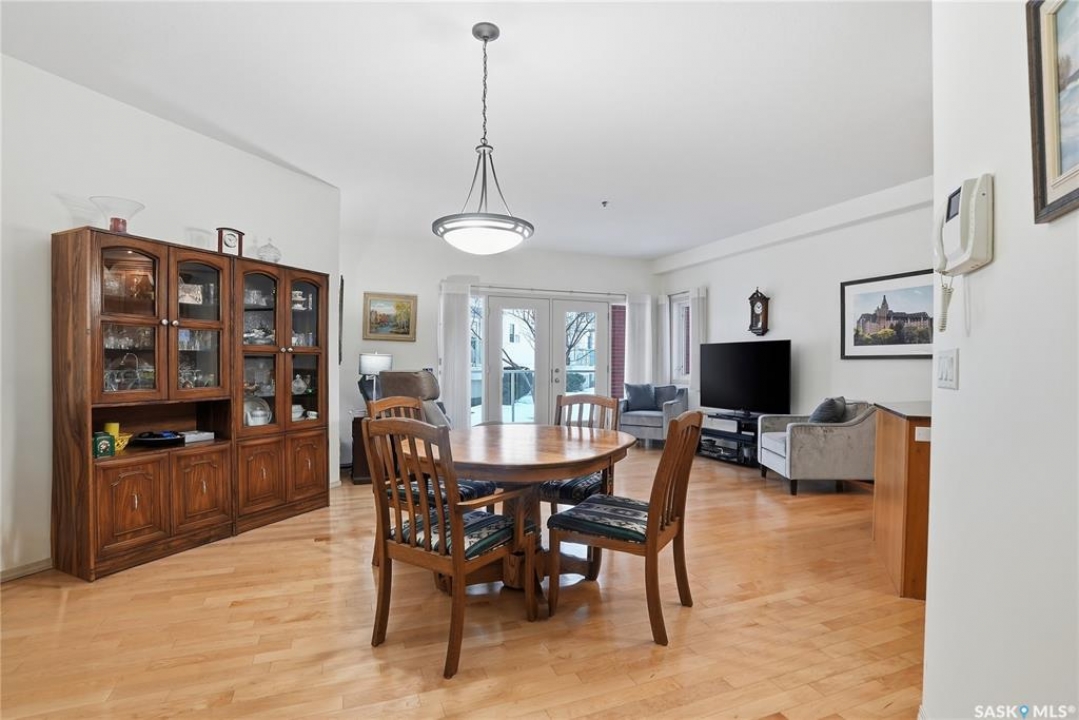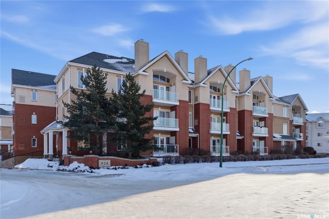 Welcome to Unit #112 at 928 Heritage View, ideally situated in the highly sought-after Wildwood neighborhood. This prime location offers easy access to scenic walking paths, nearby parks, and convenient routes to 8th Street and Circle Drive. This former show home is a main-floor unit that showcases quality finishes throughout, including beautiful newer maple hardwood flooring, 9-foot ceilings, and a bright open-concept layout. Upon entry, you're greeted by a front closet and a dedicated laundry room complete with an LG washer and dryer. The versatile office/den is perfect for additional guests or a work-from-home setup. The kitchen is thoughtfully designed with ample maple cabinetry accented by crown molding, stainless steel KitchenAid appliances, a pantry, tile backsplash, and a peninsula island offering additional seating. The kitchen flows seamlessly into the living room, which provides direct access to a southwest-facing wraparound Duradek balcony featuring two storage rooms—ideal for enjoying outdoor space and extra storage. The spacious primary bedroom offers abundant natural light and a walk-through double closet leading to a private 3-piece ensuite. The ensuite has been tastefully updated with a glass shower, luxury vinyl flooring, newer quartz countertop, newer toilet, and linen closet. An additional generously sized bedroom, a 4-piece bathroom with newer quartz vanity, newer luxury vinyl flooring, and tub/shower complete the interior. This unit includes one surface parking stall and one underground stall with additional caged storage. Residents enjoy access to an amenities room, exercise room, lounge, and ample visitor parking. Meticulously maintained by the original owner, this beautiful home is truly move-in ready and a must-see.