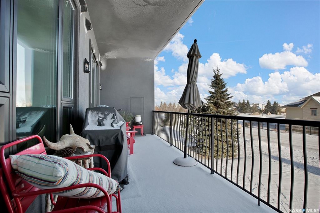 Welcome to The 408 Private Residence Building in The Willows, where luxury meets lifestyle. This immaculate, east-facing suite offers a private balcony with greenspace views, perfect for enjoying peaceful morning sunrise coffee. Designed for both comfort and sophistication, this residence features 2 spacious bedrooms plus a den, ideal for a home office or quiet retreat. The open-concept living space is complemented by designer decor, custom cabinetry, stone countertops, and high-end appliances, creating an elegant yet welcoming atmosphere for everyday living and entertaining. The primary suite is a true retreat, complete with a walk-in closet and a beautifully finished ensuite. Additional highlights include a large laundry room, concrete construction for exceptional privacy, underground storage, and two parking stalls—one underground and one surface. Located in the heart of The Willows, this condo offers a coveted lifestyle with easy access to golf, walking paths, and amenities—perfect for those seeking quiet elegance, convenience, and an elevated standard of living.