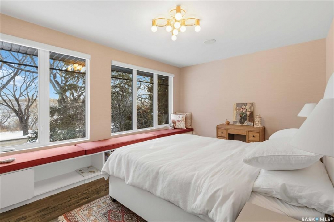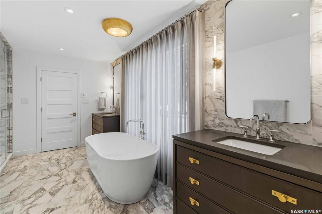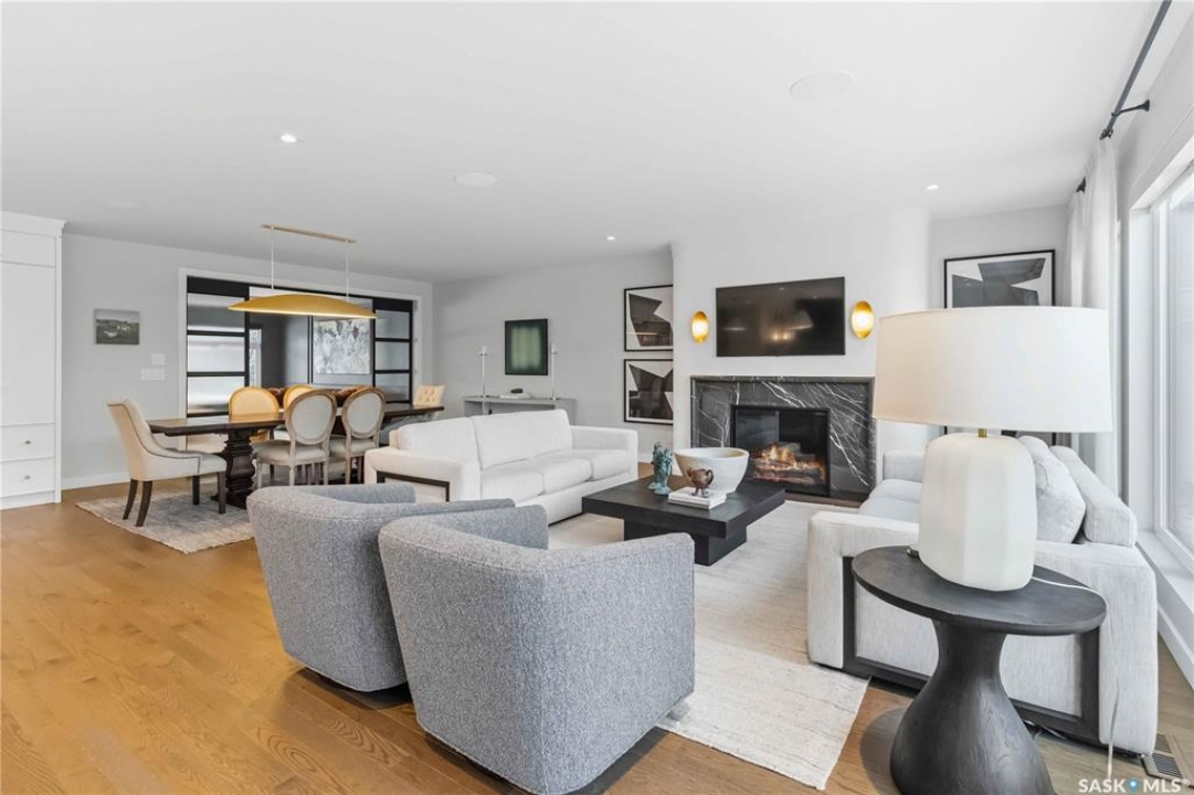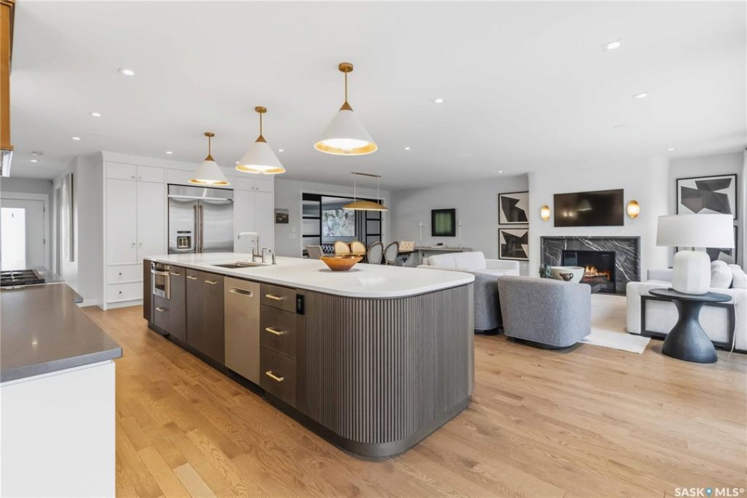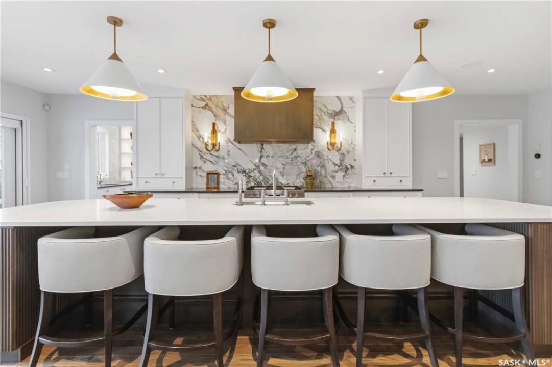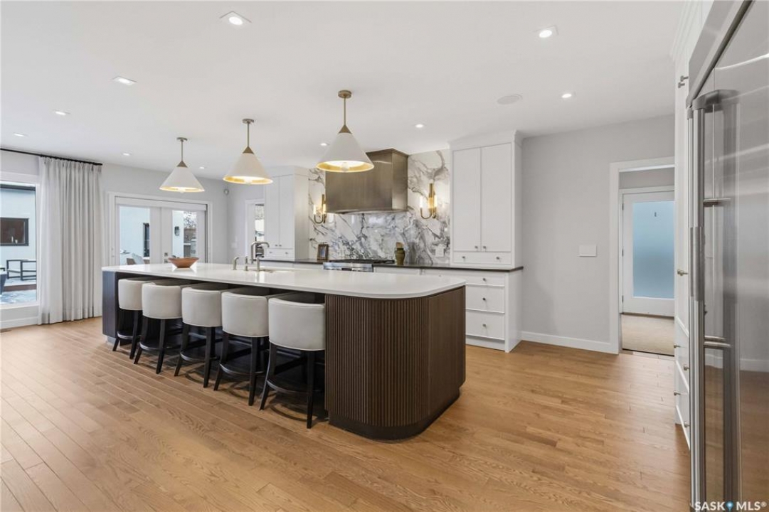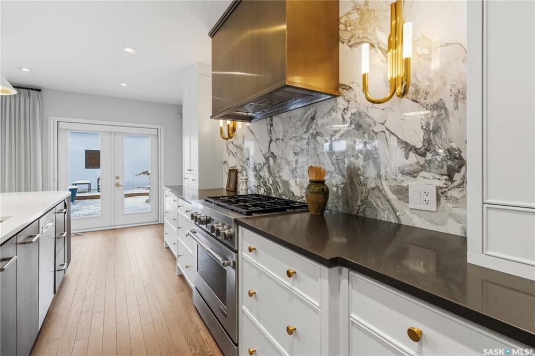 Welcome to 1134 Spadina Crescent E, an impeccably reimagined luxury residence where refined design meets exceptional craftsmanship. This two storey home offers 4 bedrooms and 4 bathrooms and was transformed through a professional, year long renovation by Atmosphere Interior Design from 2021 to 2022, showcasing uncompromising attention to detail throughout. The main floor features engineered oak flooring, custom ceiling and wall moulding, and a front executive office framed by steel doors and scenic river views. The showpiece kitchen is anchored by custom cabinetry with Restoration Hardware handles, a full slab marble backsplash, custom brass hood, sculptural brass lighting, and premium JennAir appliances. A statement oak island with fluted detailing, two garburators, artisan tile pantry backsplash, and refined finishes complete the space. The living area is warmed by a marble clad Town and Country gas fireplace and enhanced with motorized blinds, smart lighting, and built in speakers. Designer lighting by Kelly Wearstler, Restoration Hardware, and Arteriors creates a timeless, layered aesthetic throughout. New interior doors with Emtek hardware elevate both function and form. The primary suite is a spa inspired retreat featuring two walk in closets, heated tile floors, steam shower, Restoration Hardware mirrors, and Kelly Wearstler lighting. Secondary bedrooms are thoughtfully curated with designer wallpapers along with custom drapery. Additional highlights include a spacious mudroom, updated staircase with new spindles, and a timeless exterior finished in metal siding and stucco. Outdoor living is enhanced by a new composite deck completed last summer. The heated triple garage offers a drive through bay, slat wall storage, sub panel, and 240 volt plug. Other upgrades include new weeping tile with a sump pit. A rare and refined offering, blending elevated design, modern technology, and timeless elegance for an exceptional lifestyle opportunity.