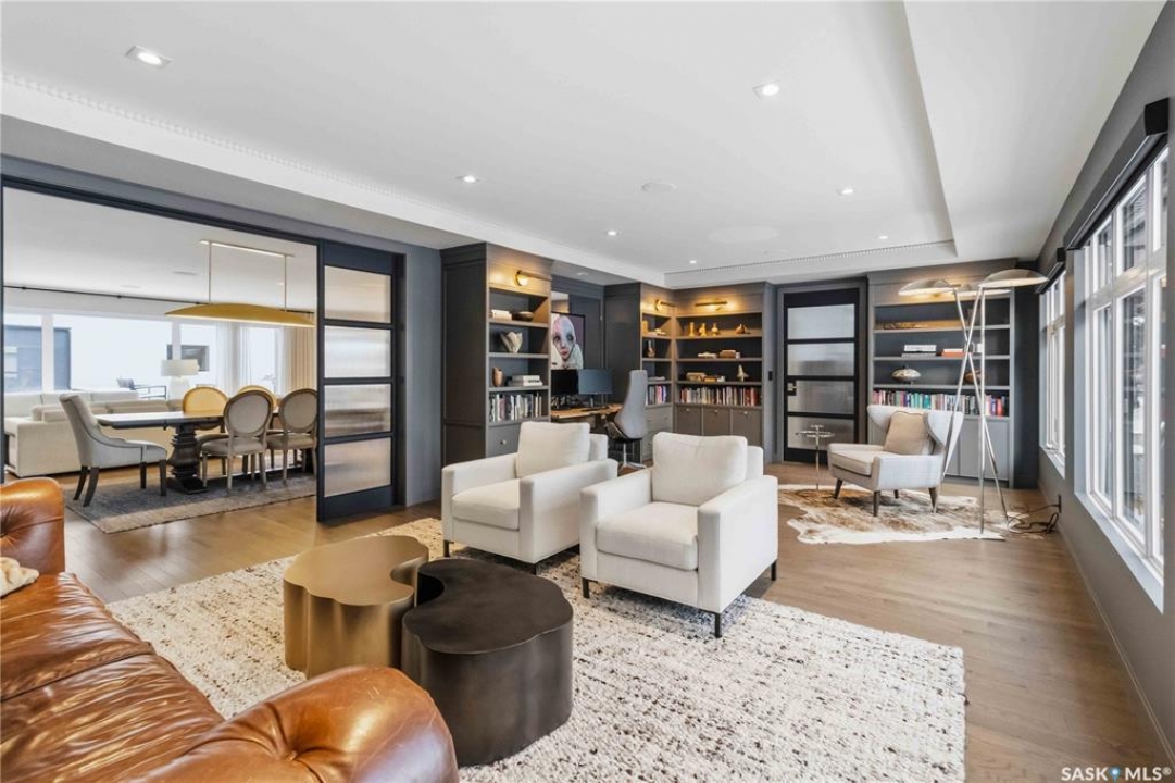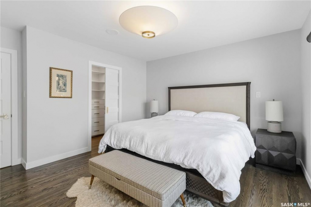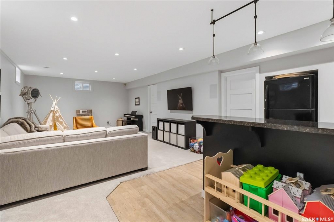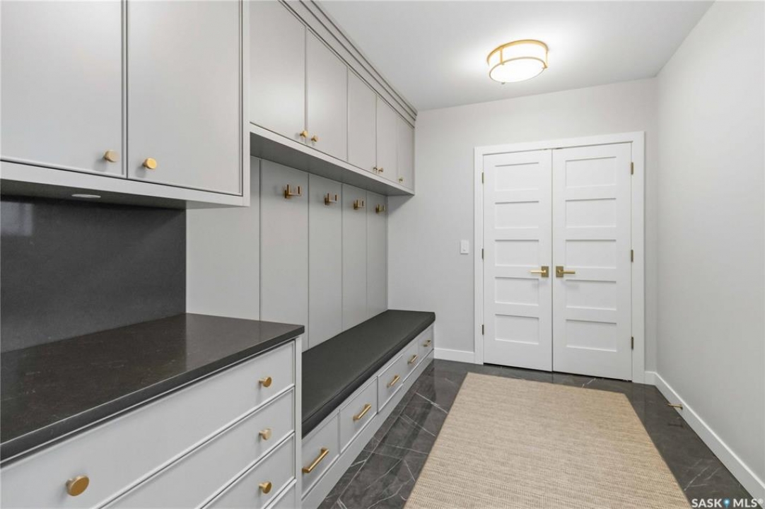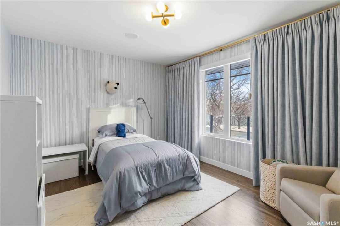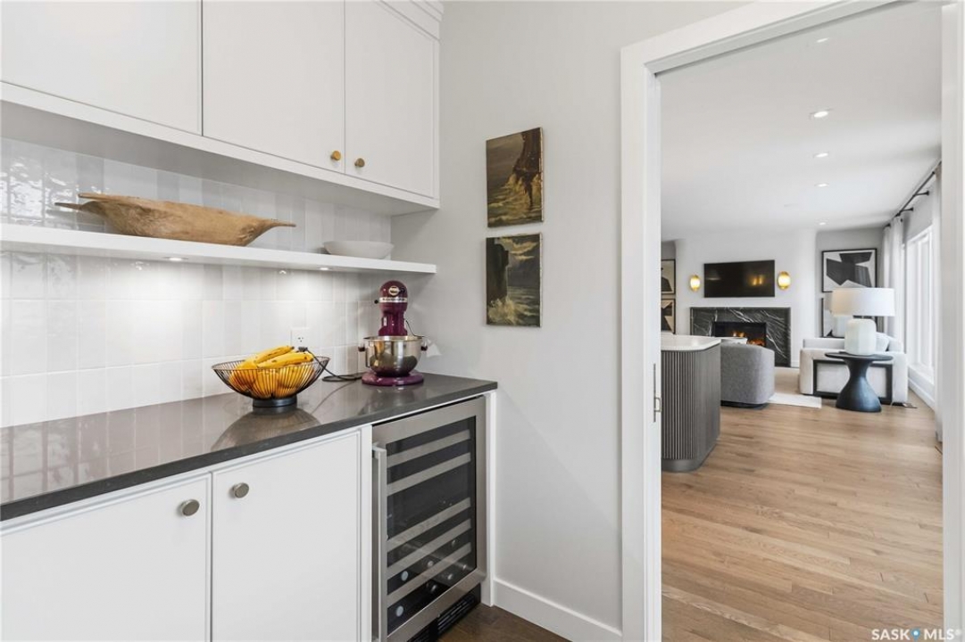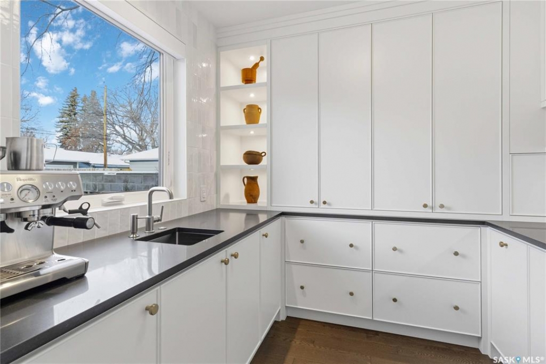Welcome to 1134 Spadina Crescent E, an impeccably reimagined luxury residence where refined design meets exceptional craftsmanship. This two storey home offers 4 bedrooms and 4 bathrooms and was transformed through a professional, year long renovation by Atmosphere Interior Design from 2021 to 2022, showcasing uncompromising attention to detail throughout. The main floor features engineered oak flooring, custom ceiling and wall moulding, and a front executive office framed by steel doors and scenic river views. The showpiece kitchen is anchored by custom cabinetry with Restoration Hardware handles, a full slab marble backsplash, custom brass hood, sculptural brass lighting, and premium JennAir appliances. A statement oak island with fluted detailing, two garburators, artisan tile pantry backsplash, and refined finishes complete the space. The living area is warmed by a marble clad Town and Country gas fireplace and enhanced with motorized blinds, smart lighting, and built in speakers. Designer lighting by Kelly Wearstler, Restoration Hardware, and Arteriors creates a timeless, layered aesthetic throughout. New interior doors with Emtek hardware elevate both function and form. The primary suite is a spa inspired retreat featuring two walk in closets, heated tile floors, steam shower, Restoration Hardware mirrors, and Kelly Wearstler lighting. Secondary bedrooms are thoughtfully curated with designer wallpapers along with custom drapery. Additional highlights include a spacious mudroom, updated staircase with new spindles, and a timeless exterior finished in metal siding and stucco. Outdoor living is enhanced by a new composite deck completed last summer. The heated triple garage offers a drive through bay, slat wall storage, sub panel, and 240 volt plug. Other upgrades include new weeping tile with a sump pit. A rare and refined offering, blending elevated design, modern technology, and timeless elegance for an exceptional lifestyle opportunity.