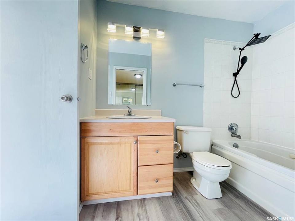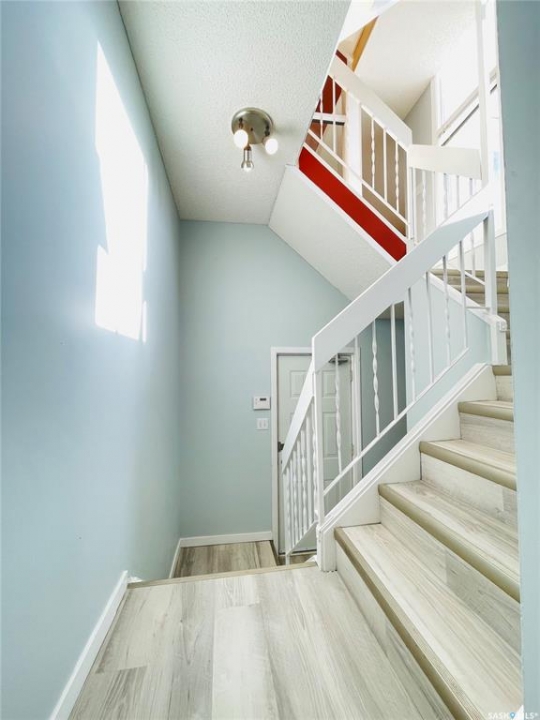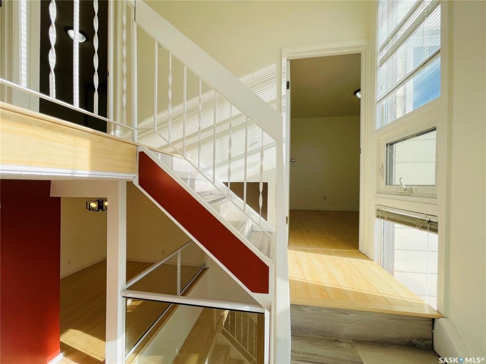This is a well-updated 1,467 sq. ft town house condo, south facing, 3-bedrooms with 2 bathrooms and option for 2 office/den spaces. Close to Luther College, Royal Regina Golf Course, RCMP Depot, grocery and shopping options, park / bike paths, and just minutes from downtown. This unique muti-level build features a bright open-concept design, with natural light thanks to large windows throughout the home. The living room is spacious and has access to a private, above-ground patio (deck) perfect for entertaining or enjoying the warm days. The updated kitchen has quartz countertops, tile backsplash and stainless steel appliances. The adjoining dining area overlooks the living room, with glass railings. Just off the kitchen is a bright den, which could be used as a home office, playroom, gym, or reading nook. This level also includes a 2-piece bathroom, Upstairs, you'll find a large master bedroom, with an adjoining space under natural skylight lighting, as well as big closet. Two more generous bedrooms with ample closet space and a 4-piece bathroom complete with a tiled tub surround, large vanity. The lower level houses a laundry, utility and even more space for storage or hobbies. Electrified carport with storage shed outside the back door. As a resident, you'll also have the option to rent a plot in the private community garden and access to a private outdoor pool. There are additional parking spaces available for rent if needed.