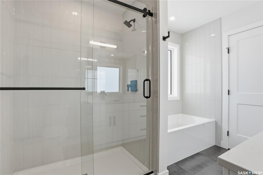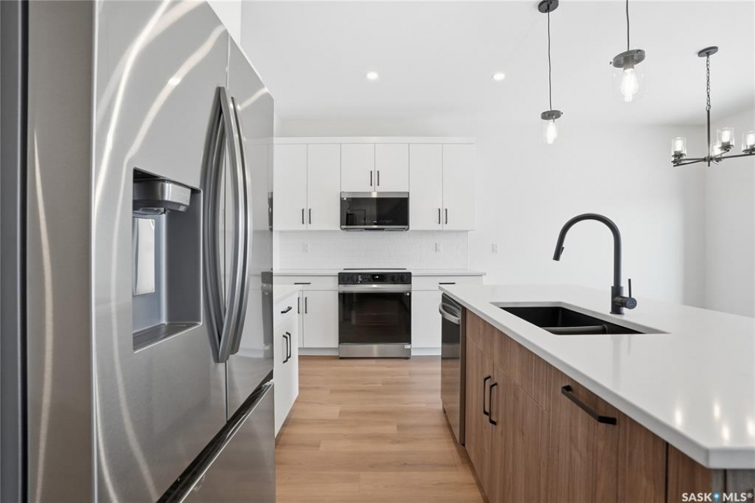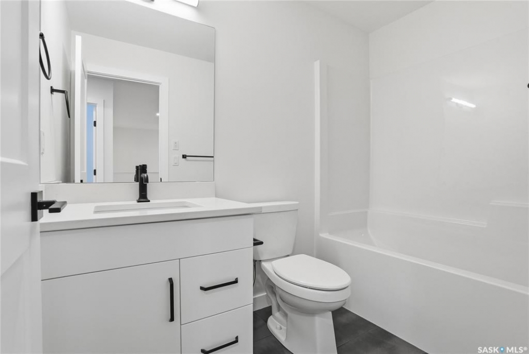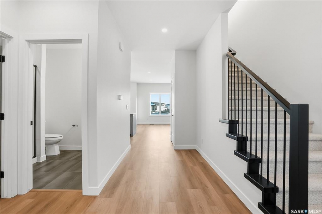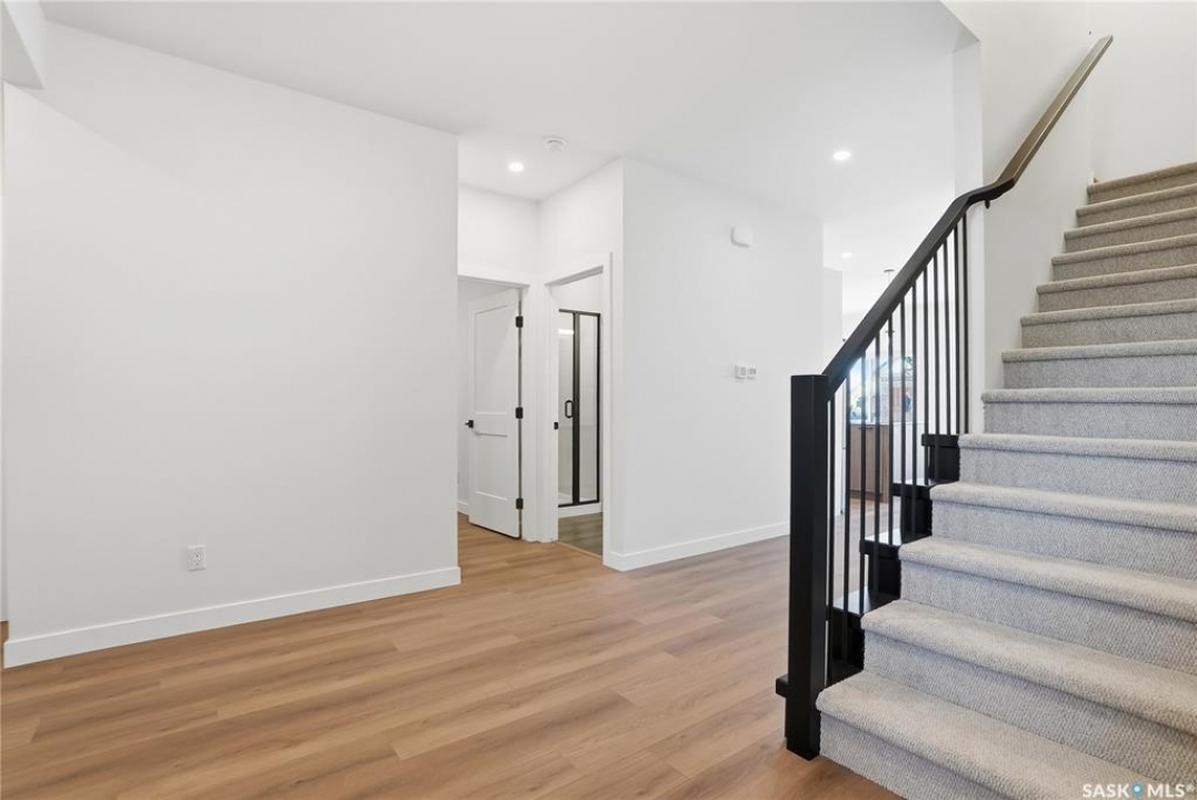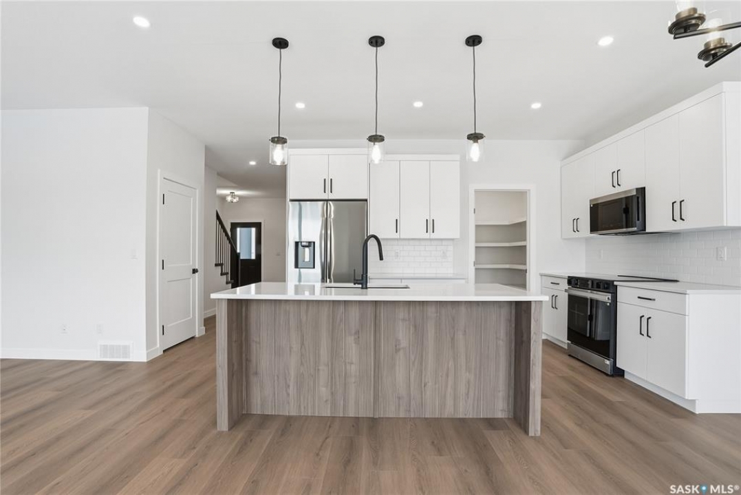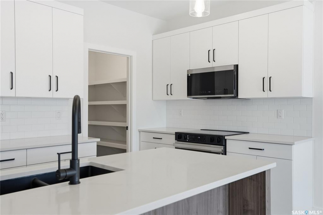 Modern 1,966 sq. ft. two-storey home featuring a rare main-floor bedroom and 3-piece bathroom, ideal for guests or multi-generational living. This 4-bedroom design offers 9' ceilings on the main level, laminate flooring throughout the main and second floors, and ceramic tile in bathrooms with tiled shower surrounds. The kitchen showcases a large quartz island, subway tile backsplash, soft-close cabinetry, walk-in pantry. Upstairs includes additional bedrooms and a well-appointed ensuite with double sinks, soaker tub, and custom tiled shower with glass enclosure. Additional highlights include pot lighting inside and out, upgraded black fixtures, comfort-height toilets, on-demand hot water, HRV, and high-efficiency furnace. Exterior is complete with triple-pane windows, covered front entry, concrete driveway, front landscaping.