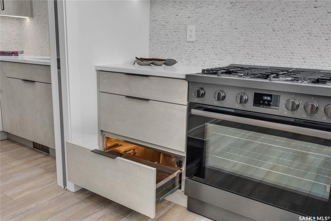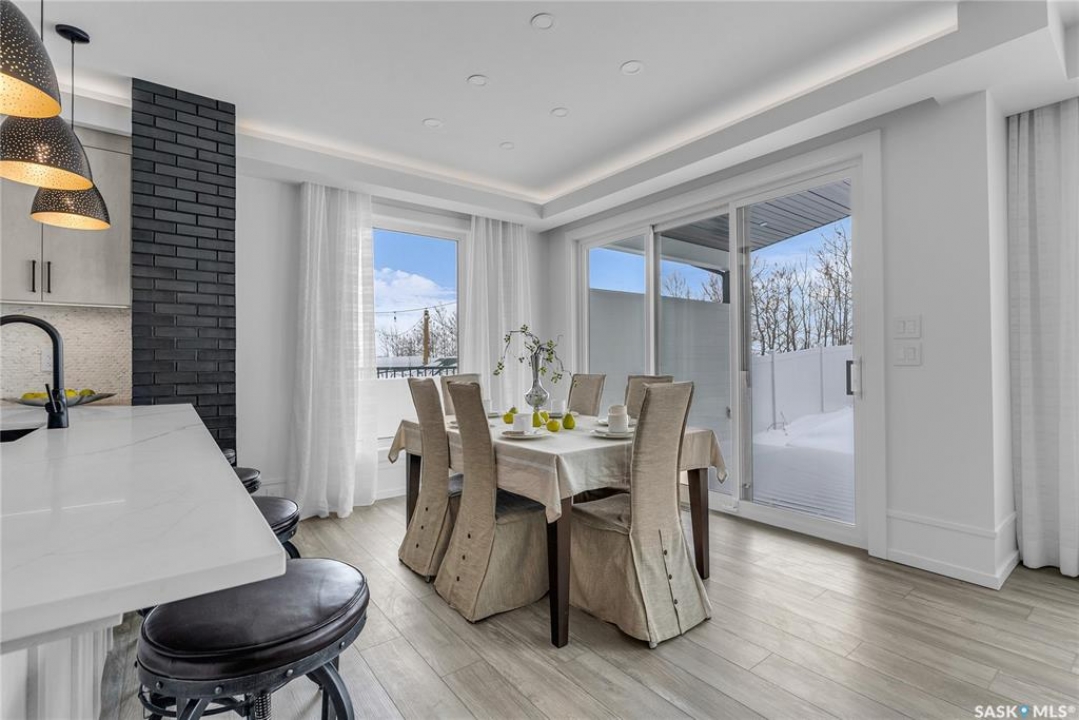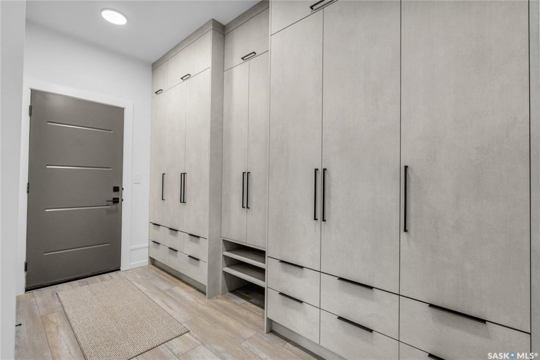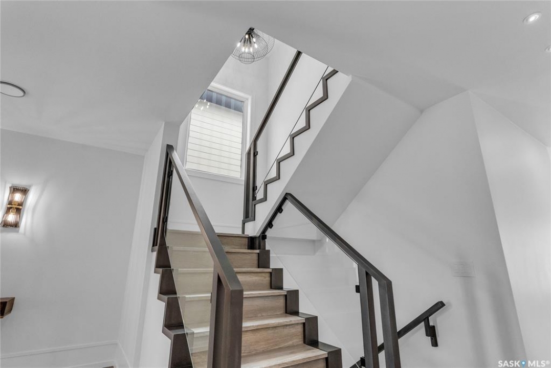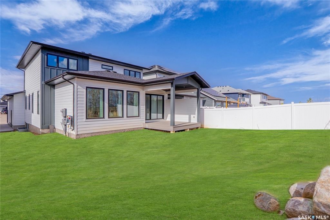 Homes by Norwood located at 428 Woolf Bend in Saskatoon's Aspen Ridge, featuring luxury finishes and expert craftsmanship. The spacious foyer welcomes you, stained wood railings and glass staircase inserts lead to 2nd floor. Engineered Vinyl Plank flooring throughout home. The main floor boasts 8' interior doors, 9' ceilings with LED-lit tray designs, a great room with a brick feature wall, large south-facing windows, and a dining area with sliding doors to a 12'x12' covered deck. The gourmet kitchen includes modern cabinetry, a 6-burner gas convection range, warming tray, range hood, LED strip lighting, tile backsplash, quartz countertops, and a peninsula bar, with an adjoining butler's pantry offering a fridge/freezer, dishwasher, microwave, prep sink, spice rack, and ample storage. The primary bedroom features a custom feature wall and insulated walls for sound comfort, while the ensuite offers dual vanities, a custom walk-in shower, abundant storage, a stacking washer/dryer, and a private commode. Additional main-floor spaces include a 2-piece powder room and mudroom with extensive storage. The second floor has three large bedrooms with interior insulated walls, a second laundry room with a sink, and a split main bathroom with dual vanities, a soaker tub/shower with tile, and separate lavatory. The basement's exterior walls are framed, insulated, and wired, with interior walls framed and wired as well. Mechanical features include a high-efficiency furnace with zoned heating and thermostats on each floor, a power vent hot water heater with a circulating pump, an HRV system, central air, and 200-amp electrical service. The 27'W x 26'D double attached garage is insulated, wired, drywalled, has LED lighting, and is nearly 14' high for future car lifts. The exterior features Hardie board siding, composite finishes, and a maintenance-free covered deck with a privacy wall and natural gas outlet. Enjoy breathtaking south views of Kernen Prairie—schedule a viewing today