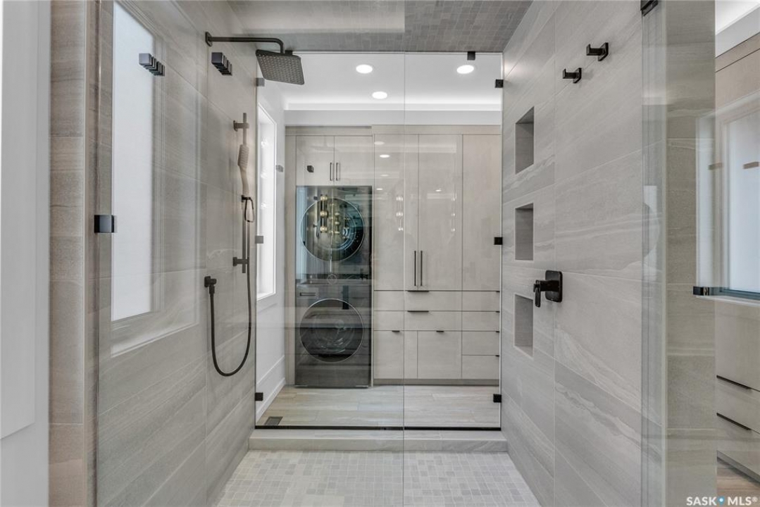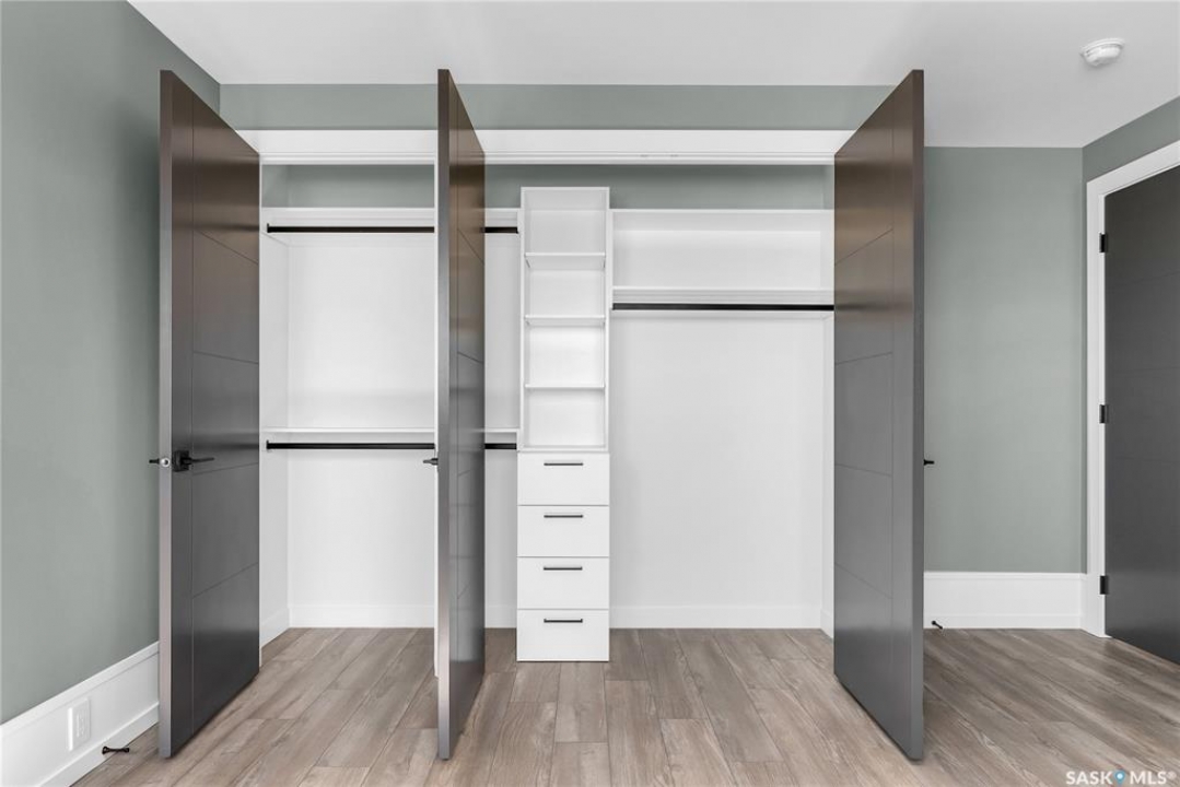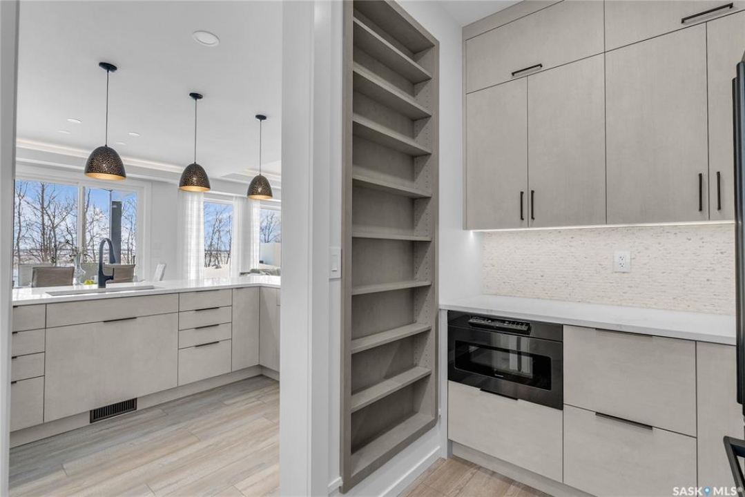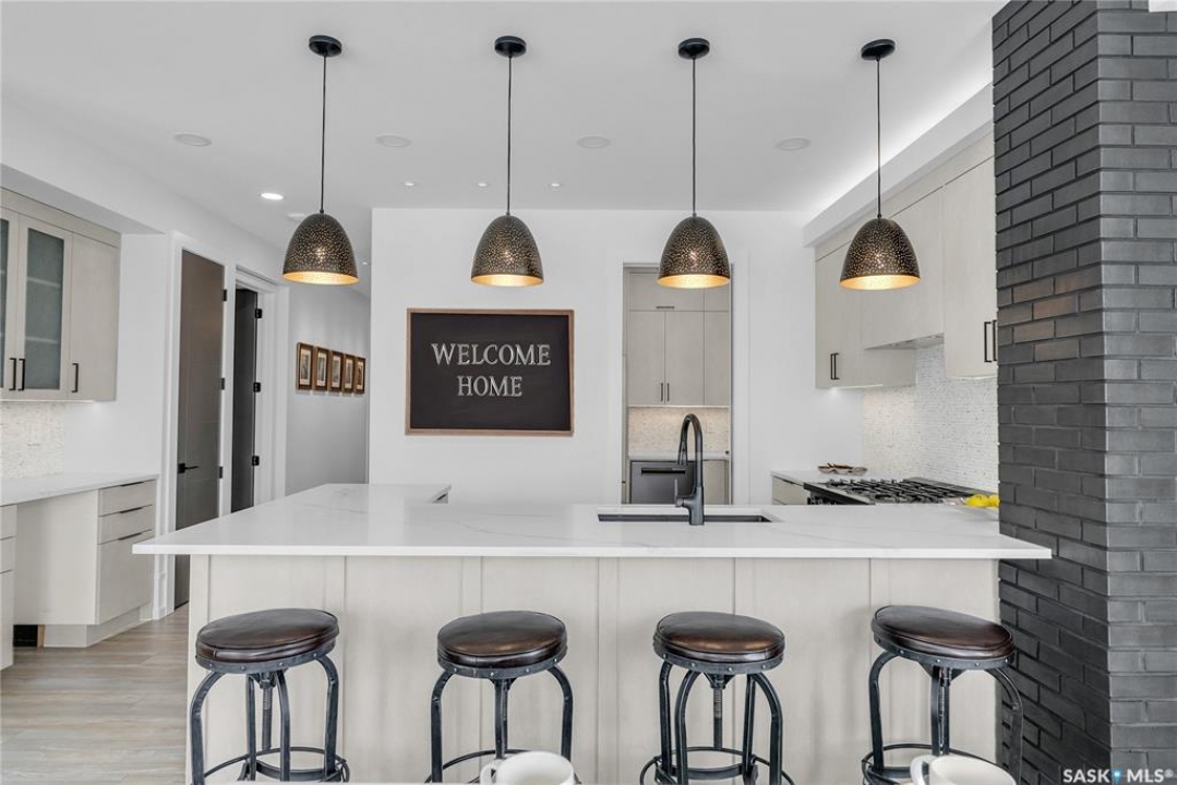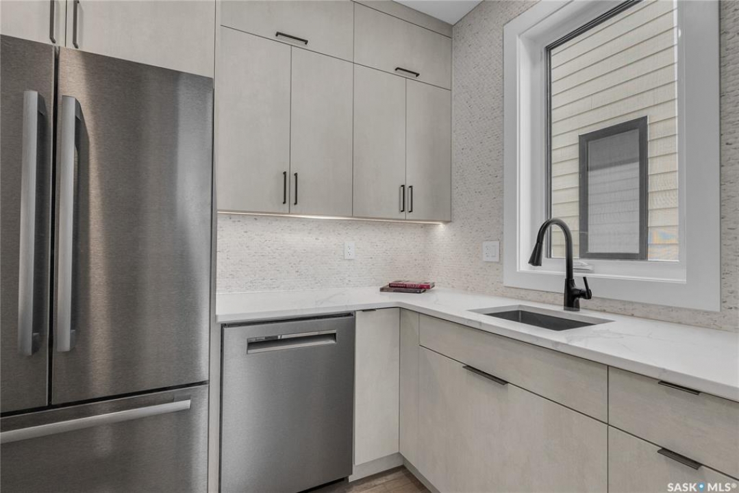 Homes by Norwood located at 428 Woolf Bend in Saskatoon's Aspen Ridge, featuring luxury finishes and expert craftsmanship. The spacious foyer welcomes you, stained wood railings and glass staircase inserts lead to 2nd floor. Engineered Vinyl Plank flooring throughout home. The main floor boasts 8' interior doors, 9' ceilings with LED-lit tray designs, a great room with a brick feature wall, large south-facing windows, and a dining area with sliding doors to a 12'x12' covered deck. The gourmet kitchen includes modern cabinetry, a 6-burner gas convection range, warming tray, range hood, LED strip lighting, tile backsplash, quartz countertops, and a peninsula bar, with an adjoining butler's pantry offering a fridge/freezer, dishwasher, microwave, prep sink, spice rack, and ample storage. The primary bedroom features a custom feature wall and insulated walls for sound comfort, while the ensuite offers dual vanities, a custom walk-in shower, abundant storage, a stacking washer/dryer, and a private commode. Additional main-floor spaces include a 2-piece powder room and mudroom with extensive storage. The second floor has three large bedrooms with interior insulated walls, a second laundry room with a sink, and a split main bathroom with dual vanities, a soaker tub/shower with tile, and separate lavatory. The basement's exterior walls are framed, insulated, and wired, with interior walls framed and wired as well. Mechanical features include a high-efficiency furnace with zoned heating and thermostats on each floor, a power vent hot water heater with a circulating pump, an HRV system, central air, and 200-amp electrical service. The 27'W x 26'D double attached garage is insulated, wired, drywalled, has LED lighting, and is nearly 14' high for future car lifts. The exterior features Hardie board siding, composite finishes, and a maintenance-free covered deck with a privacy wall and natural gas outlet. Enjoy breathtaking south views of Kernen Prairie—schedule a viewing today