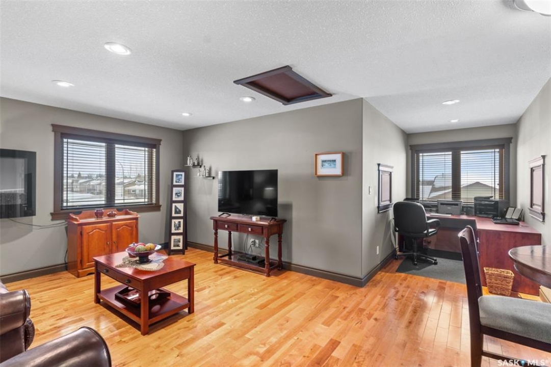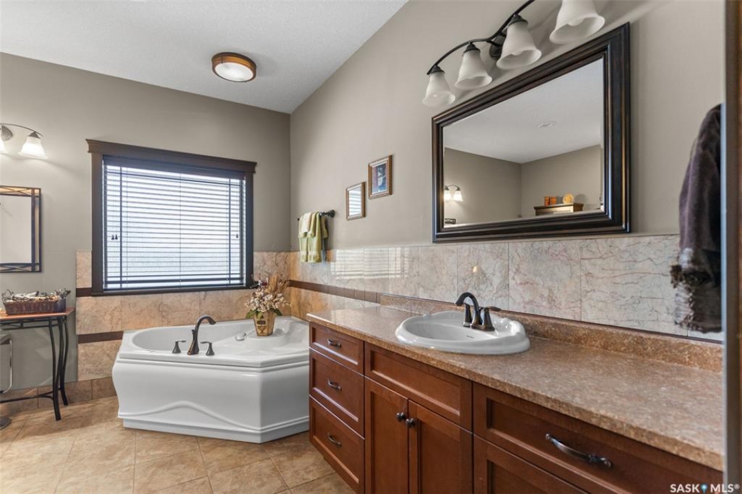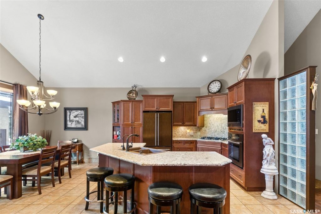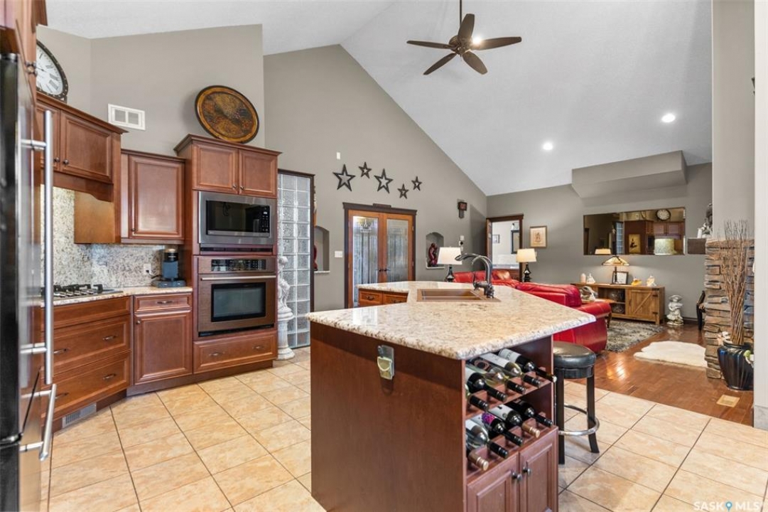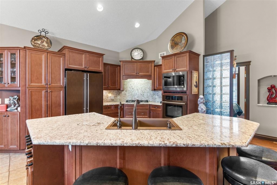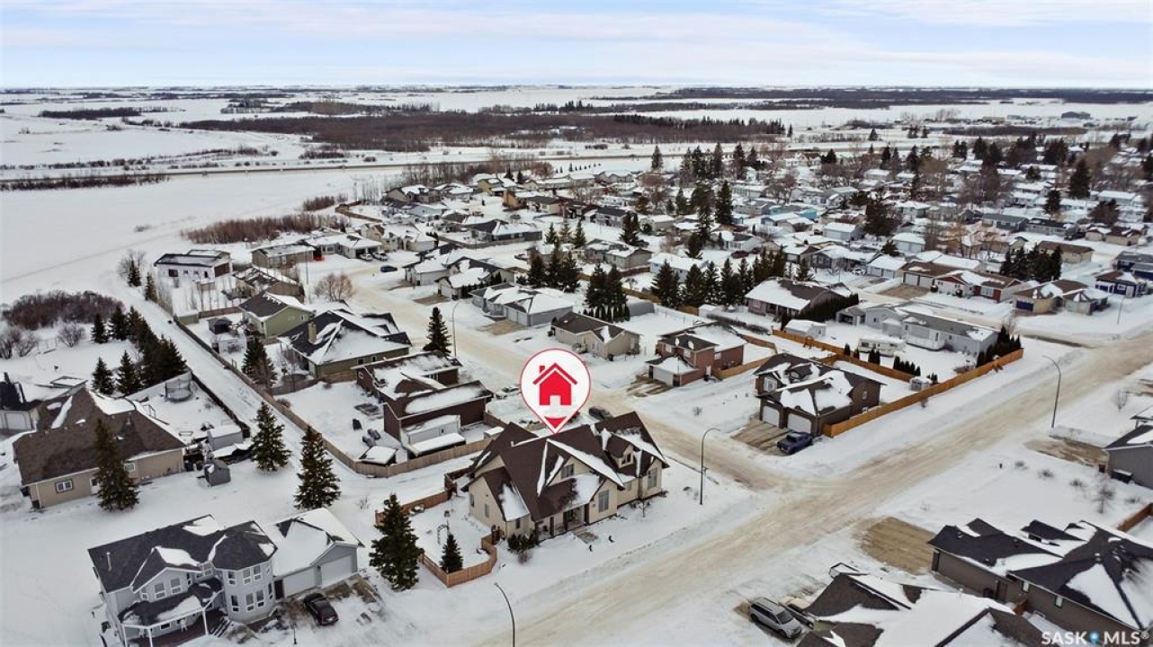 Step into this sophisticated luxury home where exceptional craftsmanship and high-end finishes create an atmosphere of refined elegance. This impressive 4-bedroom, 4-bathroom residence welcomes you with a grand foyer and stylish French doors that open into the main living area. At the heart of the home is a stunning living space featuring soaring vaulted ceilings and a striking double-sided fireplace, offering both warmth and architectural impact. The open-concept design flows seamlessly into a chef-inspired kitchen outfitted with top-of-the-line Jenn-Air appliances, rich maple cabinetry, a large central island, and luxurious granite countertops with a matching granite sink. The bright and inviting dining area easily accommodates a full-sized table and is enhanced by thoughtfully placed skylights that flood the home with natural light. A gorgeous sunroom, complete with its own fireplace and direct access to the backyard, provides a cozy year-round retreat. The main floor hosts three generously sized bedrooms, including a luxurious primary suite featuring a spacious walk-in closet and a spa-like 5-piece ensuite with a jetted tub, separate shower, and elegant vanity. A second 3-piece bathroom offers added convenience, along with a well-appointed laundry room that includes a 2-piece bath and tiled flooring. Upstairs, a versatile bonus room with hardwood floors and an electric fireplace offers endless possibilities—ideal for a relaxing lounge, home office, or games room with picturesque views. The partially finished basement includes a fourth bedroom, a 3-piece bathroom, a utility room, and a large heated crawl space with concrete flooring, providing excellent storage options. Outside, enjoy the beautifully landscaped yard featuring a garden shed, fenced areas for added privacy, and a spacious deck with pergola. Additional highlights include a heated double attached garage with direct entry, ample parking, and only 20 mins. from BHP Mine and 30 mins. to Humboldt.