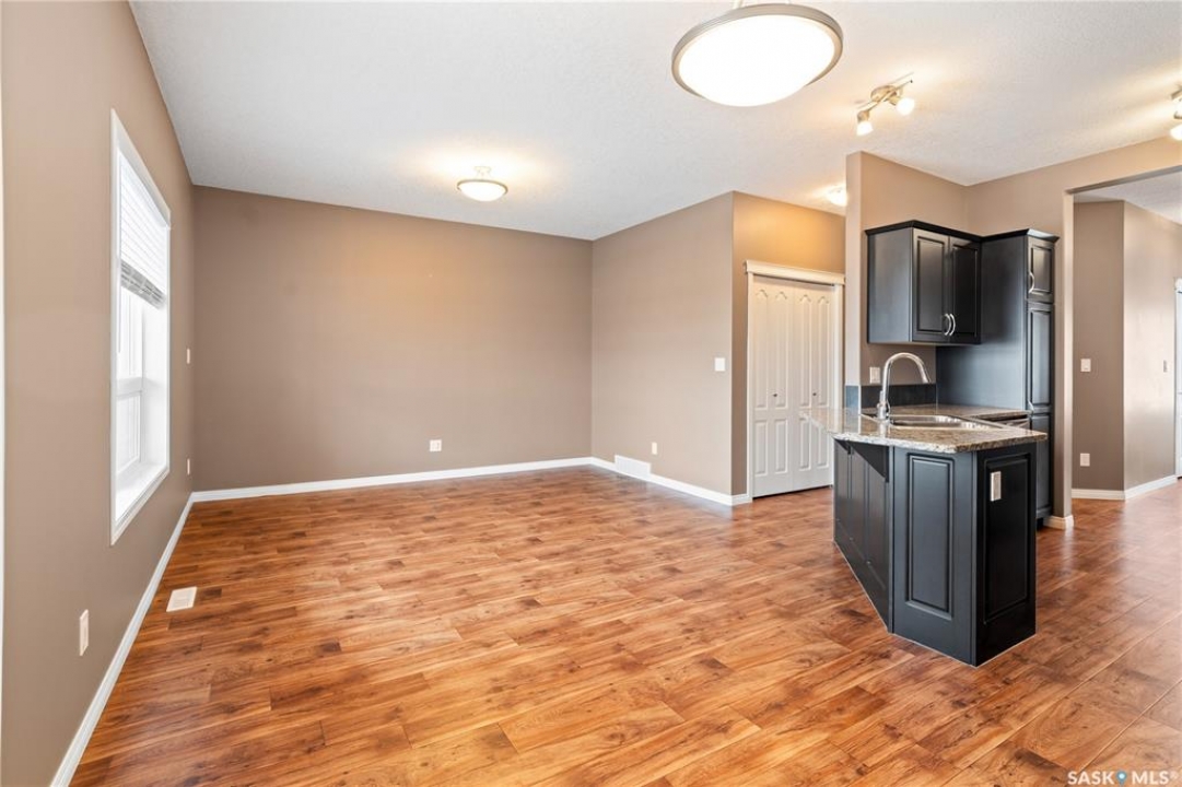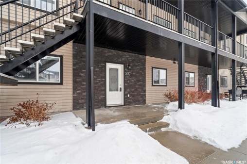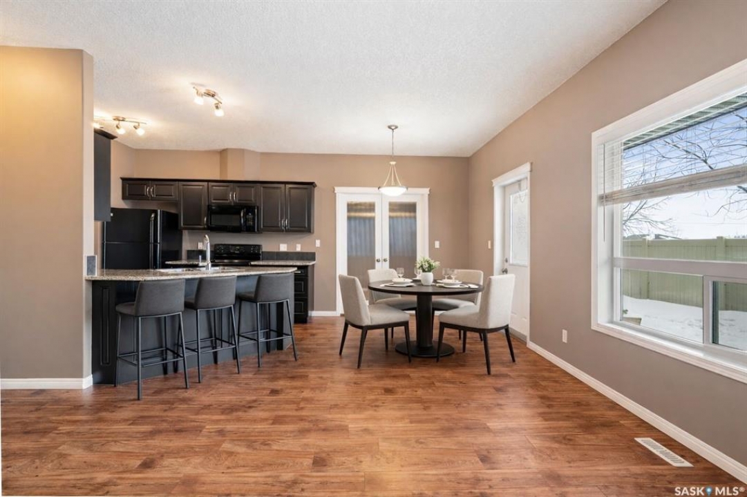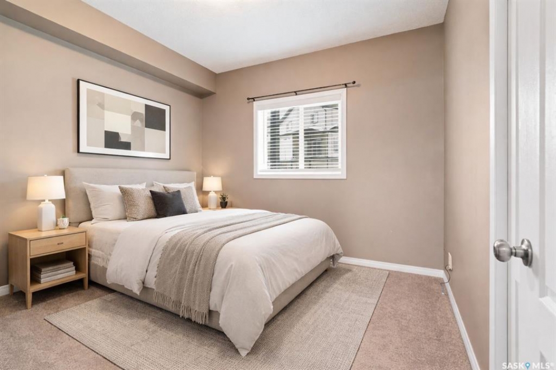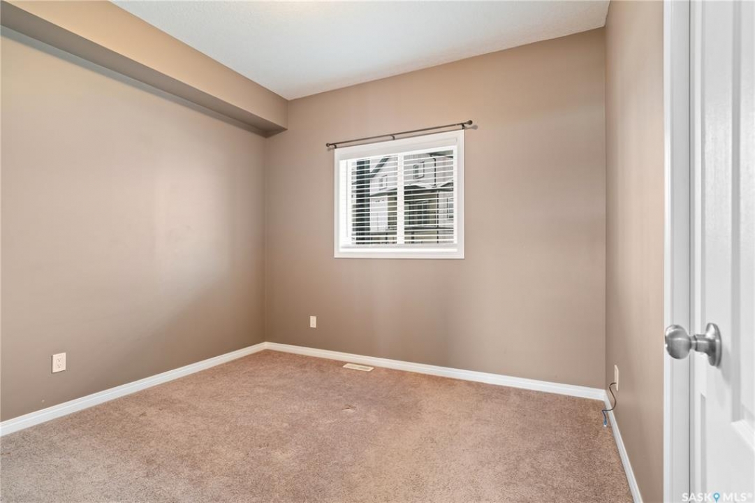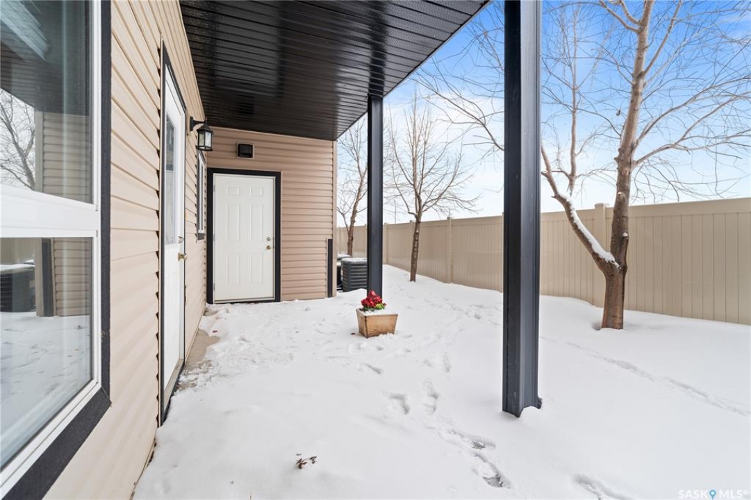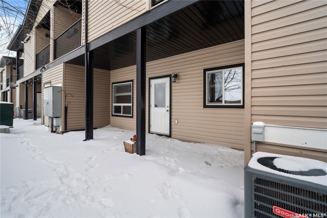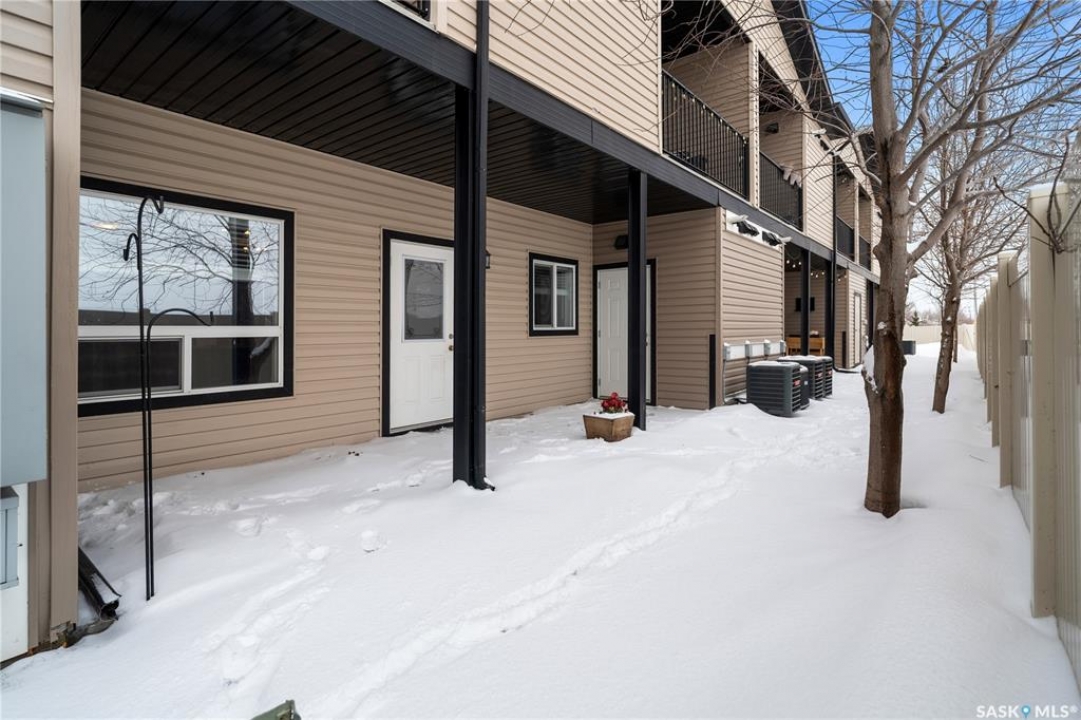 Welcome to this well-maintained, original owner main level condo offering 1,066 sq ft of functional, thoughtfully designed living space. A spacious foyer welcomes you into a bright, open-concept layout that's easy to live in and easy to love. The kitchen is a standout with granite countertops, plenty of cabinetry, and a large island ideal for meal prep, casual dining, and entertaining. The dining area and living room flow seamlessly together, creating a comfortable and inviting space for everyday living. The primary bedroom can accommodate a king-sized suite and features a private 4-piece ensuite. A second bedroom is positioned separately from the primary, while the third bedroom or den is accessed through French doors just off the dining room and offers excellent flexibility as a multi-purpose space that would be ideal for a home office, craftroom, playroom or a 3rd bedroom. A second full 4-piece bathroom adds everyday convenience. One thing you'll truly appreciate about this condo is the amount of storage it offers, from the outdoor storage unit on the patio and the crawlspace off the bedroom/den, to well-planned out interior storage including a large linen closet and entryway closet, there's no shortage of space to keep things organized. Step outside to a spacious patio backing onto green space with no rear neighbours offering a private place to unwind and enjoy Saskatchewan sunsets right outside your back door. The unit includes one electrified parking stall conveniently located out front and is steps from a children's park within the complex. This condo is ideally located minutes from East-end amenities including Costco, Landmark Cinemas, Winners, and more, with nearby bus route access and close proximity to Henry Braun, St. Theresa, and Judge Bryant schools. Whether you're a first-time buyer, downsizer, single professional, or family, this move-in ready condo offers flexibility, comfort, and a layout that truly works!