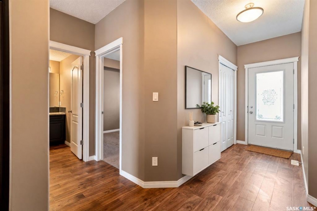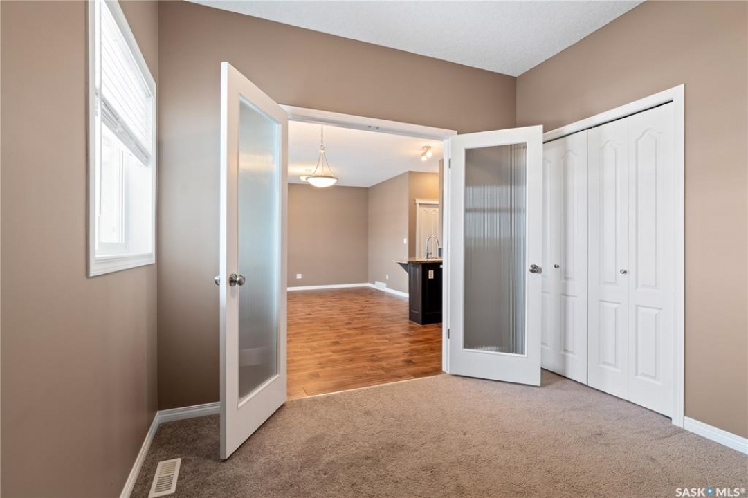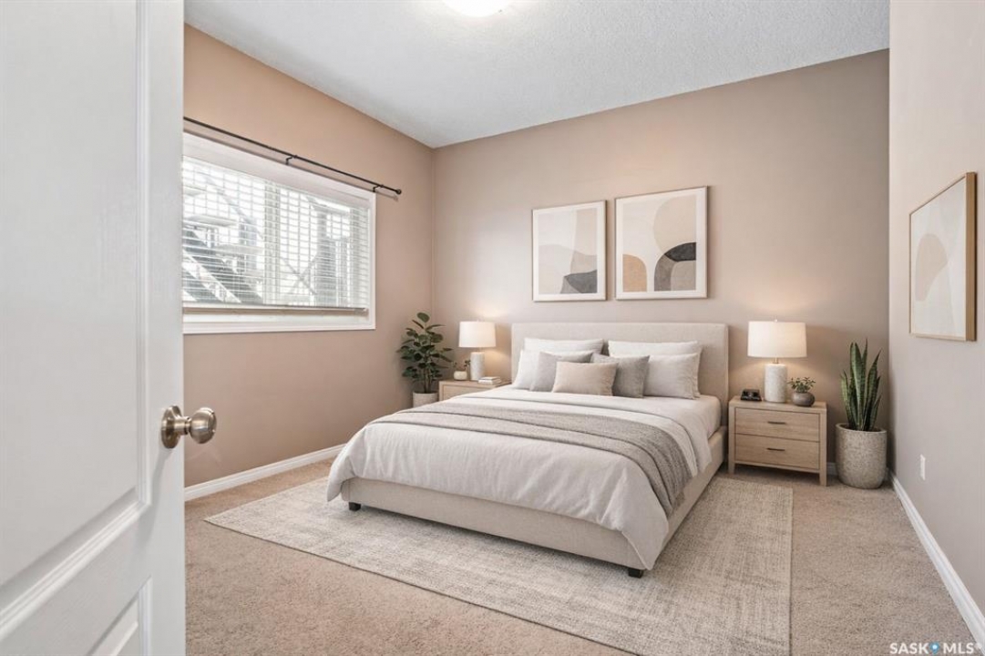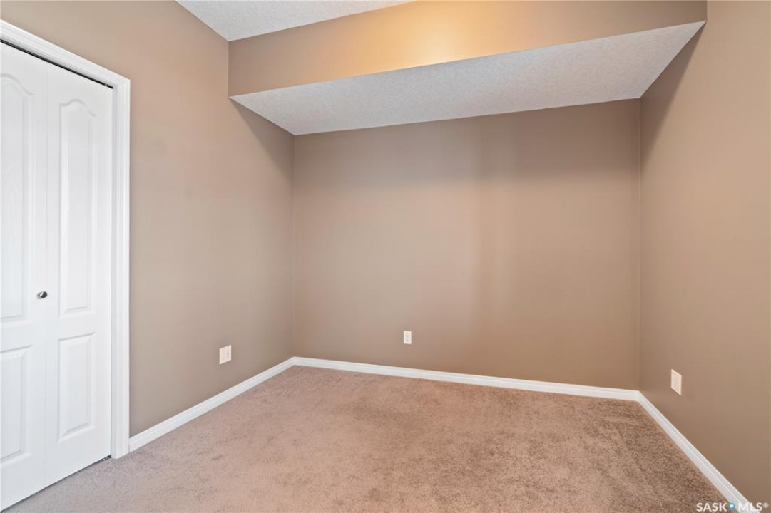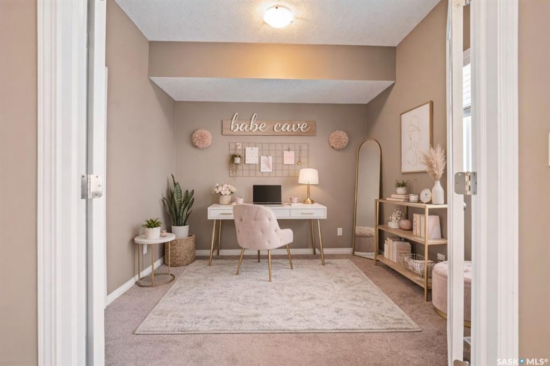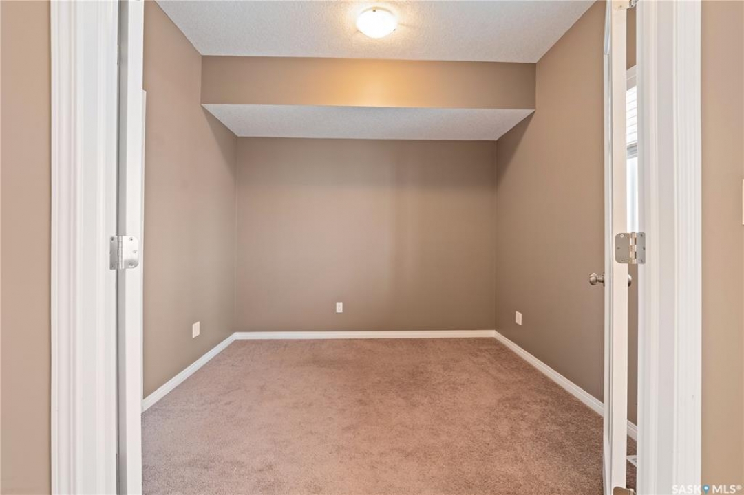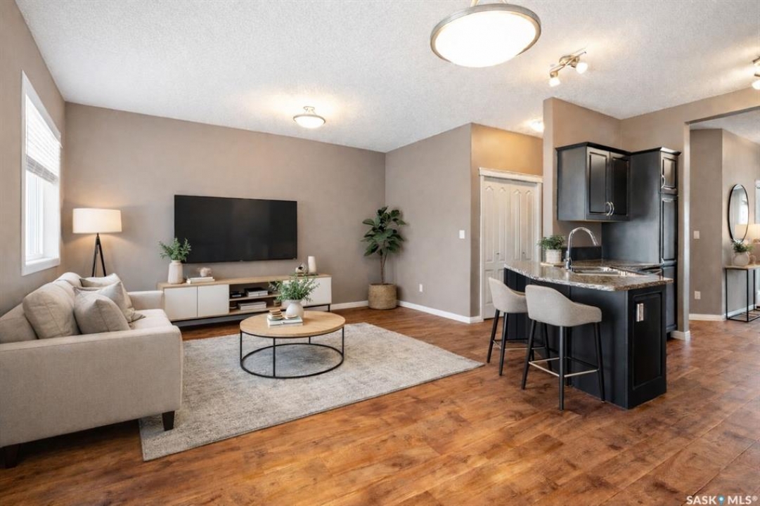 Welcome to this well-maintained, original owner main level condo offering 1,066 sq ft of functional, thoughtfully designed living space. A spacious foyer welcomes you into a bright, open-concept layout that's easy to live in and easy to love. The kitchen is a standout with granite countertops, plenty of cabinetry, and a large island ideal for meal prep, casual dining, and entertaining. The dining area and living room flow seamlessly together, creating a comfortable and inviting space for everyday living. The primary bedroom can accommodate a king-sized suite and features a private 4-piece ensuite. A second bedroom is positioned separately from the primary, while the third bedroom or den is accessed through French doors just off the dining room and offers excellent flexibility as a multi-purpose space that would be ideal for a home office, craftroom, playroom or a 3rd bedroom. A second full 4-piece bathroom adds everyday convenience. One thing you'll truly appreciate about this condo is the amount of storage it offers, from the outdoor storage unit on the patio and the crawlspace off the bedroom/den, to well-planned out interior storage including a large linen closet and entryway closet, there's no shortage of space to keep things organized. Step outside to a spacious patio backing onto green space with no rear neighbours offering a private place to unwind and enjoy Saskatchewan sunsets right outside your back door. The unit includes one electrified parking stall conveniently located out front and is steps from a children's park within the complex. This condo is ideally located minutes from East-end amenities including Costco, Landmark Cinemas, Winners, and more, with nearby bus route access and close proximity to Henry Braun, St. Theresa, and Judge Bryant schools. Whether you're a first-time buyer, downsizer, single professional, or family, this move-in ready condo offers flexibility, comfort, and a layout that truly works!
