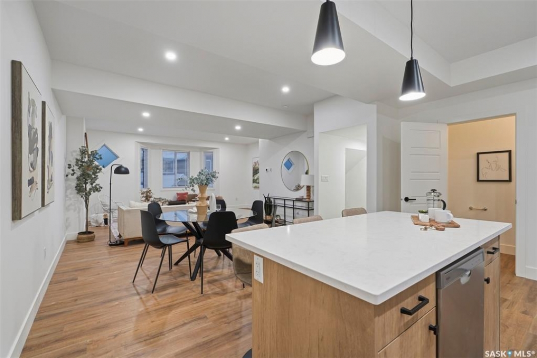 Welcome to 135–3220 11th Street West. A brand new, end unit, contemporary 3-storey townhouse offering the perfect blend of style, comfort, and functionality. Designed with modern living in mind, this home features an attached 2-car tandem style garage with a single drive and over 1,400 sq. ft. of thoughtfully designed space. Step inside to a bright and open second floor featuring 9 ft. ceilings, a spacious living and dining area, and a beautifully finished kitchen with quartz countertops, soft-close cabinetry, tiled backsplash, and a patio door to your balcony. A convenient 2-piece bath completes this level. Upstairs, the third floor offers a well-planned layout with 3 bedrooms and 2 full bathrooms, including a primary suite with a walk-in closet and beautiful ensuite. The additional 4-piece bath and laundry area are ideally located on the same floor for everyday convenience. Enjoy the practicality of a slab foundation providing durability and low maintenance, along with the peace of mind that comes with new construction. Located in the desirable Montgomery Place area, this development offers quiet residential living with quick access to Circle Drive, shopping, and amenities. Whether you're a first-time buyer, young professional, or investor, this home checks all the boxes for modern, low-maintenance living. Please note: photos are of a similar unit and the interior photos are virtually staged. This home will be move in ready mid to end of March 2026.