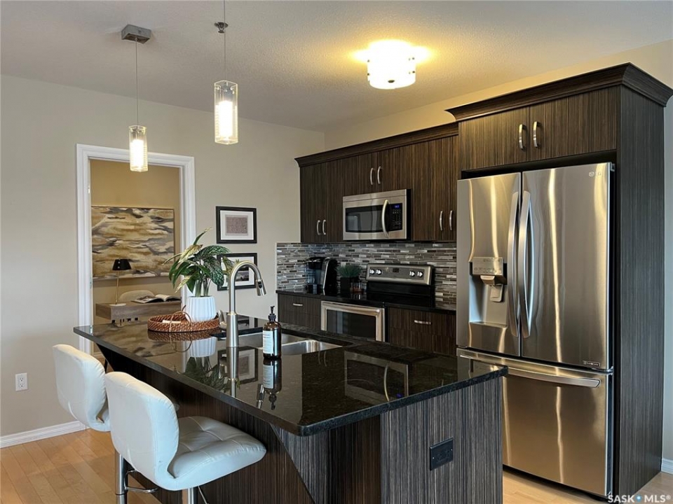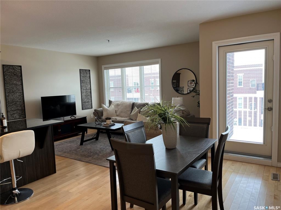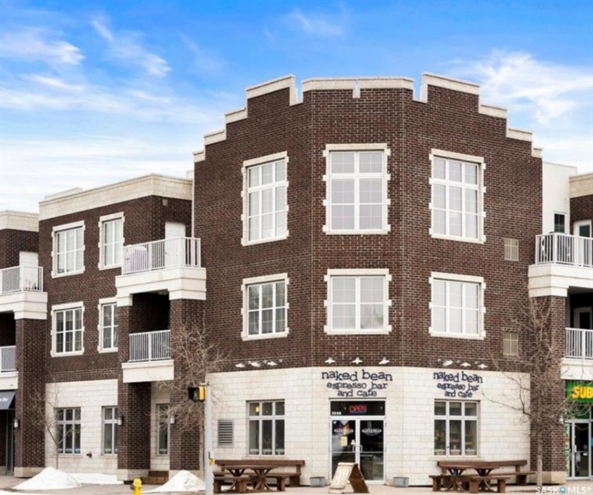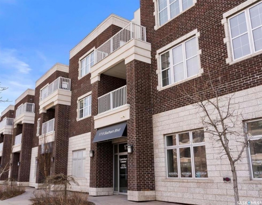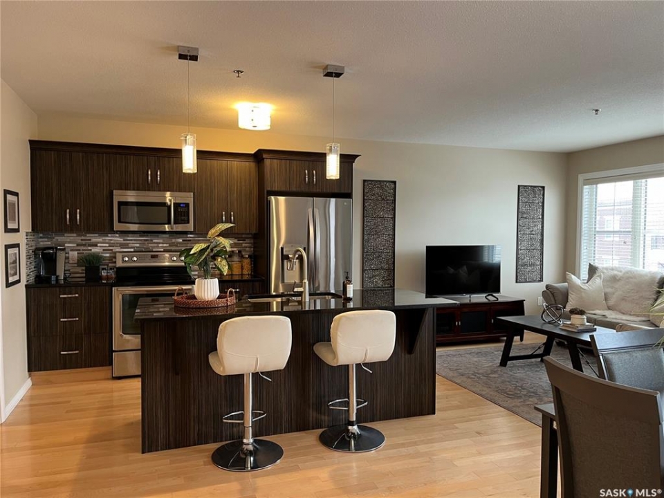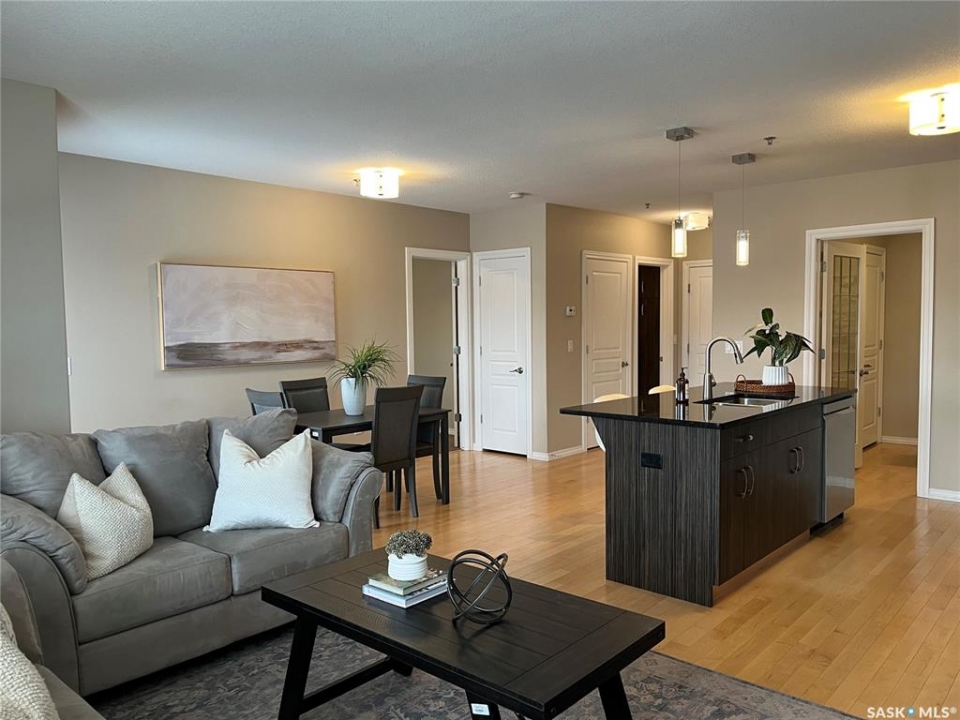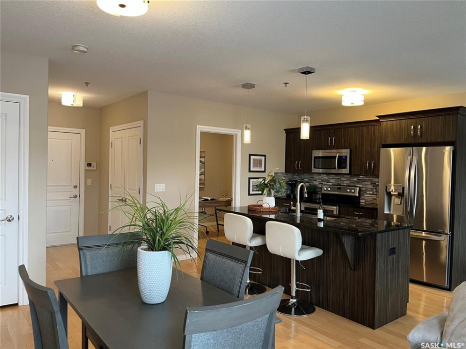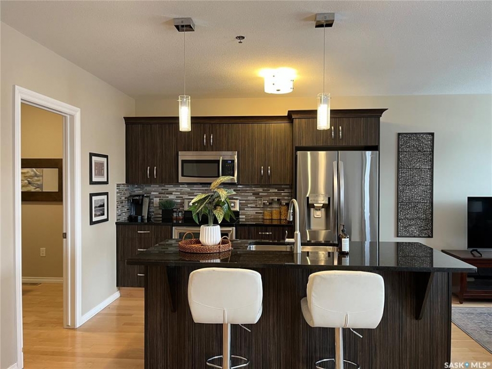 Welcome to condo living at Canterbury Common, conveniently located in the desirable Arnhem Place neighbourhood, within walking distance to Wascana Park and just minutes from downtown Regina. Residents enjoy the convenience of main-floor amenities including The Naked Bean Coffee Shop, The Lobby Kitchen and Bar, Wellness Pharmacy, and more. This well-maintained apartment-style condo offers a bright and functional layout designed for comfortable everyday living. Upon entry, you'll immediately notice the open-concept kitchen, dining, and living area, creating an inviting and cohesive space. The kitchen features granite countertops, stainless steel appliances, ample cupboard and counter space, and a large island, making it both practical and stylish. Just off the kitchen is a versatile den, ideal for a home office or guest space. A dedicated dining area provides room for a table, perfect for entertaining. The living room is filled with natural light from large windows and offers direct access to the balcony with a natural gas BBQ hookup. The primary bedroom includes a walk-in closet and dual access to the four-piece bathroom from both the bedroom and hallway. In suite laundry with a stackable washer/dryer adds to the everyday convenience. This unit also includes additional storage in the parking garage and one underground parking stall. Residents can further enjoy access to a fitness centre and amenities room. This condo delivers comfort, convenience, and lifestyle in one inviting package.