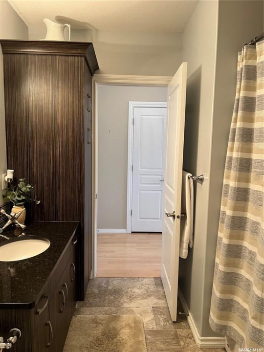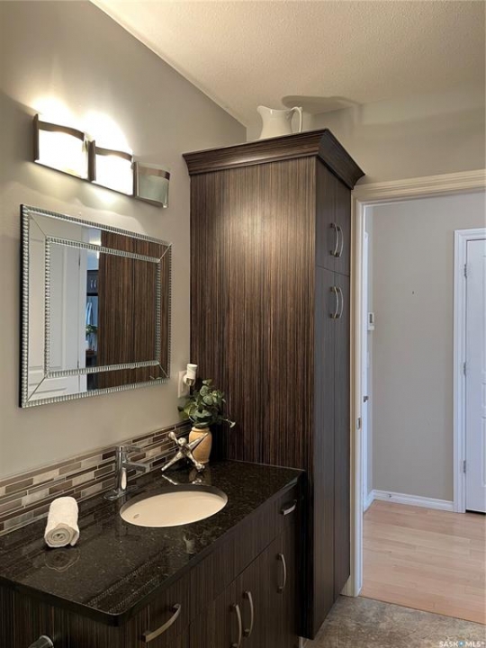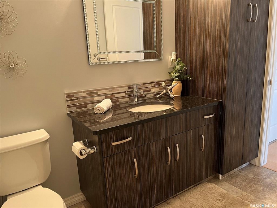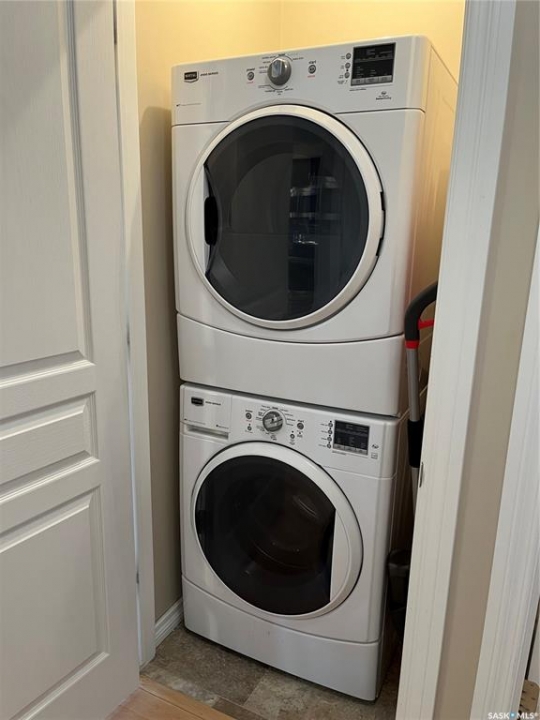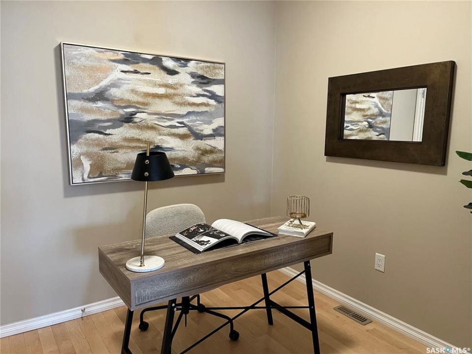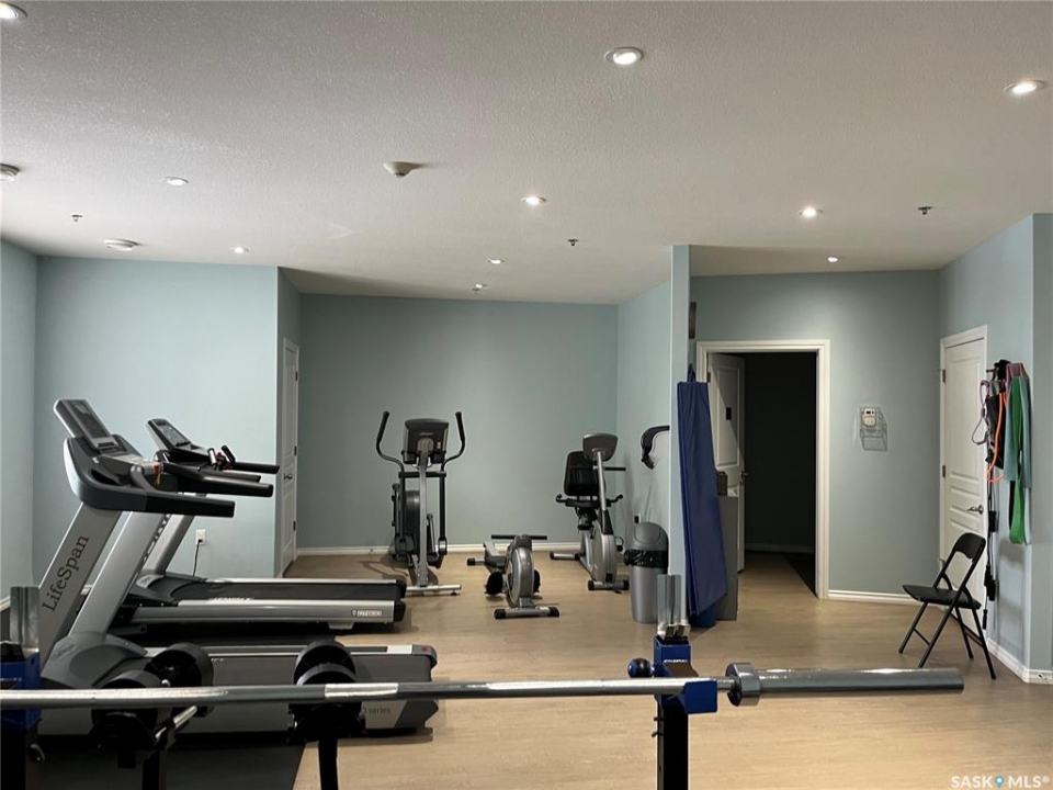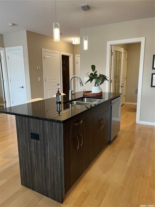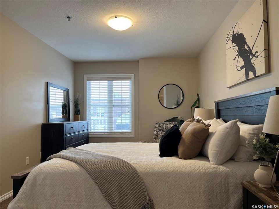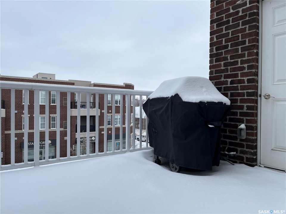 Welcome to condo living at Canterbury Common, conveniently located in the desirable Arnhem Place neighbourhood, within walking distance to Wascana Park and just minutes from downtown Regina. Residents enjoy the convenience of main-floor amenities including The Naked Bean Coffee Shop, The Lobby Kitchen and Bar, Wellness Pharmacy, and more. This well-maintained apartment-style condo offers a bright and functional layout designed for comfortable everyday living. Upon entry, you'll immediately notice the open-concept kitchen, dining, and living area, creating an inviting and cohesive space. The kitchen features granite countertops, stainless steel appliances, ample cupboard and counter space, and a large island, making it both practical and stylish. Just off the kitchen is a versatile den, ideal for a home office or guest space. A dedicated dining area provides room for a table, perfect for entertaining. The living room is filled with natural light from large windows and offers direct access to the balcony with a natural gas BBQ hookup. The primary bedroom includes a walk-in closet and dual access to the four-piece bathroom from both the bedroom and hallway. In suite laundry with a stackable washer/dryer adds to the everyday convenience. This unit also includes additional storage in the parking garage and one underground parking stall. Residents can further enjoy access to a fitness centre and amenities room. This condo delivers comfort, convenience, and lifestyle in one inviting package.