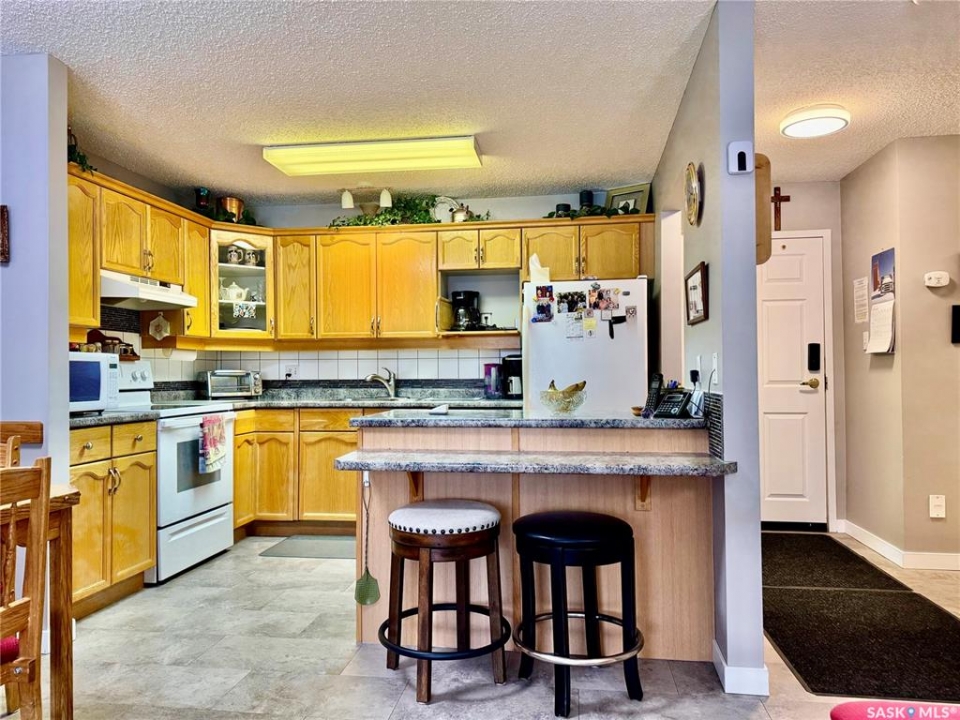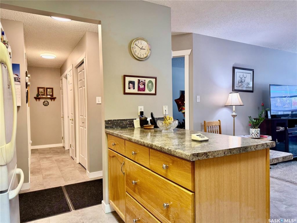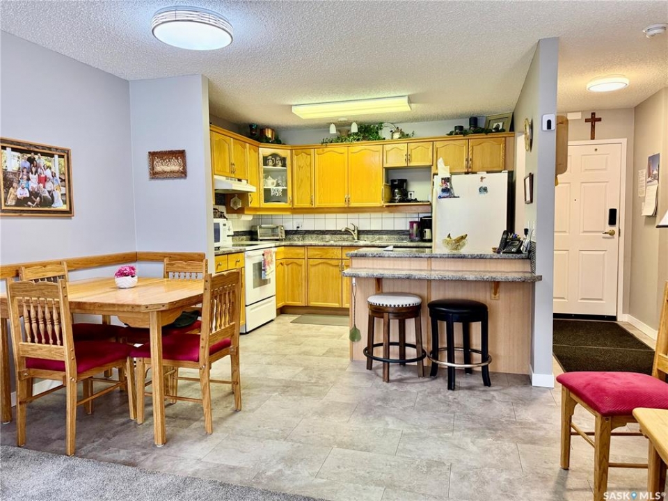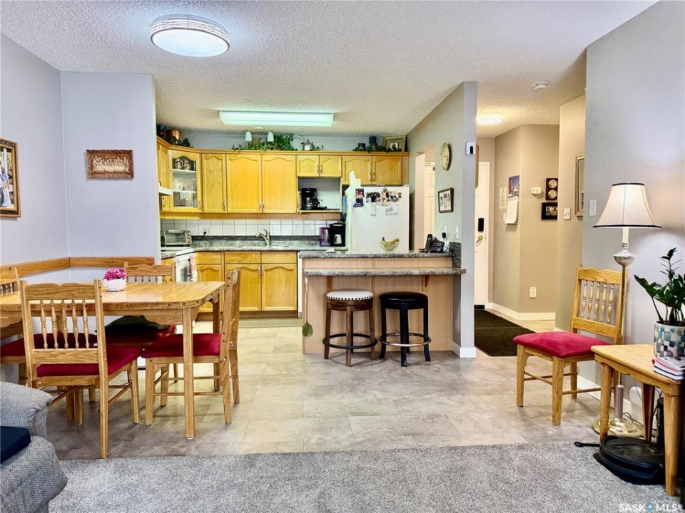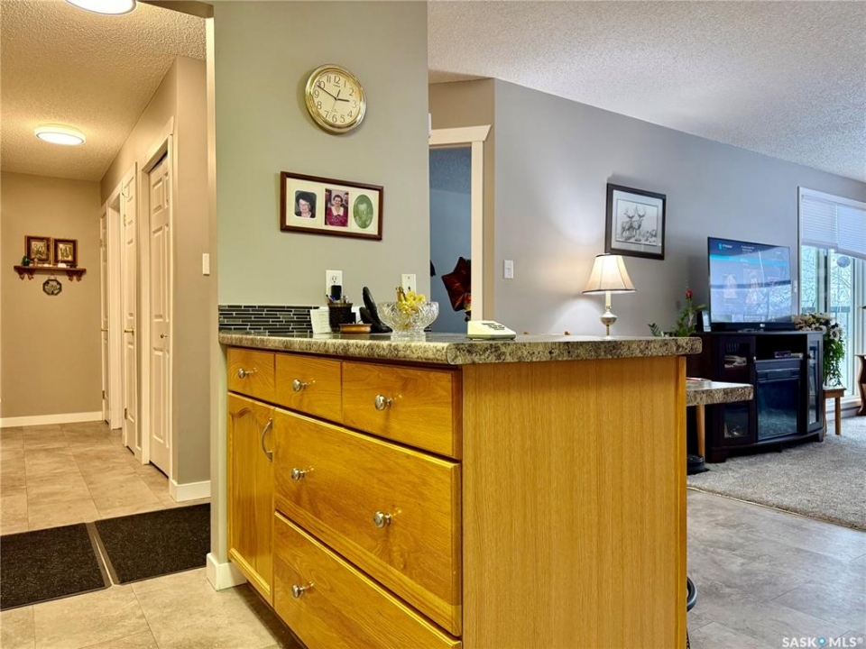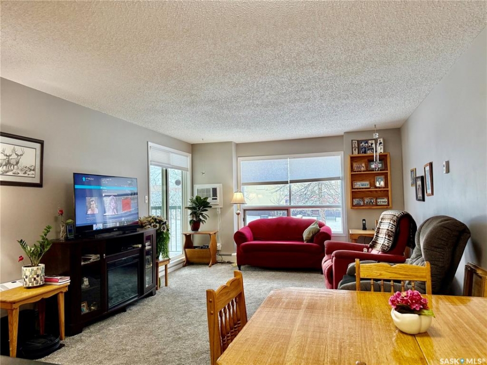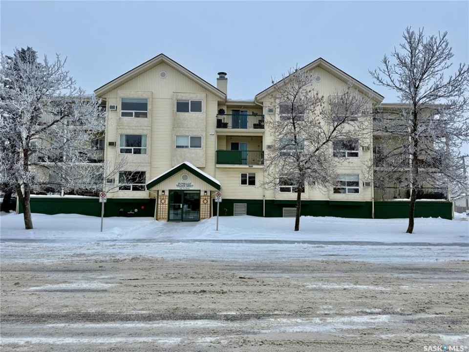 Enjoy beautiful sunsets from this well-appointed 2-bedroom condo in Village Green, conveniently located close to downtown Humboldt. A welcoming entry opens into a bright, open-concept kitchen & dining area designed for both everyday living and entertaining. The kitchen features oak cabinetry, updated countertops, & a functional island complete with eating counter and built-in storage drawers. The adjoining dining area flows seamlessly into the living room, creating an inviting and comfortable layout. There are multiple hallway closets for storage. The living room is filled with natural light from large windows & patio doors that lead out to the balcony—an ideal spot to enjoy evening sunsets or relax with your morning coffee. Both bedrooms are well sized, with the primary bedroom offering a walk-in closet. A 4-piece bathroom with tub/shower features newer flooring and a clean, modern feel. In-suite laundry adds everyday convenience and includes shelving. This unit includes one heated underground garage parking stall with a storage cabinet, as well as an additional parkade storage locker. Updates include: kitchen & bathroom countertops, fridge, and select light fixtures in 2013. Kitchen, hallway, and bathroom flooring were updated approx. 3 years ago, while the living room carpet is approximately 2 years old. The stove is about 7 years old, the built-in dishwasher approx. 2-3 years old, and several rooms have been painted over the past few years. This well-maintained building boasts a variety of amenities, including a comfortable common room for socializing & relaxing, a guest suite, elevator access, wheelchair accessibility, & secure heated underground parking. A fantastic opportunity for low-maintenance condo living in a convenient location—call today to arrange your private viewing. Form 917 - Direction Regarding Offer Presentation - There shall be no presentation of offers as per the Seller's instruction until 1:00 p.m. on mm 02 dd 09 yyyy 2026.