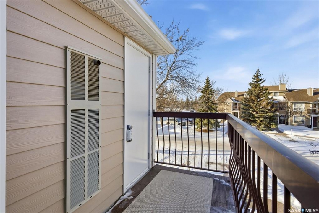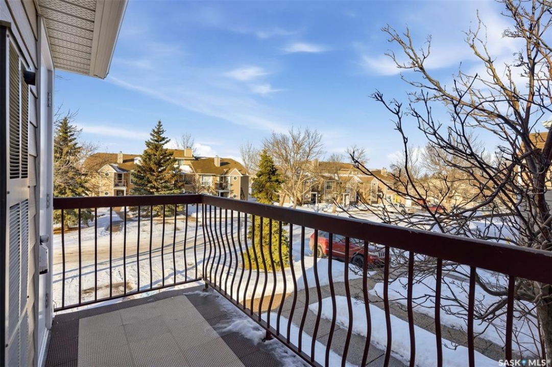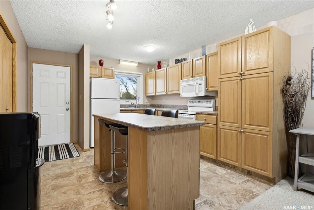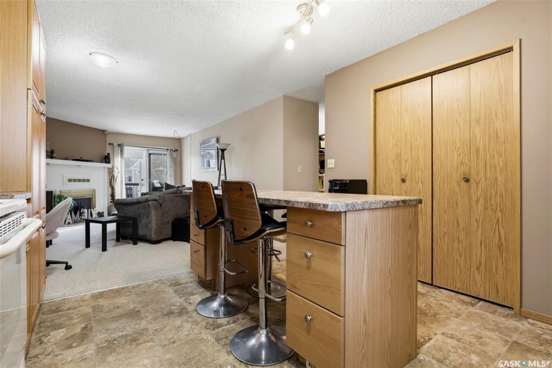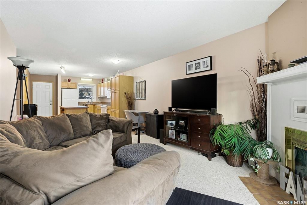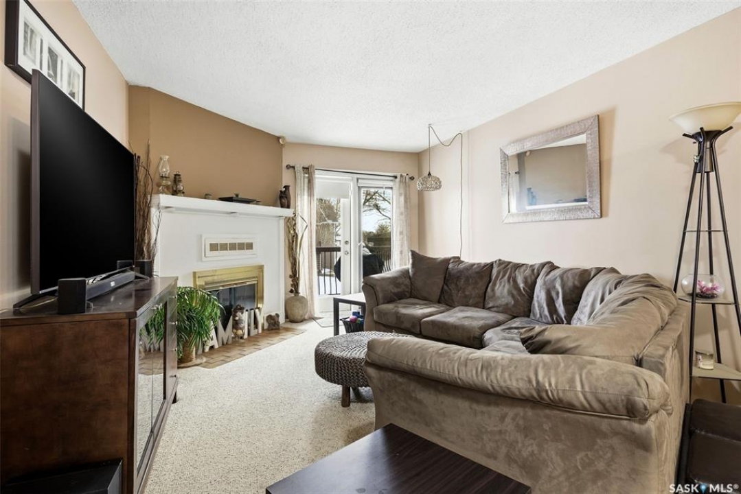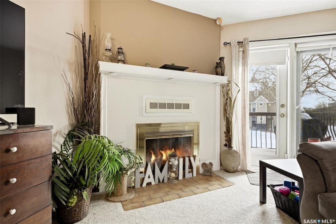 Welcome to 114 Cedar Meadow Drive! This bright and inviting second-floor condo has both a front entry and a private rear balcony. This well-designed unit benefits from extra natural light and offers a comfortable, functional layout throughout. Upon entry, you are welcomed into a spacious living area featuring a cozy fireplace (currently not in use), providing an ideal setting for relaxing or entertaining. The adjoining kitchen showcases a functional island, a double sink overlooking the front of the complex, and an abundance of cabinetry, including a pantry-style cupboard with convenient rollouts. Appliances are included with over-the-range microwave, stove, and fridge. The kitchen is finished with durable linoleum flooring. Storage is plentiful with a coat closet at the front entrance, a hallway linen closet, and an additional closet also housing the water heater and softener. The primary bedroom is generously sized and can comfortably accommodate a king-size bed, featuring his-and-hers closets for ample storage. Both bedrooms and the living room are finished with carpet for added comfort. This condo also includes its own dedicated laundry room with washer and dryer, plus extra storage space. A four-piece bathroom serves the unit, and the second bedroom offers adequate space for guests, a home office, or additional living needs. Condo fees include furnace and air conditioning maintenance, adding extra value and peace of mind. The unit measures approximately 870 square feet, and quick possession is available! Families will appreciate the conveniently located play area situated just behind the building. The parking stall is ideally positioned right out front for easy access. Additionally, there is a separate furnace room on the front deck that also provides a bit of extra storage. A practical, well-located condo offering comfort, convenience, and move-in readiness!