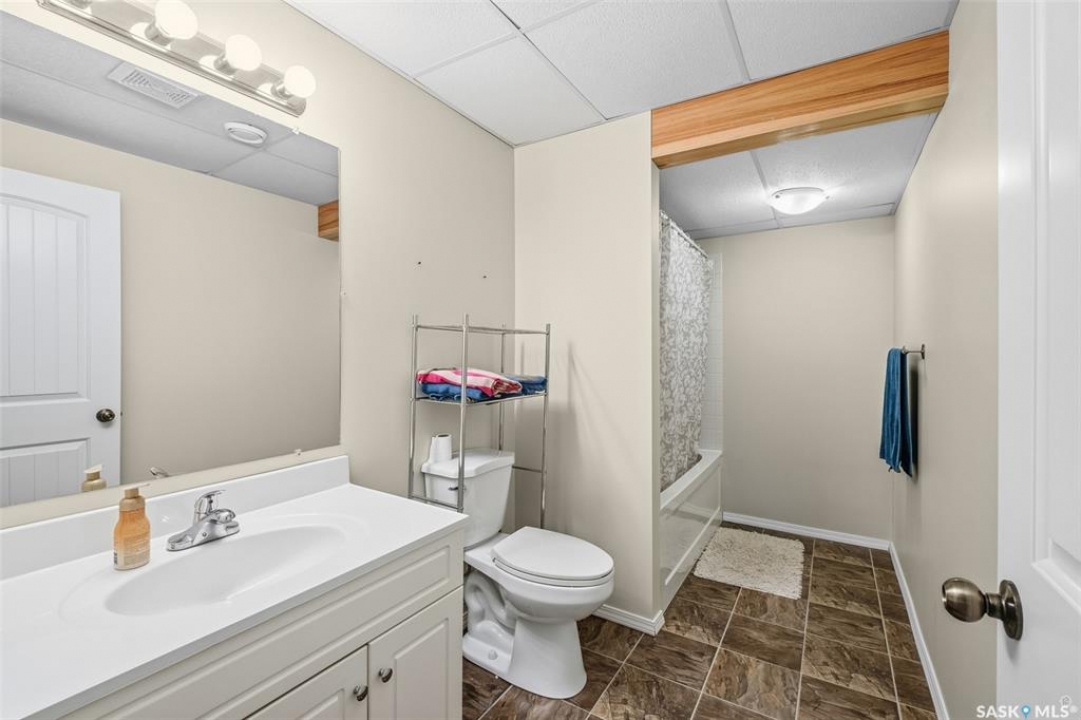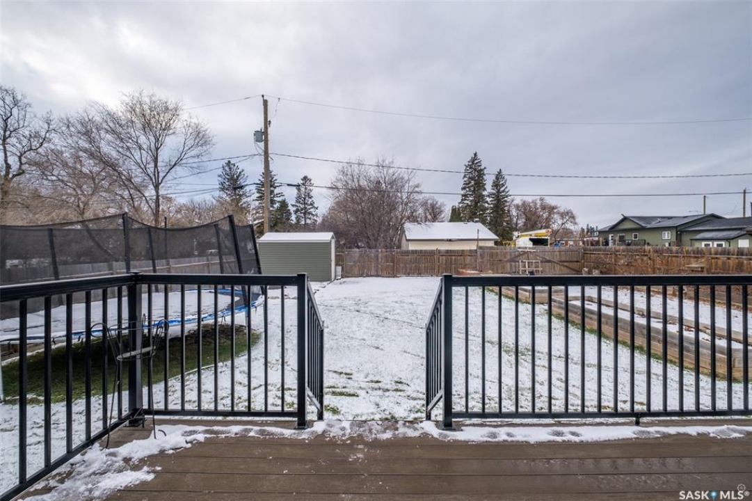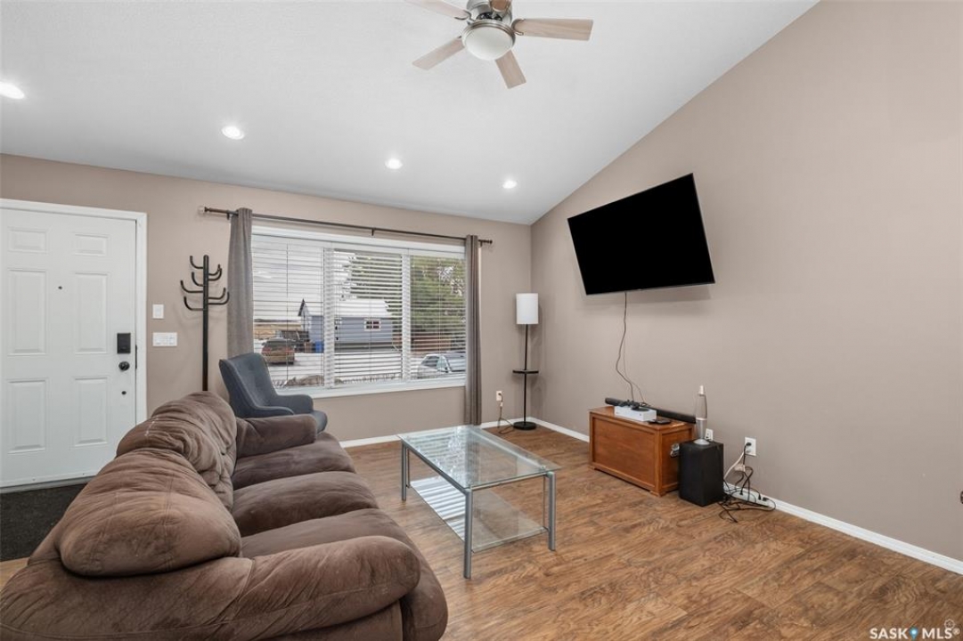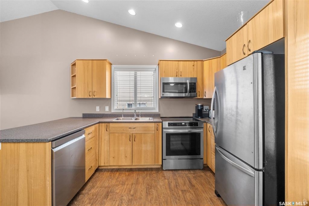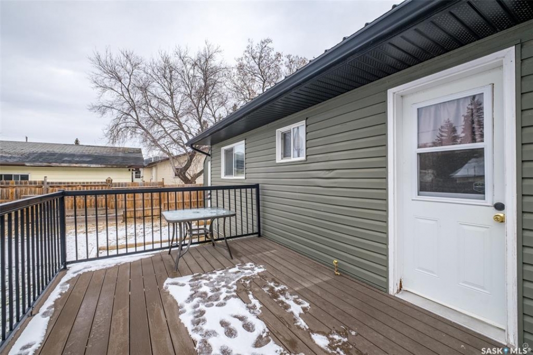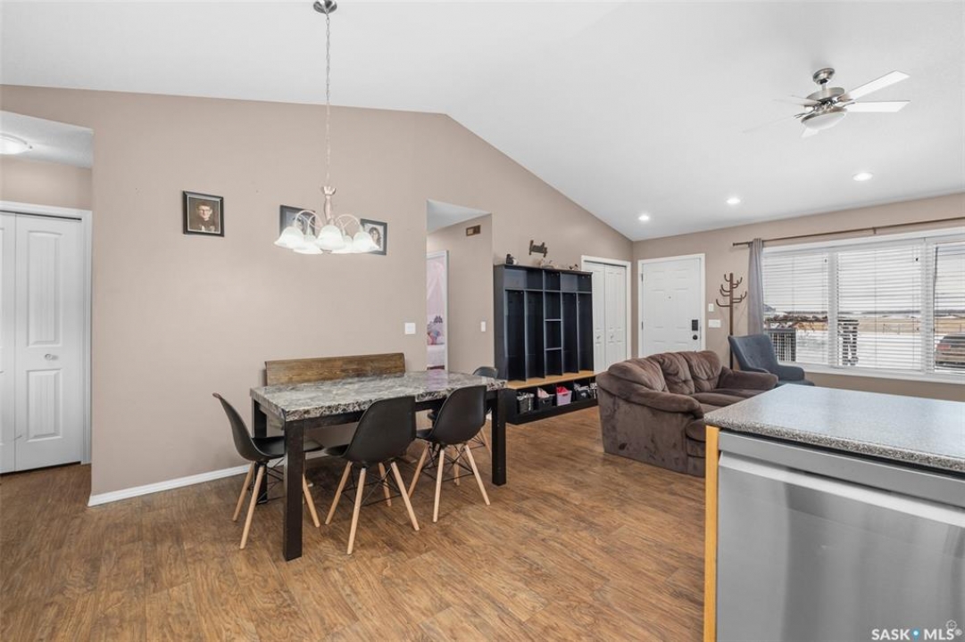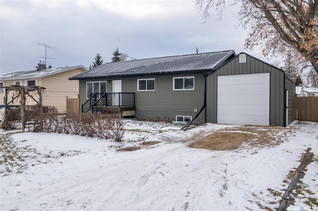 Beautiful bungalow tucked away in the quiet and peaceful community of Kinistino! As you step inside, you are greeted by vaulted ceilings and modern vinyl plank flooring that extend through the main living areas. The open concept layout includes a bright and welcoming living room with a picture window and a spacious eat-in kitchen featuring stainless steel appliances, ample cabinetry and generous counter space. The main floor also offers 3 comfortable bedrooms and a 4-piece bathroom. The fully finished basement provides a sprawling family room, an additional bedroom, a 4 piece bathroom and a combined laundry/utility room. The fully fenced and thoughtfully landscaped yard is designed for both relaxation and enjoyment. The spacious deck has a natural gas bbq hookup and provides the perfect spot for entertaining family and friends and the cozy fire pit area creates a warm gathering space. The yard also includes a garden area for those with a green thumb. A single detached 24ft x 15ft garage with drive through access to the backyard adds convenience, while a parking pad and a large gate provide additional space for parking or storage. Don't miss out on what this property has to offer. Schedule your showing today!