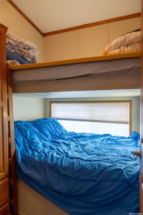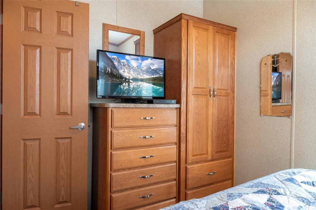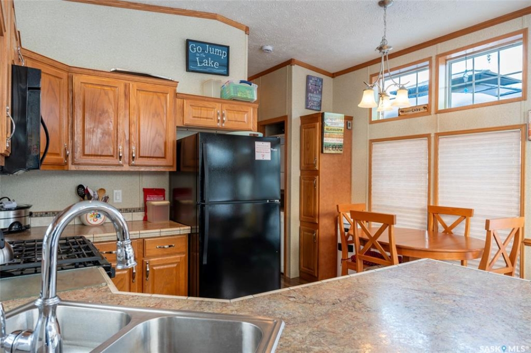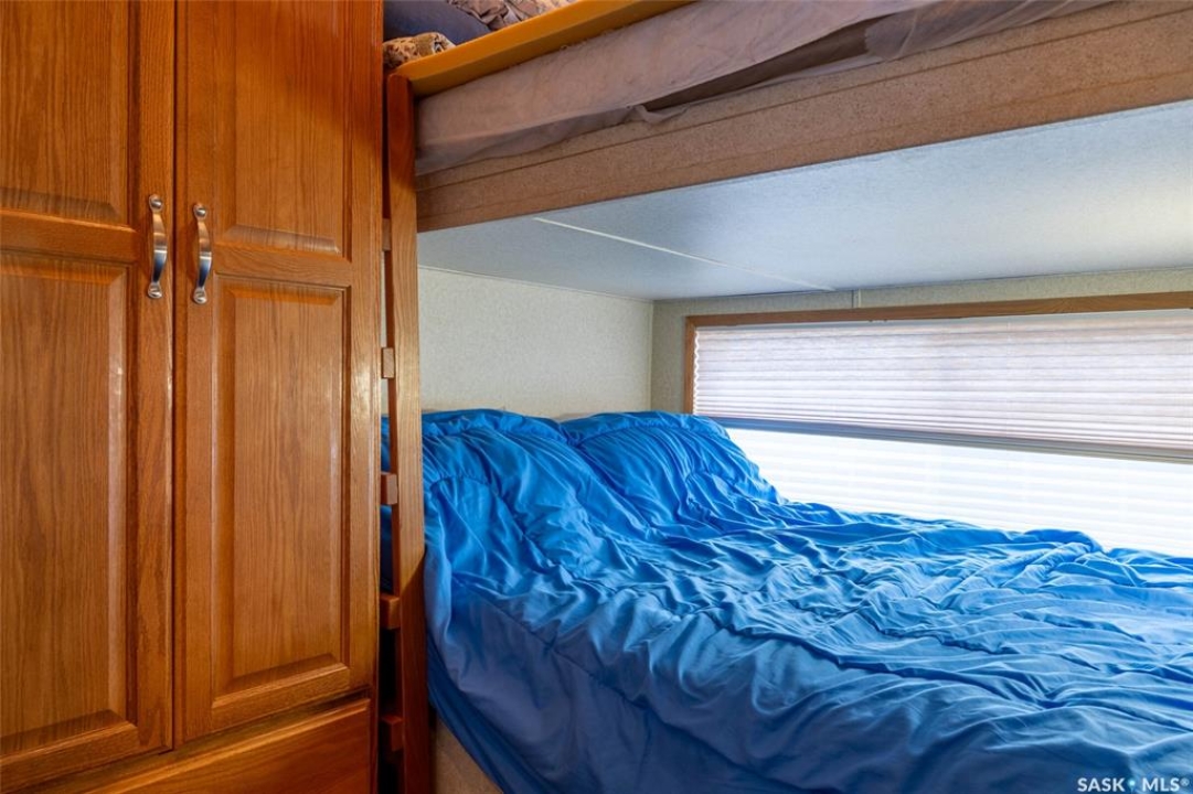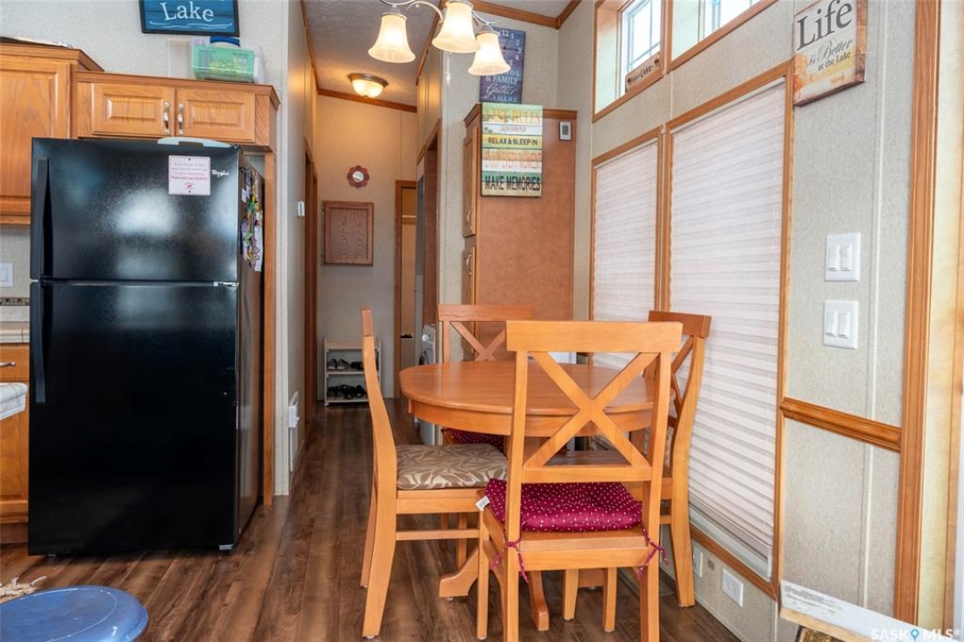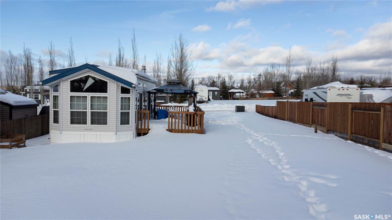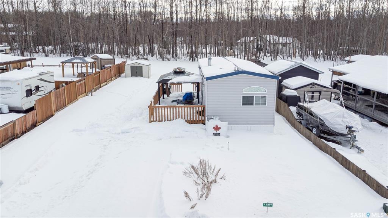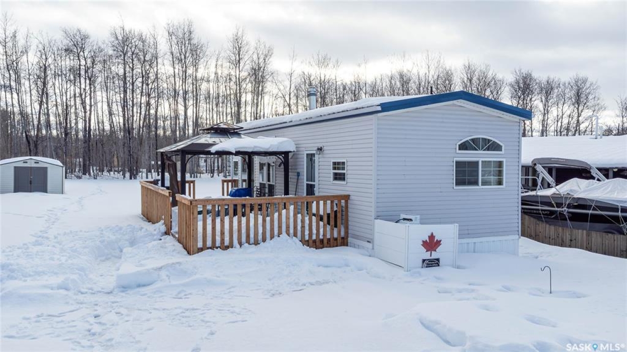 A fantastic all season escape at Lac Des Iles in Lauman's Landing. This beautiful park model trailer offers an easy retreat with the comforts of home. A full-length deck with gazebo backs onto the trees, creating a private and relaxing outdoor space, and the living room also has a southern exposure and a view of the forest. Furniture is included, so you can arrive and start enjoying right away. The layout is designed to sleep up to eight people comfortably, with built-in wardrobes in each bedroom, extra storage under the primary bed, double bunks in the second bedroom, and lofted ceilings for excellent headroom. A pullout in the living room adds even more flexibility for guests. There is a full hook-up RV spot for visitors, an 8x8 storage shed for your toys, and a woodshed to keep firewood handy for evenings around the backyard fire pit. The lake and a playground are just a short walk away, perfect for kids and adults alike. This property is only about 10 minutes to Goodsoil for groceries and essentials. Golf enthusiasts are minutes from Northern Meadows Golf Club, a well-regarded 18-hole course. It's approximately 45 minutes from Cold Lake and Meadow Lake, just over 4 hours to Edmonton and around 4 hours to Saskatoon for a full range of services and amenities. Whether you are looking for a seasonal getaway or a low-maintenance retreat, this property checks all the boxes.