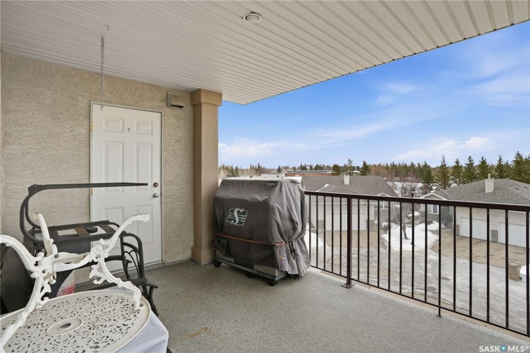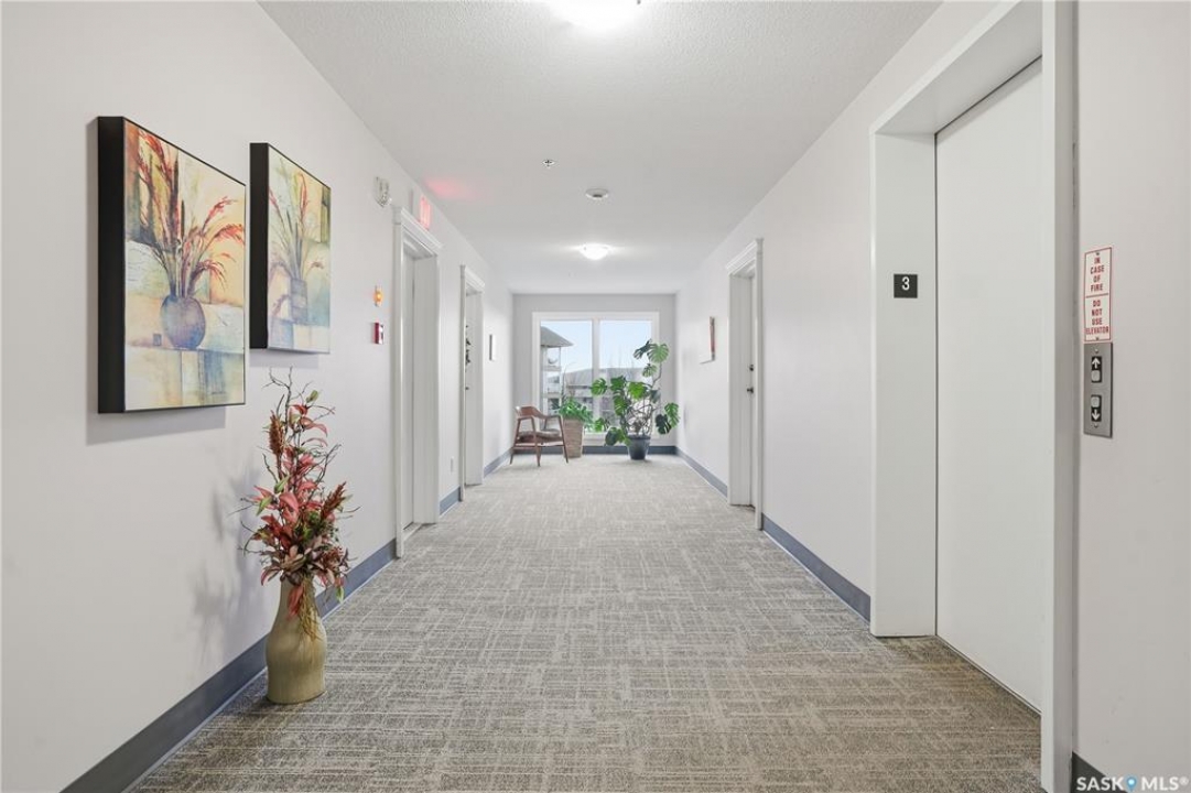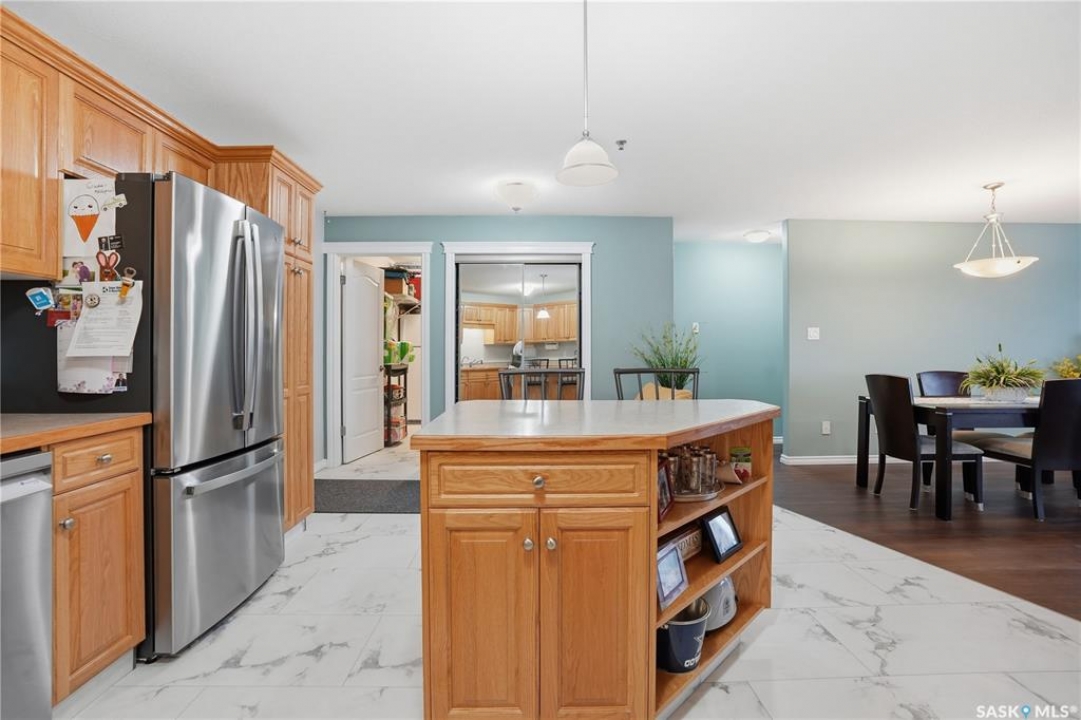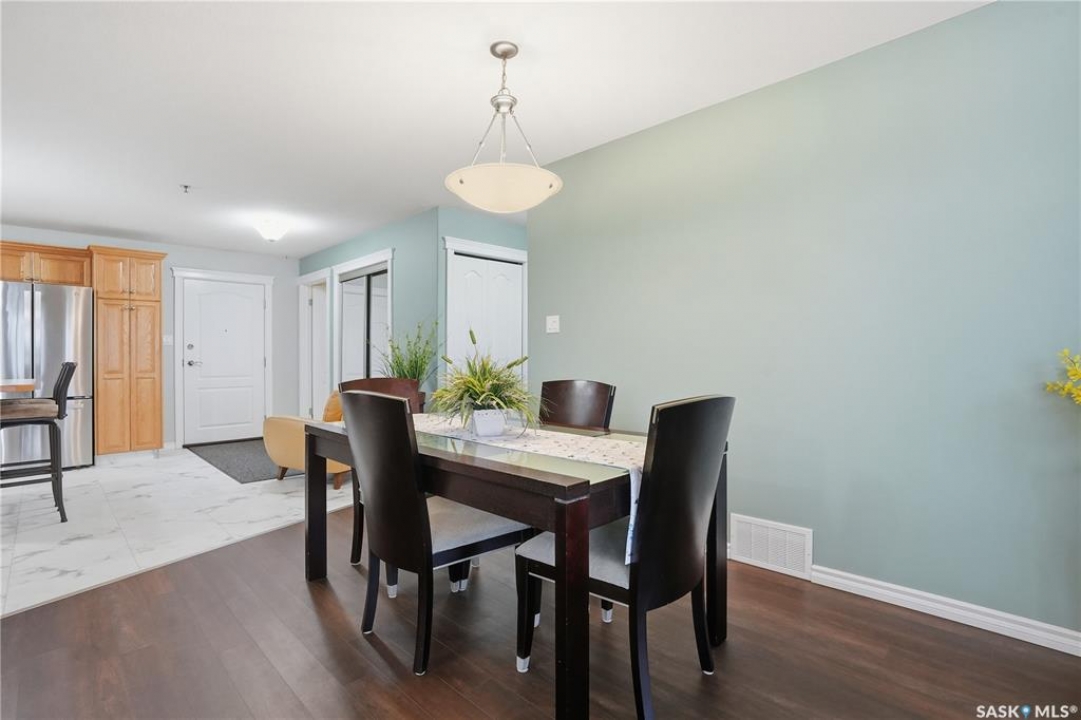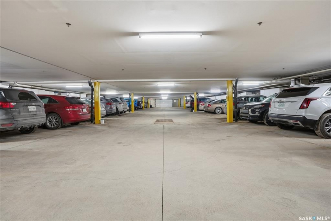 Schools, recreation, leisure and services surround Meadow Park Place in Regina's east end. If you're looking for a secure, well-cared-for home that offers a lifestyle of ease, this 3rd-floor condo is a must-see. It's open-concept, move-in ready, and designed for comfortable living. The modern kitchen is a standout, featuring plenty of counter and cupboard space, updated appliances, a built-in pantry, and a large sit-up island. The living and dining areas flow seamlessly with modern flooring, leading out to a covered, southeast facing balcony through a garden door. In the primary bedroom, you'll find a convenient walk-through closet leading to a 3-piece ensuite with a sit-down shower. The unit also includes a second good-sized bedroom, a 4-piece main bathroom, and a laundry/storage room. You'll love the convenience of your own parking stall in the underground parking garage. The building offers a common room with a kitchen, pool table, and shuffleboard that is rentable for gatherings. Condo Fees include common area insurance, maintenance, garbage, lawn care, snow removal, water, sewer, and reserve fund. This might be the right home for you, call your agent today to view.