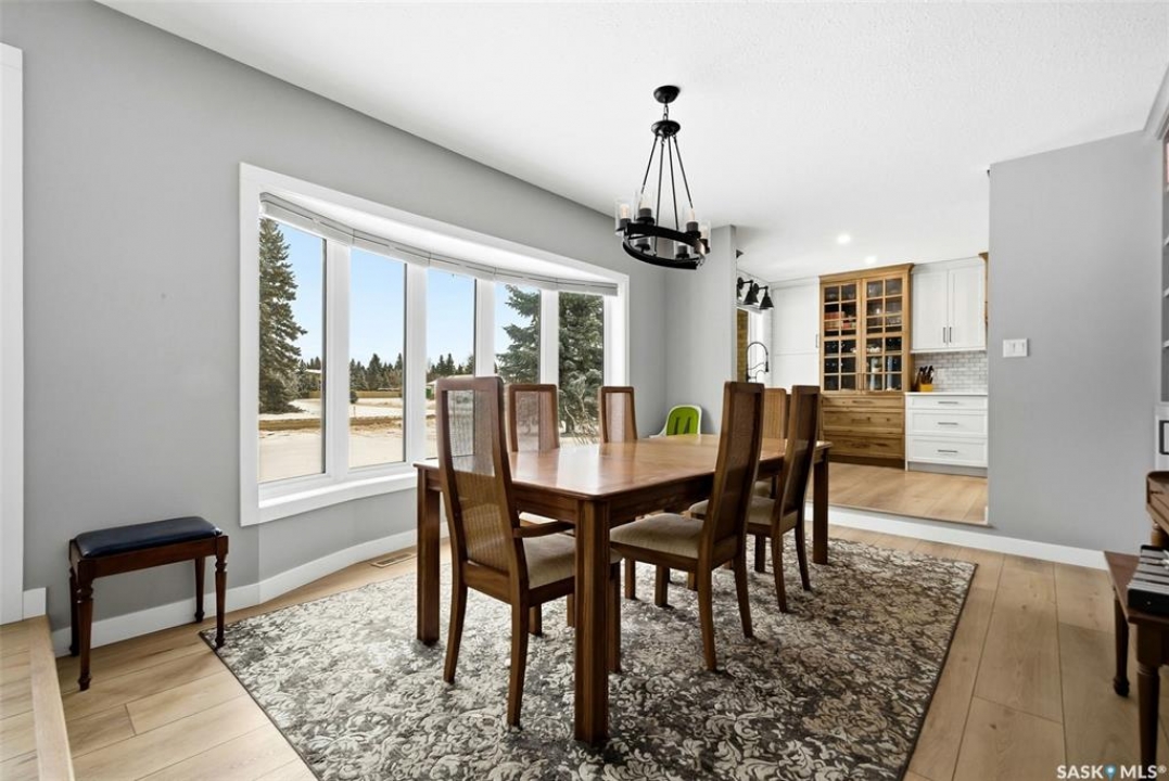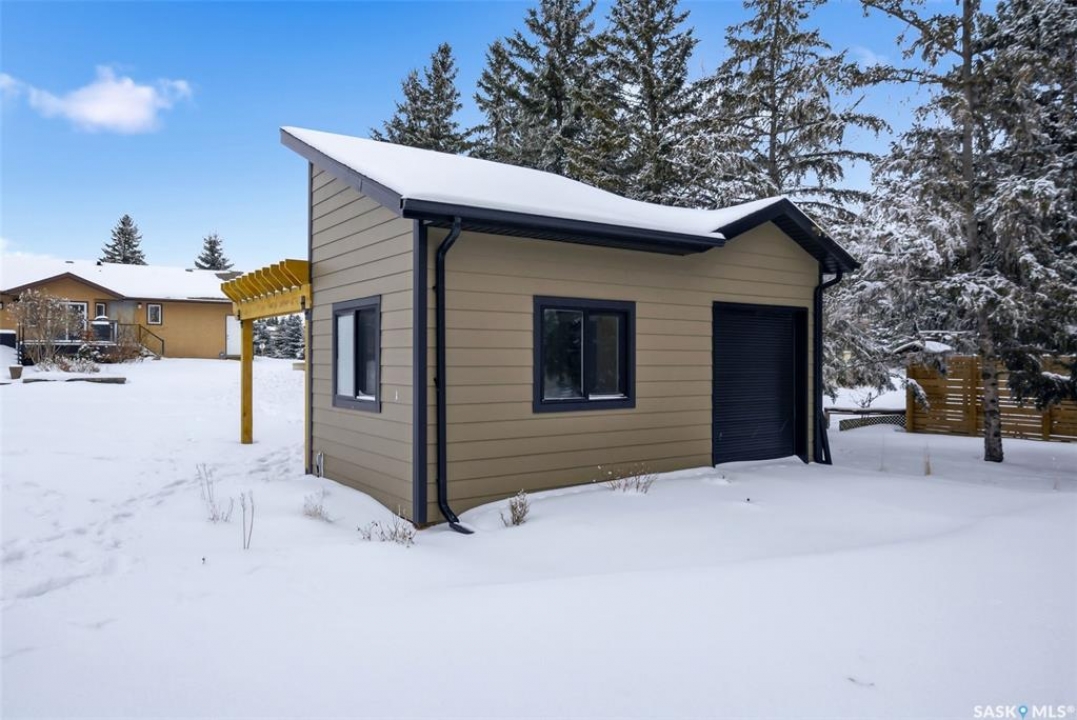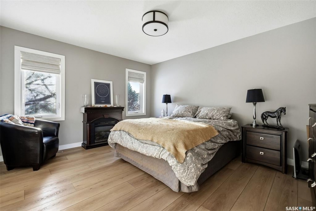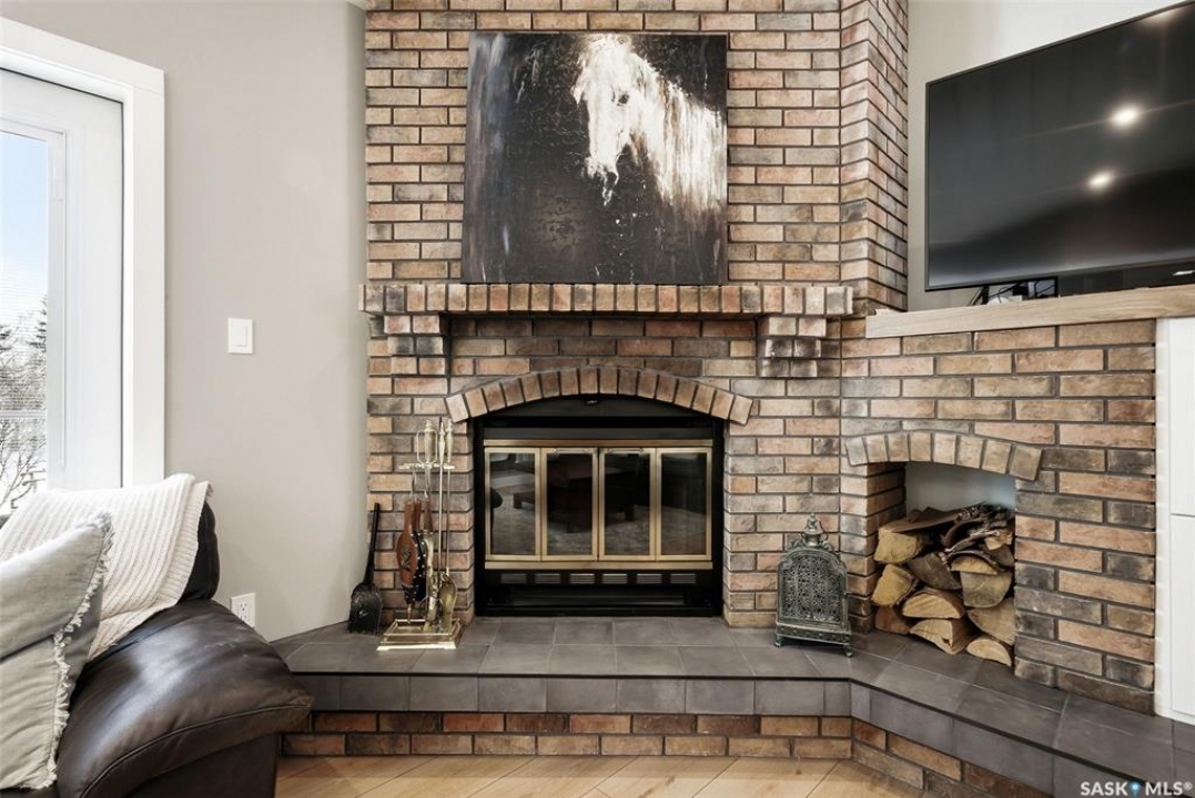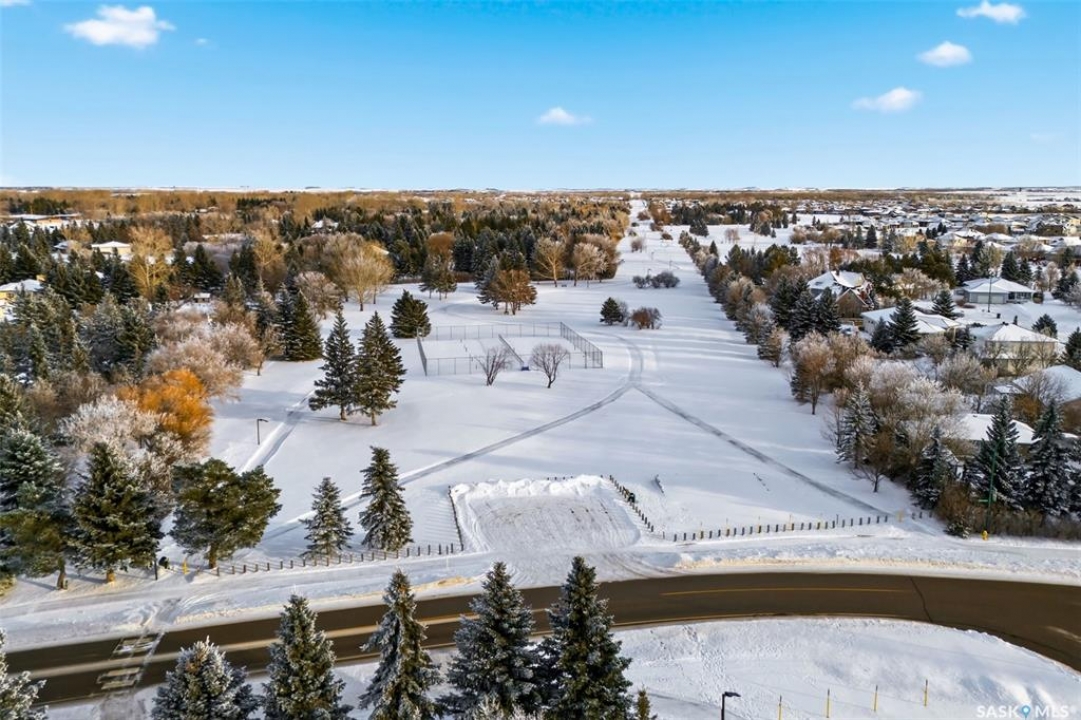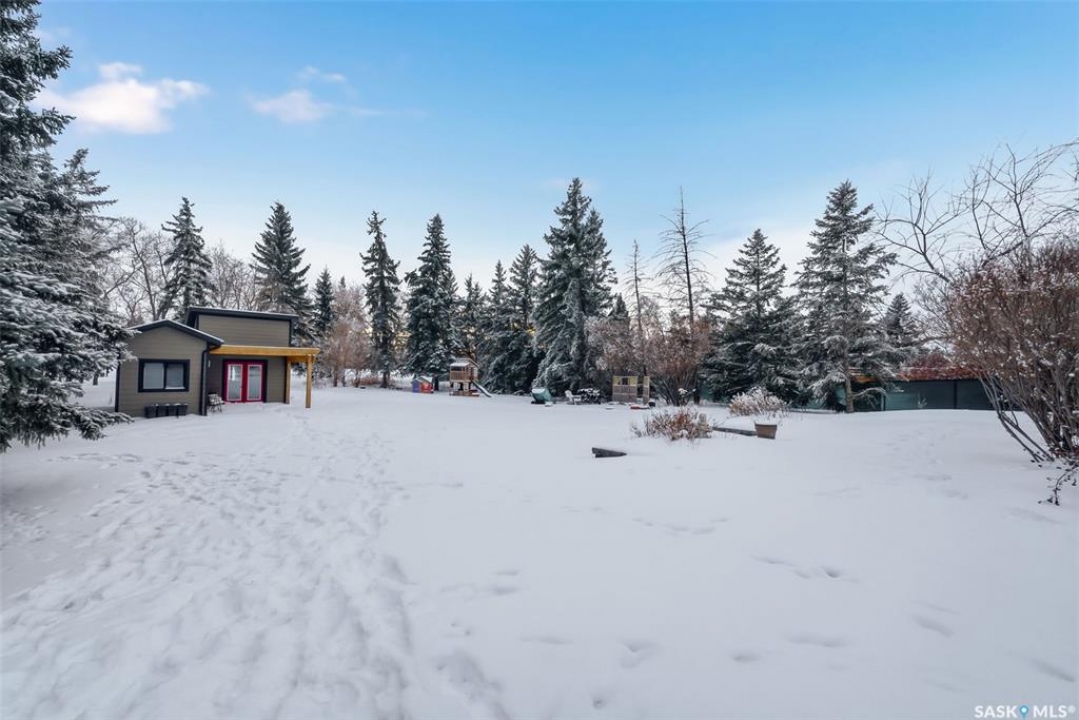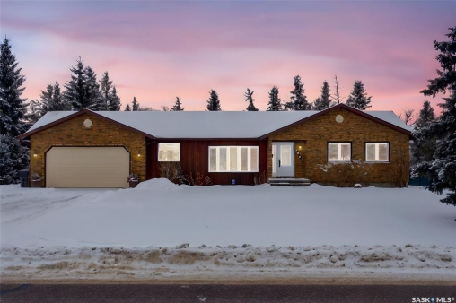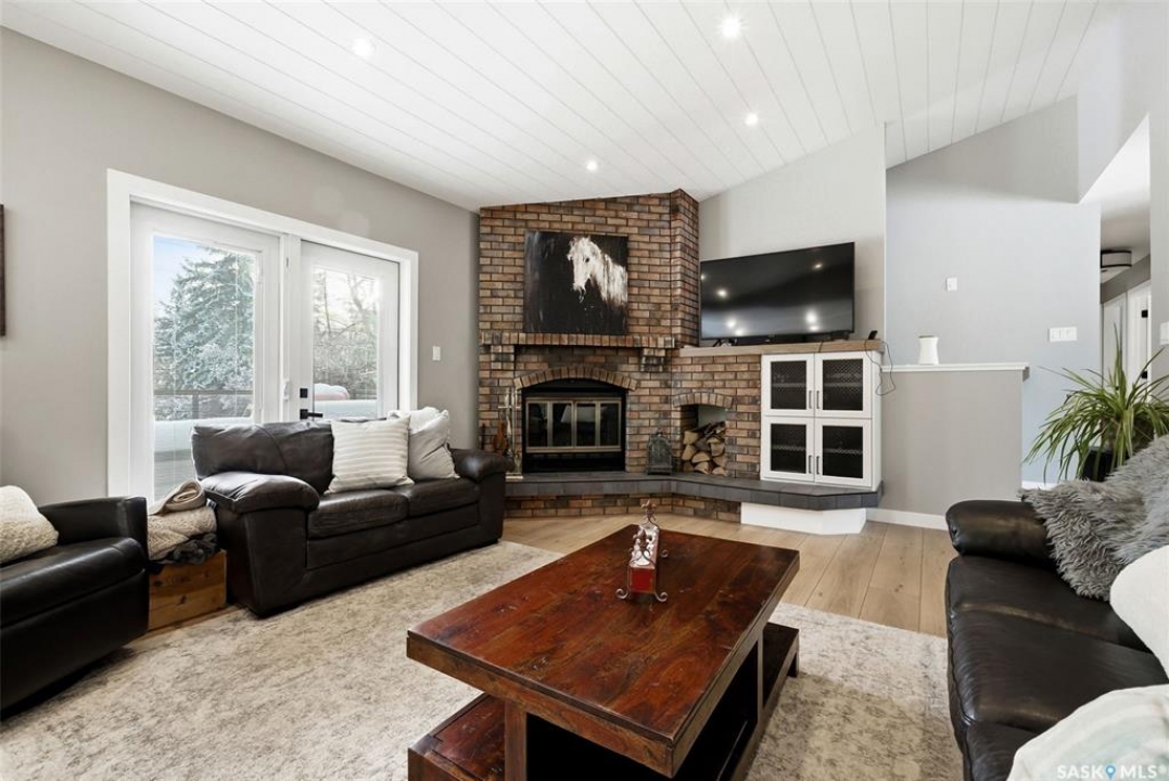 Welcome to this extensively renovated 1,468 sq. ft. bungalow in Emerald Park, situated on an impressive 30,000+ sq. ft. lot backing directly onto park space with tennis/pickleball courts and walking paths. The 2020 interior renovation completely transformed this home, featuring custom-built wood cabinetry with quartz countertops throughout, a striking two-tone kitchen with white perimeter cabinetry and contrasting dark eat-up island, marble backsplash, granite composite sink, induction range with exterior-vented hood, built-in microwave, and updated appliances. Wide vinyl plank flooring flows seamlessly through the main living areas, complemented by modern lighting and a clean, contemporary palette. The spacious dining area is filled with natural light from large picture windows, while the sunken living room showcases a beautiful brick wood-burning fireplace feature wall, creating a warm focal point. The primary bedroom offers a 3-piece ensuite, with two additional bedrooms and a 4-piece bath completing the main level, plus a convenient mudroom and 2-piece bath. The basement is partially finished with a massive recreation area, additional bedroom, 3-piece bath, and storage. Major updates and inclusions include windows, doors, shingles (2013), high-efficiency furnace, HRV, central A/C, on-demand water heater, security system, and central vac. Outside is a private retreat with mature landscaping, underground sprinklers, composite deck with glass railings (2020), brick firepit patio, and a custom-built outdoor structure with stamped concrete patio, cedar pergola, electrical, ethernet, and wiring for 220 radiant heat and overhead door opener. Double attached 22x20 garage plus double driveway offers parking for six. Well water. Patio furniture, BBQ and play structures included and riding lawnmower negotiable. This is turnkey Emerald Park living with luxury finishes and exceptional indoor-outdoor space, truly one of a kind!