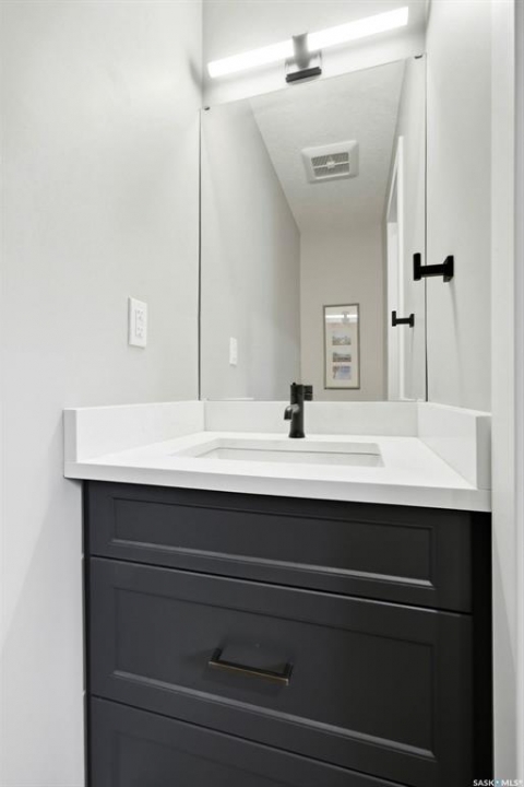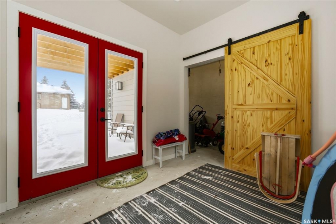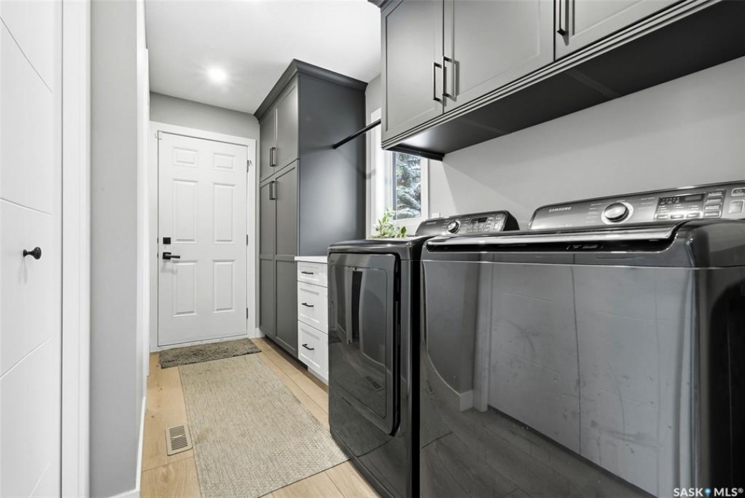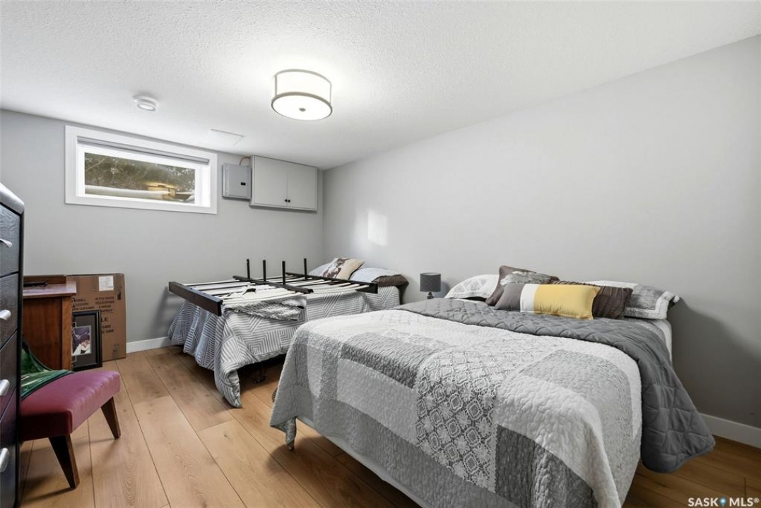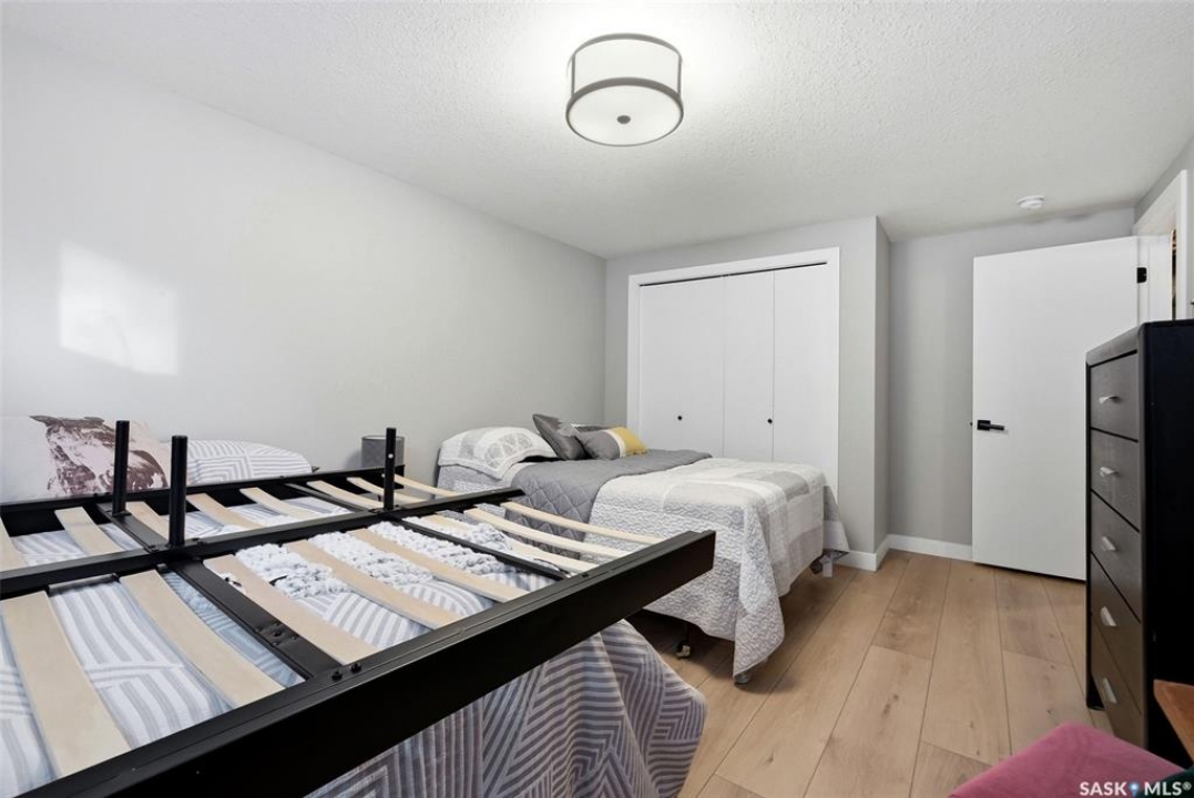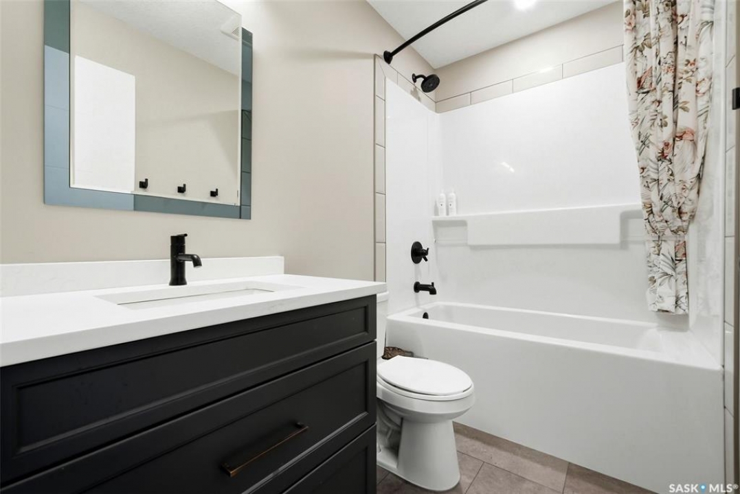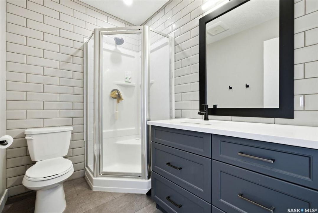 Welcome to this extensively renovated 1,468 sq. ft. bungalow in Emerald Park, situated on an impressive 30,000+ sq. ft. lot backing directly onto park space with tennis/pickleball courts and walking paths. The 2020 interior renovation completely transformed this home, featuring custom-built wood cabinetry with quartz countertops throughout, a striking two-tone kitchen with white perimeter cabinetry and contrasting dark eat-up island, marble backsplash, granite composite sink, induction range with exterior-vented hood, built-in microwave, and updated appliances. Wide vinyl plank flooring flows seamlessly through the main living areas, complemented by modern lighting and a clean, contemporary palette. The spacious dining area is filled with natural light from large picture windows, while the sunken living room showcases a beautiful brick wood-burning fireplace feature wall, creating a warm focal point. The primary bedroom offers a 3-piece ensuite, with two additional bedrooms and a 4-piece bath completing the main level, plus a convenient mudroom and 2-piece bath. The basement is partially finished with a massive recreation area, additional bedroom, 3-piece bath, and storage. Major updates and inclusions include windows, doors, shingles (2013), high-efficiency furnace, HRV, central A/C, on-demand water heater, security system, and central vac. Outside is a private retreat with mature landscaping, underground sprinklers, composite deck with glass railings (2020), brick firepit patio, and a custom-built outdoor structure with stamped concrete patio, cedar pergola, electrical, ethernet, and wiring for 220 radiant heat and overhead door opener. Double attached 22x20 garage plus double driveway offers parking for six. Well water. Patio furniture, BBQ and play structures included and riding lawnmower negotiable. This is turnkey Emerald Park living with luxury finishes and exceptional indoor-outdoor space, truly one of a kind!