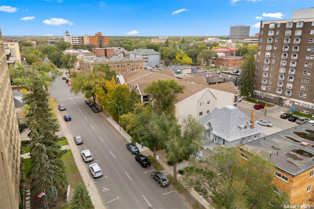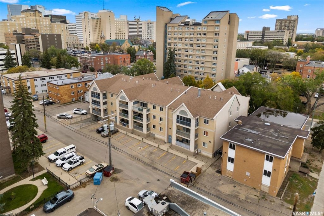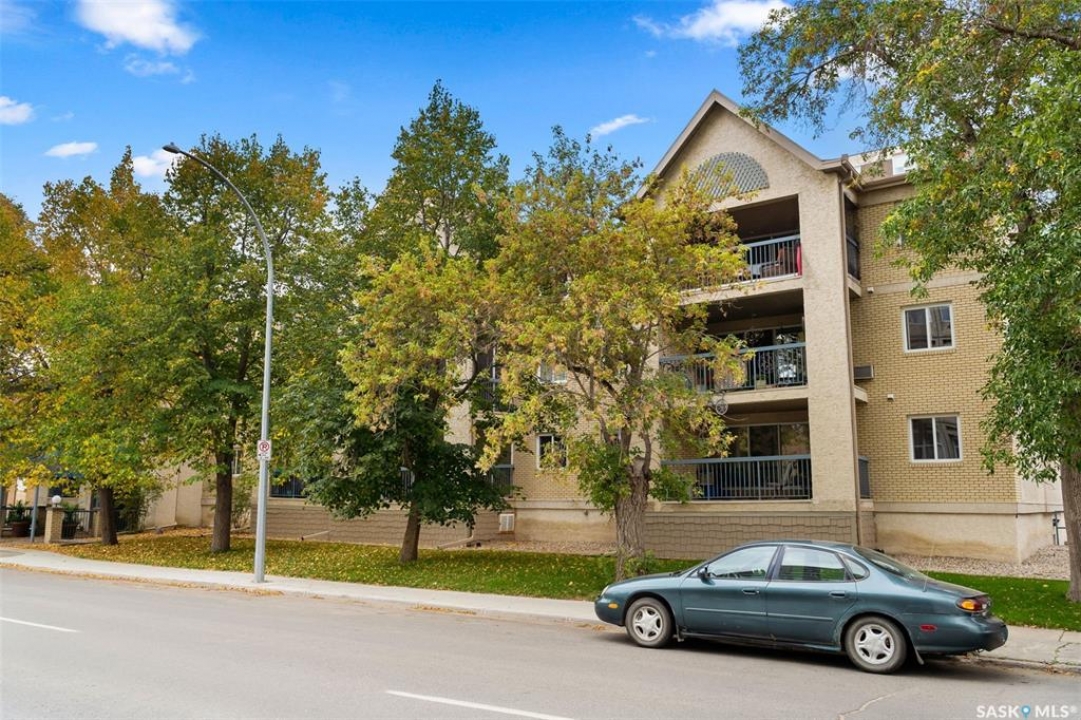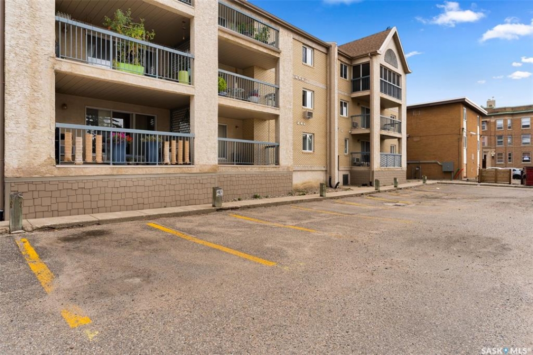 Welcome to this spacious and thoughtfully designed one-bedroom, one-bathroom condo in the heart of downtown. Inside, you'll find a well-appointed kitchen with generous counter space and a layout that comfortably accommodates two people. The in-suite laundry room and dedicated storage add convenience, while engineered hardwood floors, granite countertops, newer cabinets, and updated fixtures elevate the overall aesthetic. The bedroom easily fits a king-size bed along with additional furniture, and features a large walk-in closet for ample storage. Step outside to a covered 18' x 10'9 patio—perfect for summer gatherings, rain or shine—with room for a table, chairs, and a barbecue. All 4 appliances and a bar fridge are included. Although pets are not permitted, the location offers unbeatable access to all downtown amenities just a short walk away. Residents enjoy one electrified surface parking stall and access to beautifully refreshed common areas, including new carpets, fresh paint, a modernized elevator, new boiler and an updated amenities room complete with a lounge and bar area. This well-managed building is ready to welcome its next owner. Condo fees cover heat, water, garbage removal, common area maintenance, building insurance, and reserve fund contributions. Visitor parking is available at the rear of the building —contact your Realtor today to book your showing.