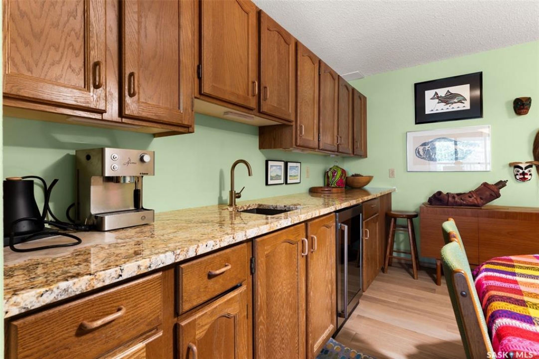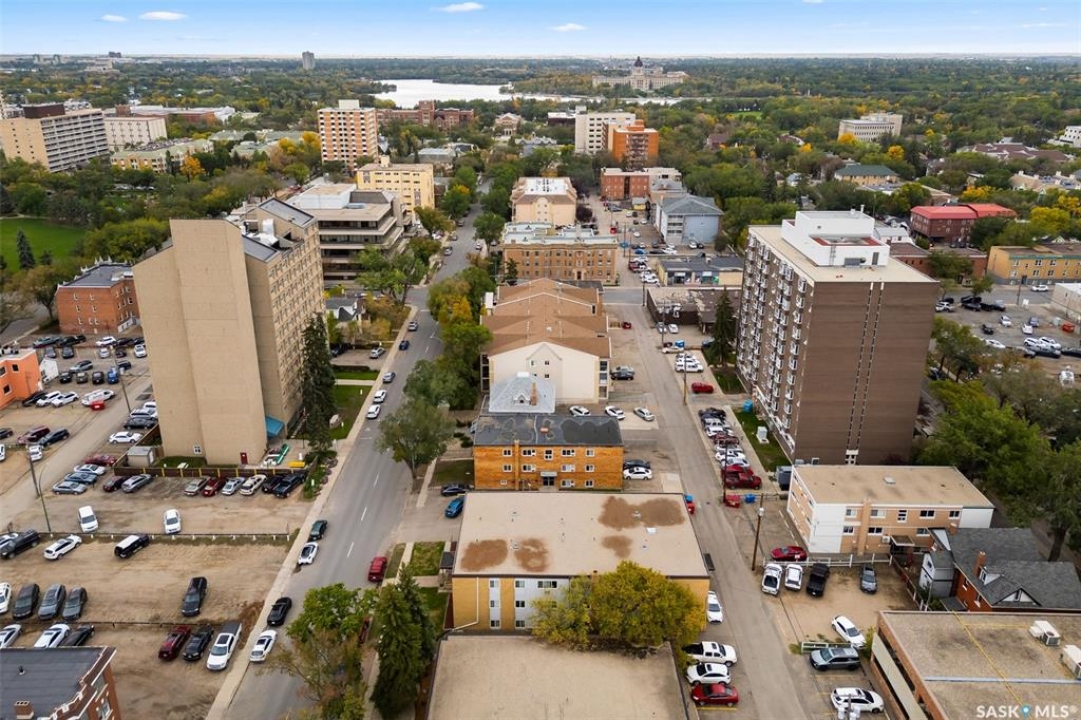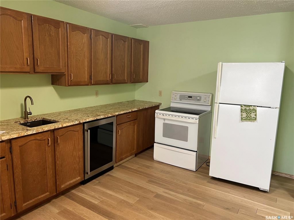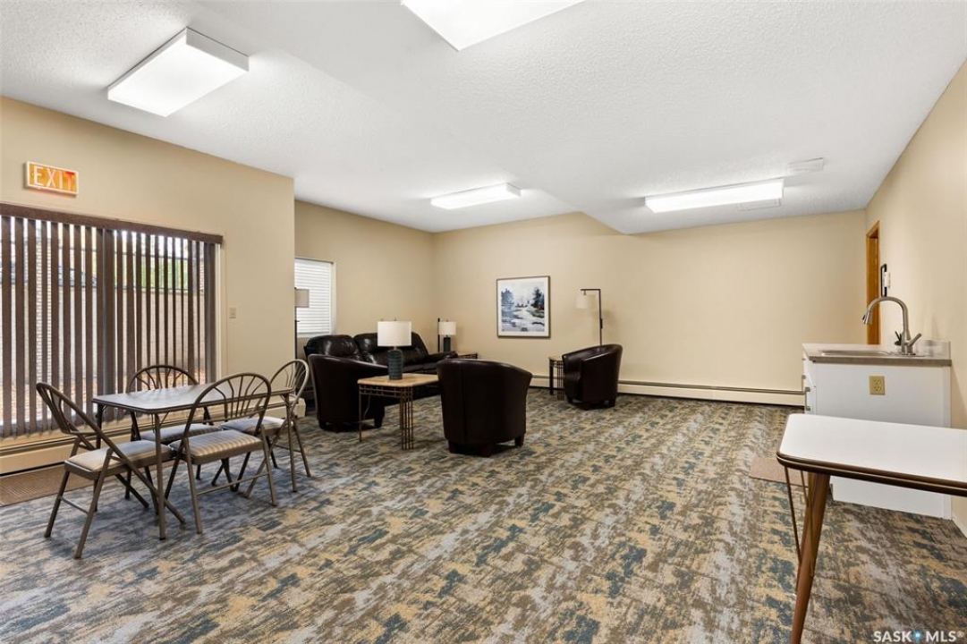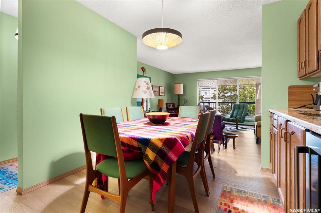 Welcome to this spacious and thoughtfully designed one-bedroom, one-bathroom condo in the heart of downtown. Inside, you'll find a well-appointed kitchen with generous counter space and a layout that comfortably accommodates two people. The in-suite laundry room and dedicated storage add convenience, while engineered hardwood floors, granite countertops, newer cabinets, and updated fixtures elevate the overall aesthetic. The bedroom easily fits a king-size bed along with additional furniture, and features a large walk-in closet for ample storage. Step outside to a covered 18' x 10'9 patio—perfect for summer gatherings, rain or shine—with room for a table, chairs, and a barbecue. All 4 appliances and a bar fridge are included. Although pets are not permitted, the location offers unbeatable access to all downtown amenities just a short walk away. Residents enjoy one electrified surface parking stall and access to beautifully refreshed common areas, including new carpets, fresh paint, a modernized elevator, new boiler and an updated amenities room complete with a lounge and bar area. This well-managed building is ready to welcome its next owner. Condo fees cover heat, water, garbage removal, common area maintenance, building insurance, and reserve fund contributions. Visitor parking is available at the rear of the building —contact your Realtor today to book your showing.