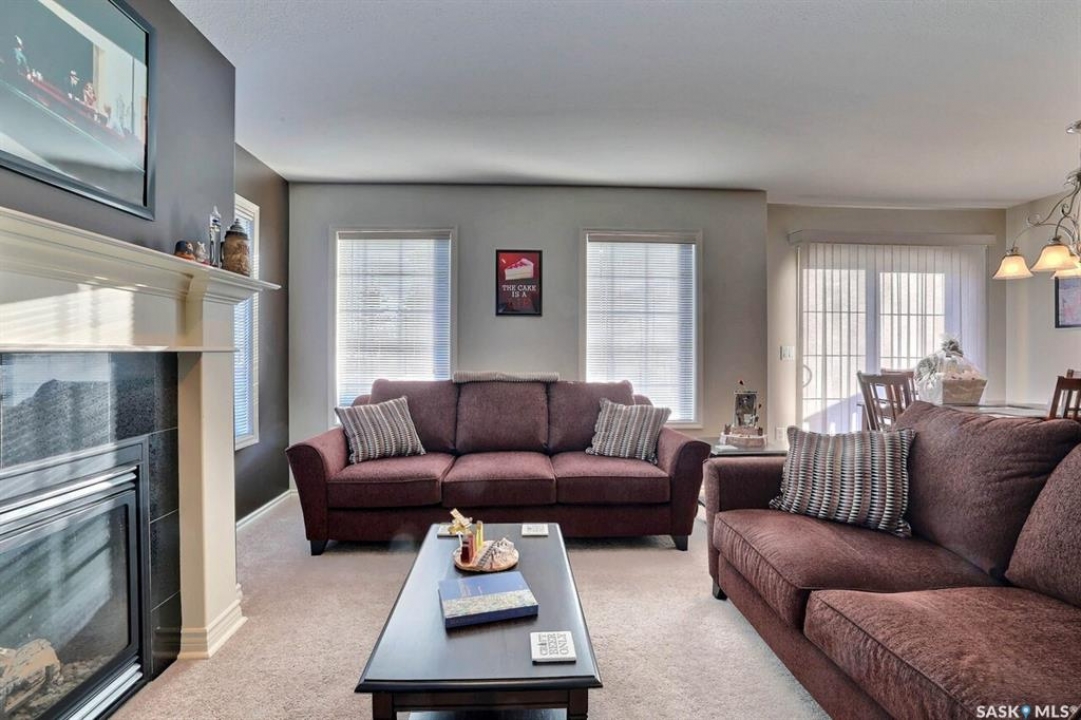 Beautifully located two storey condo in Regina's sought after east end with green space, and water views right out front. This 3 bedroom, 3 bathroom home offers a bright, functional layout and is truly move in ready. The main floor features an open concept design with large windows that bring in plenty of natural light, a cozy natural gas fireplace, and direct entry to the single attached garage. The kitchen showcases maple cabinetry, an oversized island perfect for entertaining, and a dining area with patio doors leading to your private outdoor space. Upstairs you will find three comfortable bedrooms, all with double closets, along with a full bathroom featuring a skylight that adds beautiful natural light to the space. The fully developed basement provides additional living space with a rec room, a 3 piece bathroom, and a separate laundry area