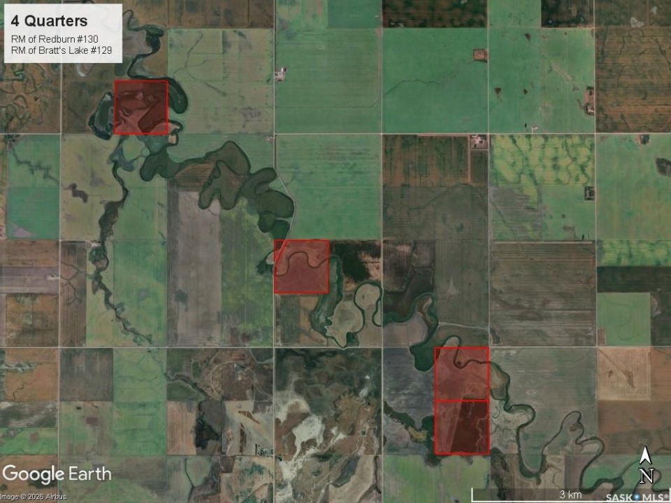 Four quarter sections for sale located west of Wilcox, SK in the RM of Bratt's Lake #129 & RM of Redburn #130. These four quarters are predominantly crop land with some native grass acres. SAMA Field Sheets identify 371 cultivated acres and 120 native acres. The land is all rated T1 – level to nearly level topography. The cultivated acres are rated S1 – none to few stones. Location & Access: There is access to most of this land via grid roads. Occupancy: The land is available for immediate occupancy (there is no lease in place). ASKING PRICE: $995,000.00 $2,179.09/Titled Acre, 1.39 x 2025 SAMA Assessed Value. Offers to be submitted to Sellers Brokerage in writing on or before March 24, 2026 at 12:00PM. Highest or any offer not necessarily accepted.