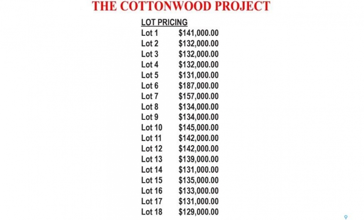 Welcome to Cottonwood Project — Weyburn's exciting, new residential neighborhood development! Nestled in a beautifully treed area in a developed residential location, the Cottonwood Project offers an opportunity previously unavailable in Weyburn - the chance to build your dream home among large, mature trees and be located within the heart of the city rather than restricted to a fringe area as with other residential lot developments. The Cottonwood Project is bordered by 13th St. on one side, Hartney Ave on another, and Ashford St. on the back. It is a cross from St. Michael School - Weyburn's only Catholic School (pre-K to Grade 9). Additionally, it is within easy walking distance to public schools, Jubilee Park( the central location for baseball, soccer,, tennis), the City leisure Centre and outdoor pool, and more. With a variety of sizes, there are lots for everyone. From pie-shaped lots, to elongated lots and standard rectangular options - you won't be disappointed. Kenney Crescent is a central L-Shaped road which services the neighborhood, creating that community feel. If you've been looking for that perfect place to build your family home but haven't been satisfied with the current options, check out the Cottonwood Project.