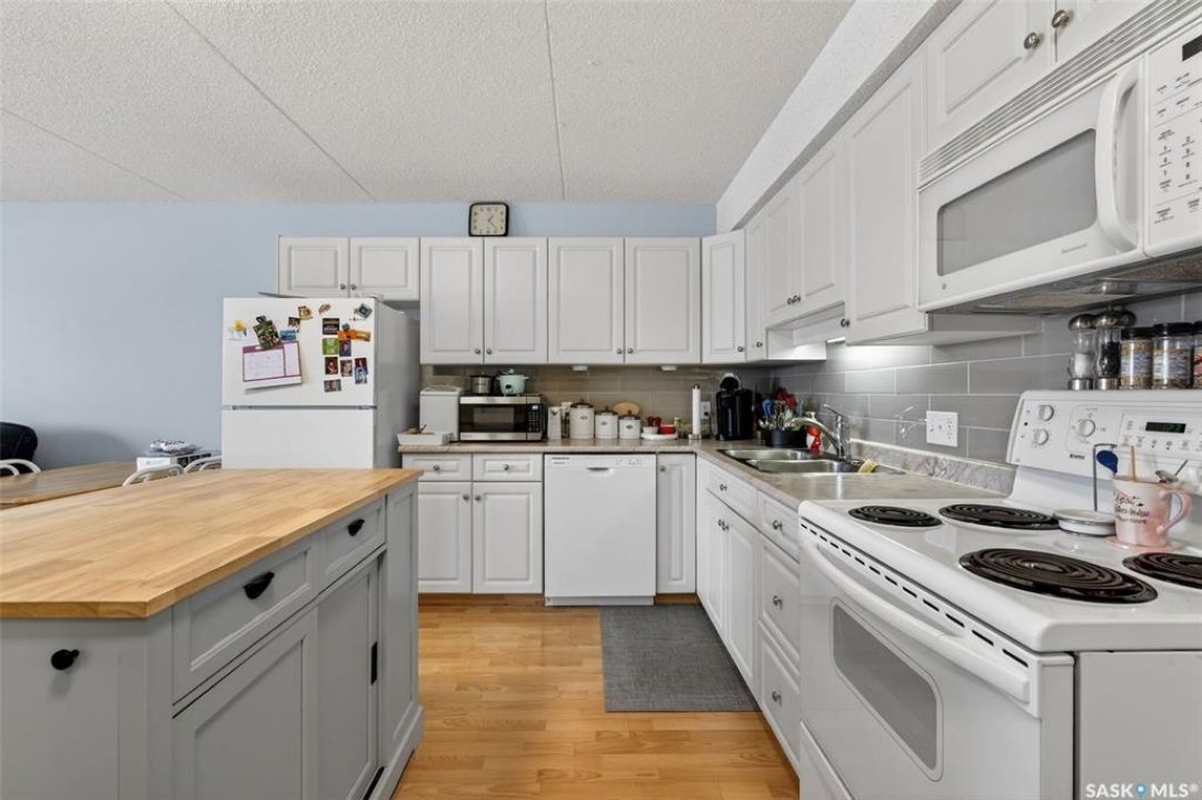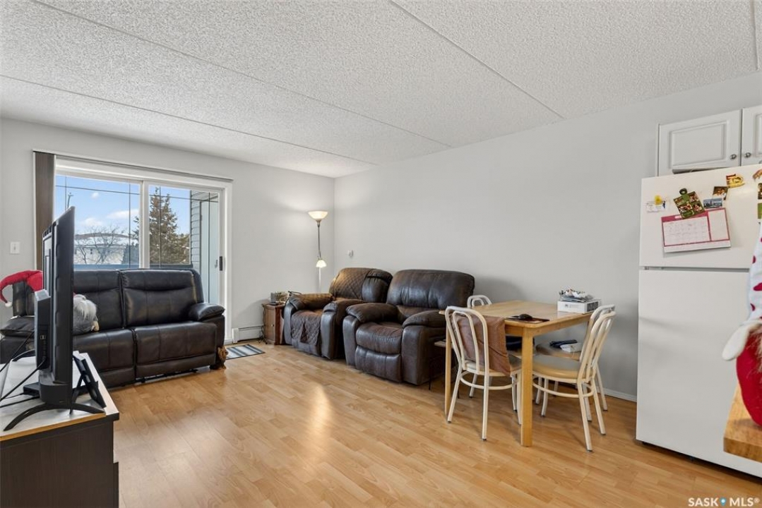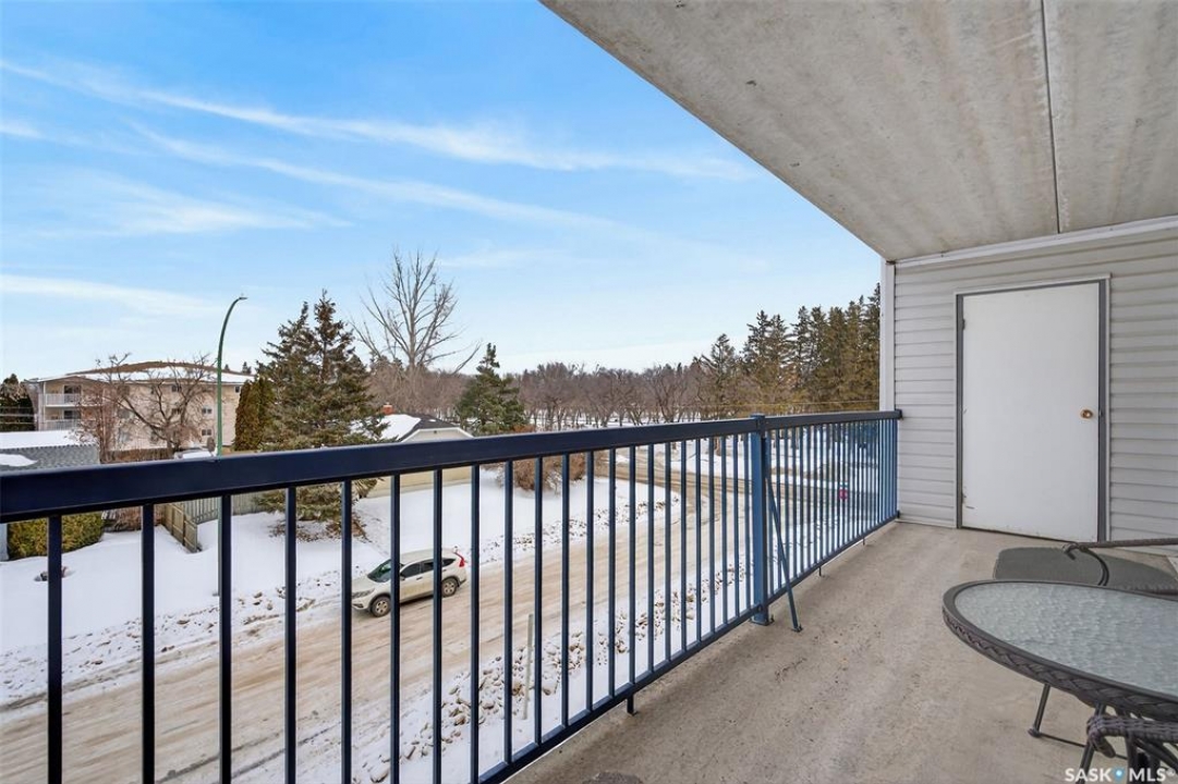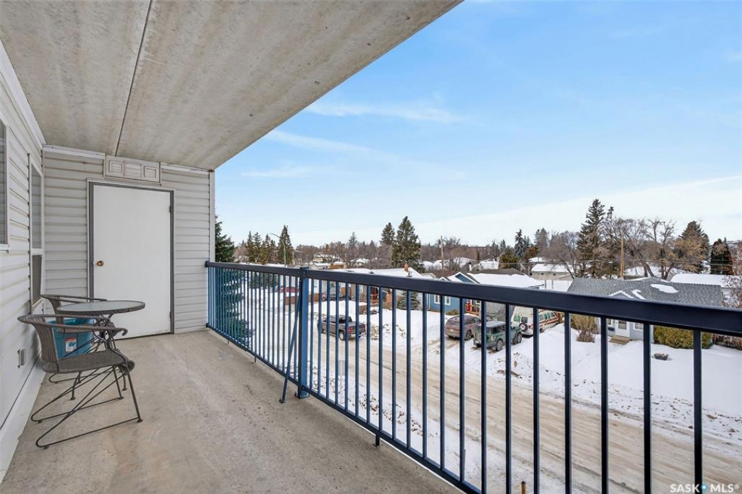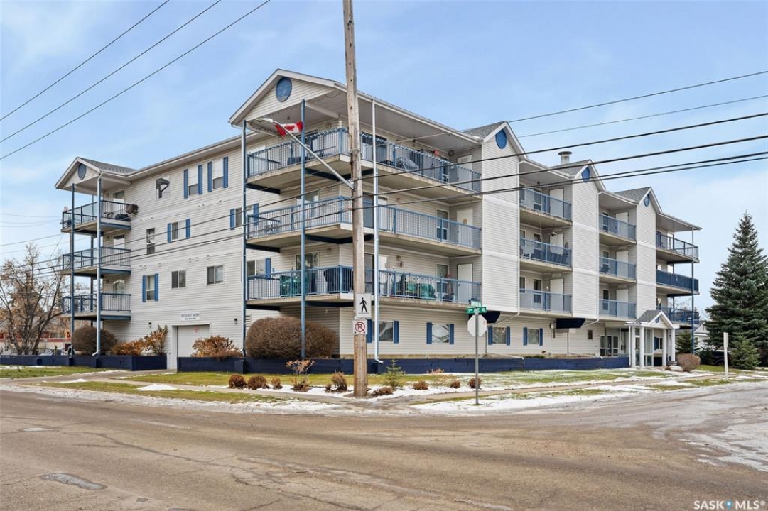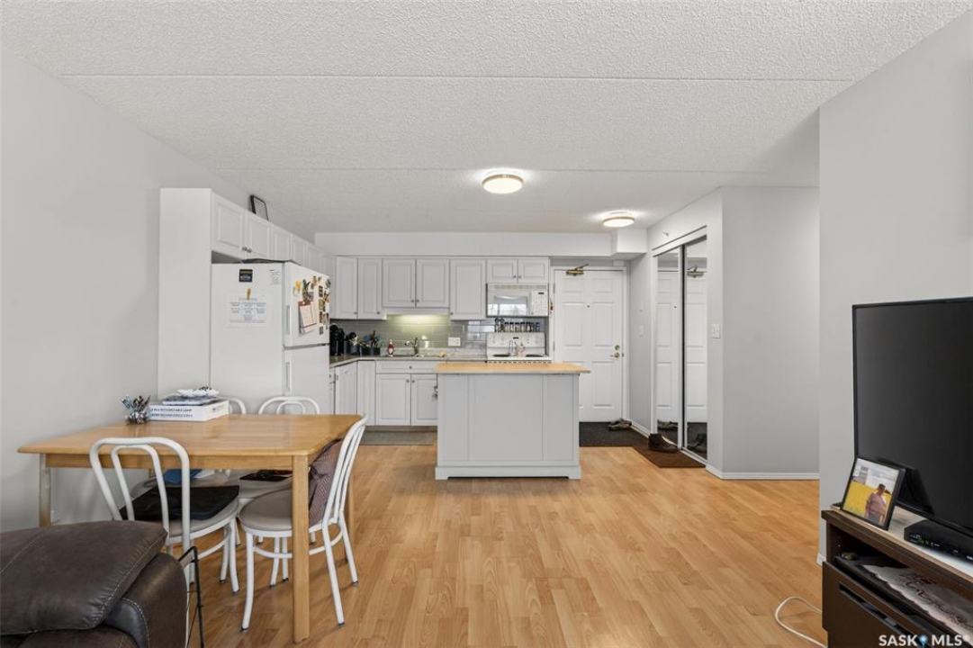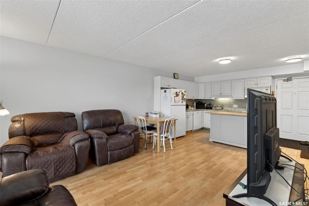 Enjoy low maintenance living in the desirable Regency Arms condo complex, ideally located across from Kinsmen Park and close to everyday amenities! The bright kitchen is both stylish and functional, featuring crisp white cabinetry, a newer modern backsplash, a newer fridge and new dishwasher, creating a welcoming space for casual dining and entertaining. The living room is filled with natural light and opens directly onto the balcony, perfect for enjoying your morning coffee or unwinding in the evenings. The balcony also features two private storage rooms for added functionality. There is also a spacious bedroom that has newer carpet, a versatile den for a home office or hobby space, a 4 piece bathroom, and a convenient laundry room, all enhanced by newer paint throughout that gives the unit a fresh and updated feel. Additional features include underground parking and elevator access, providing both convenience and accessibility. A comfortable and easy lifestyle awaits. Act now and make this your next move!