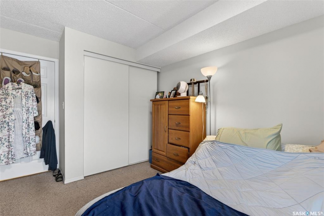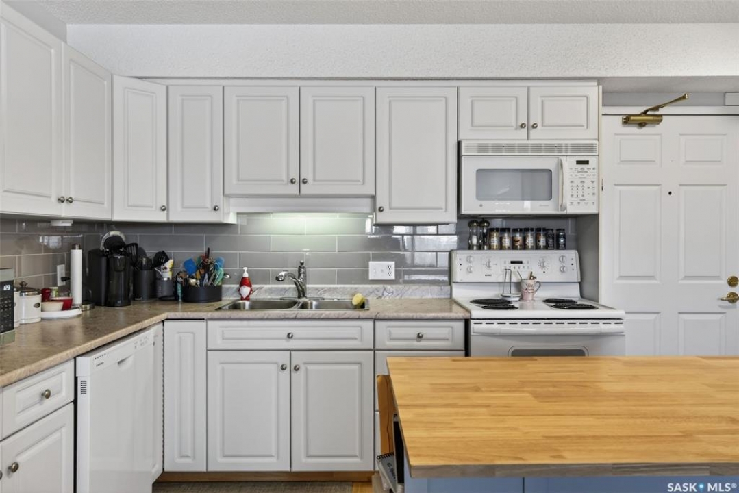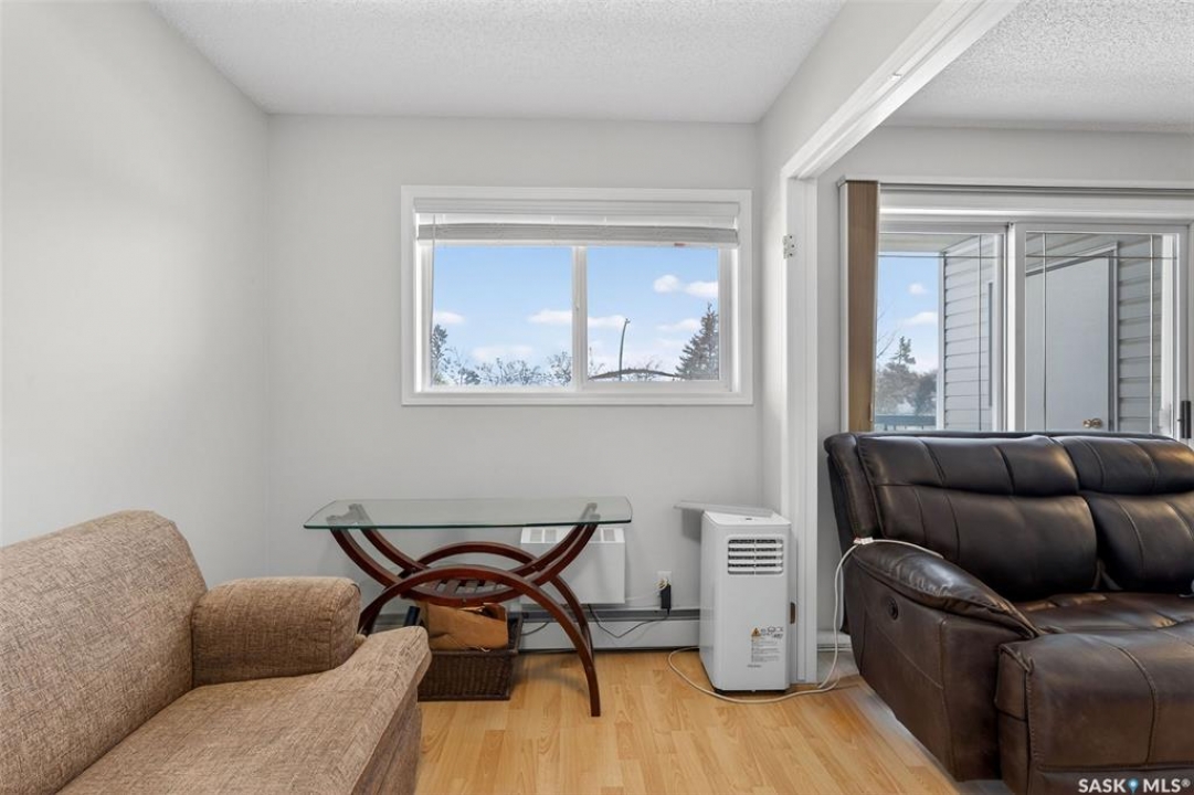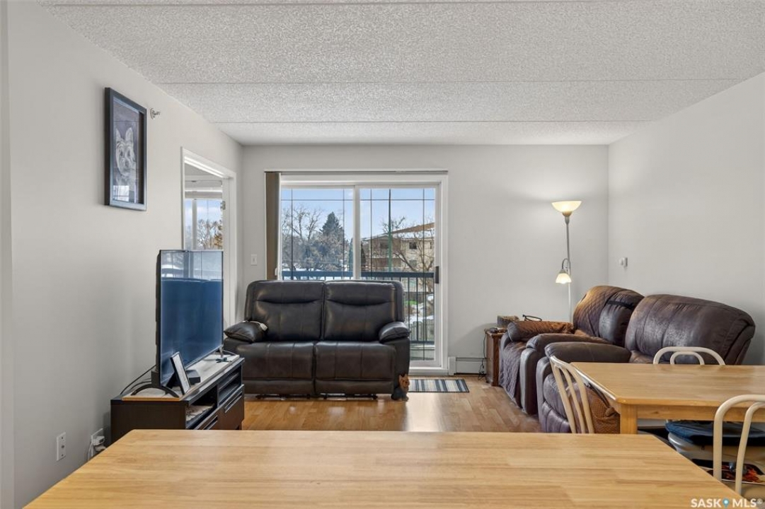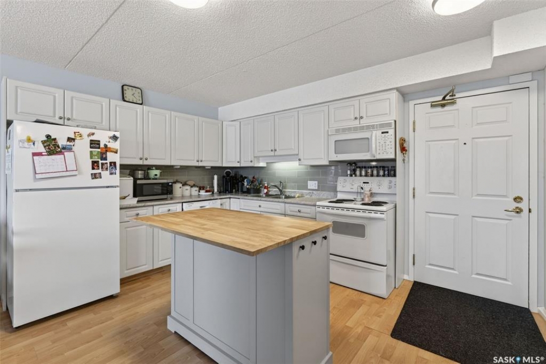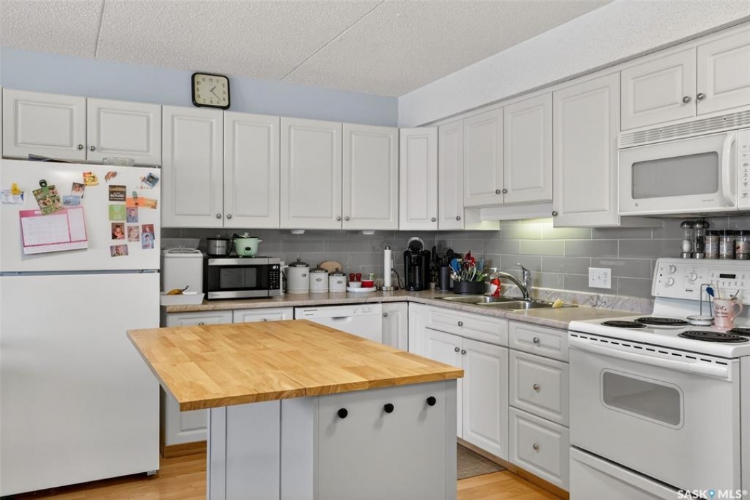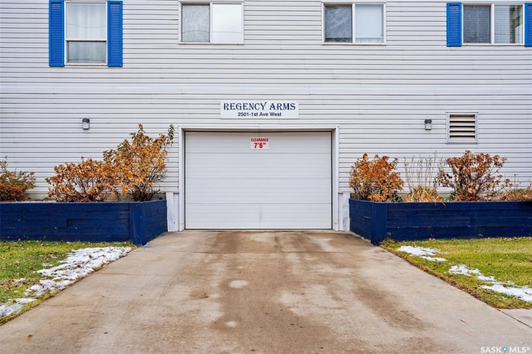 Enjoy low maintenance living in the desirable Regency Arms condo complex, ideally located across from Kinsmen Park and close to everyday amenities! The bright kitchen is both stylish and functional, featuring crisp white cabinetry, a newer modern backsplash, a newer fridge and new dishwasher, creating a welcoming space for casual dining and entertaining. The living room is filled with natural light and opens directly onto the balcony, perfect for enjoying your morning coffee or unwinding in the evenings. The balcony also features two private storage rooms for added functionality. There is also a spacious bedroom that has newer carpet, a versatile den for a home office or hobby space, a 4 piece bathroom, and a convenient laundry room, all enhanced by newer paint throughout that gives the unit a fresh and updated feel. Additional features include underground parking and elevator access, providing both convenience and accessibility. A comfortable and easy lifestyle awaits. Act now and make this your next move!