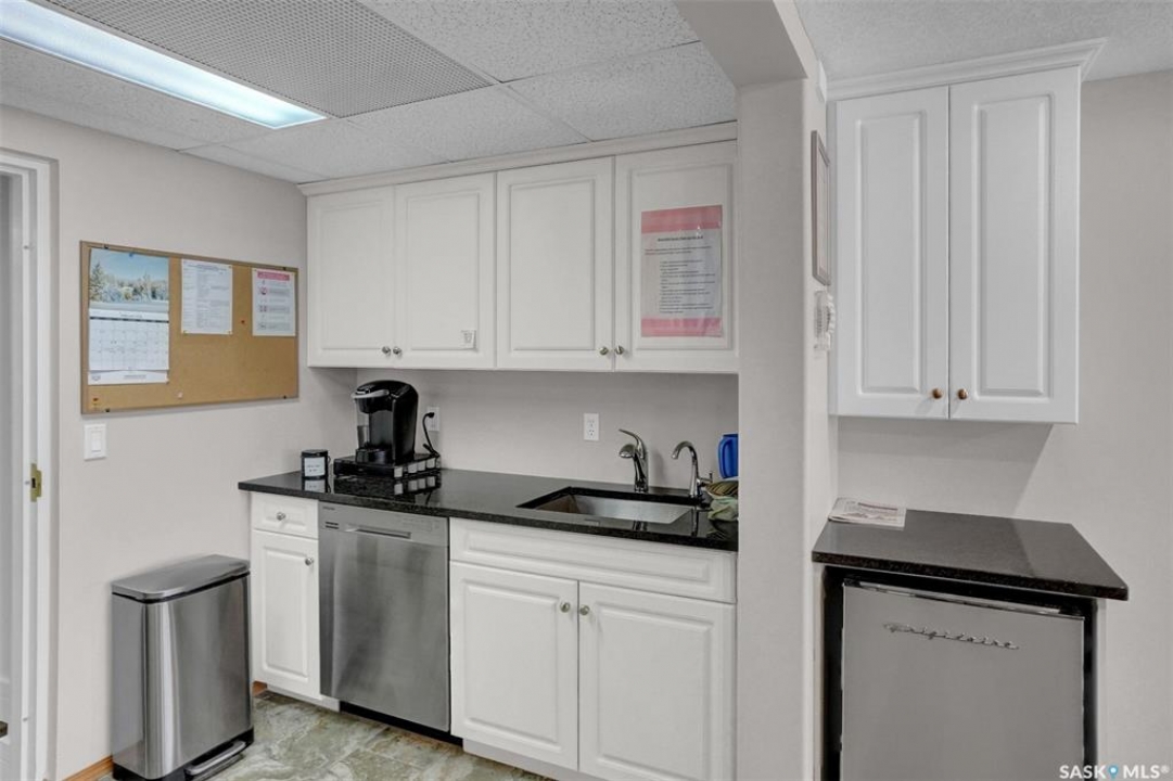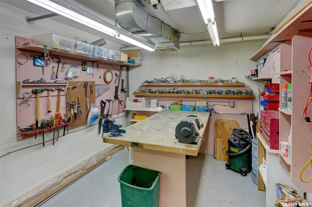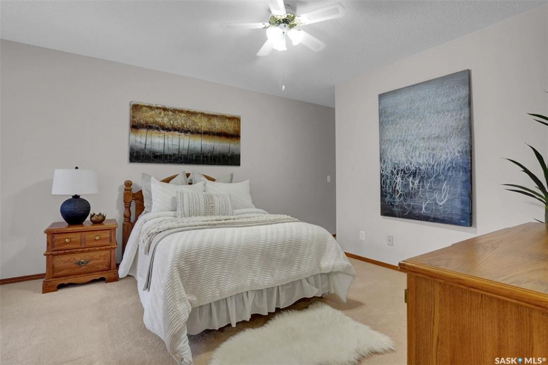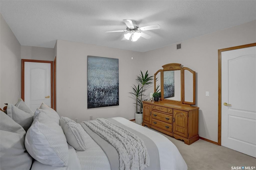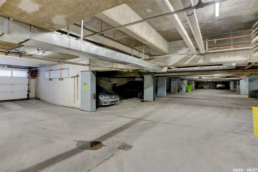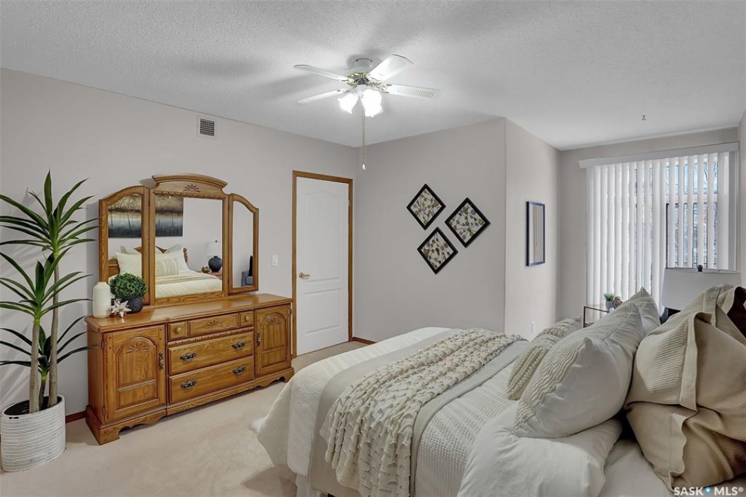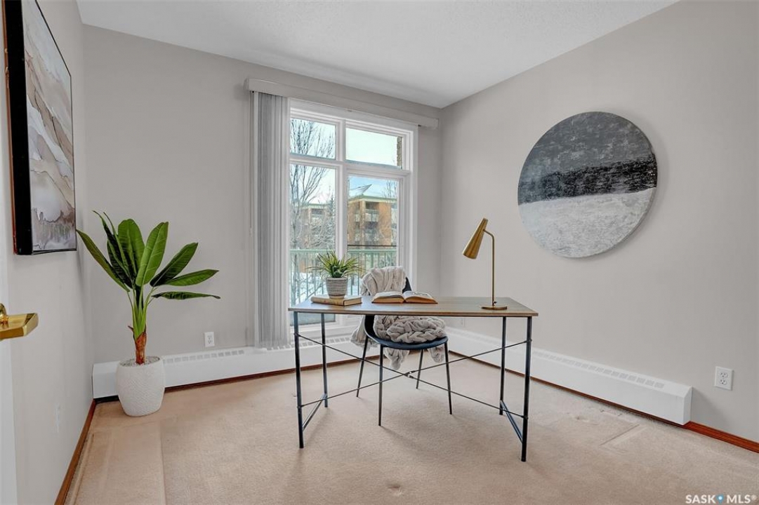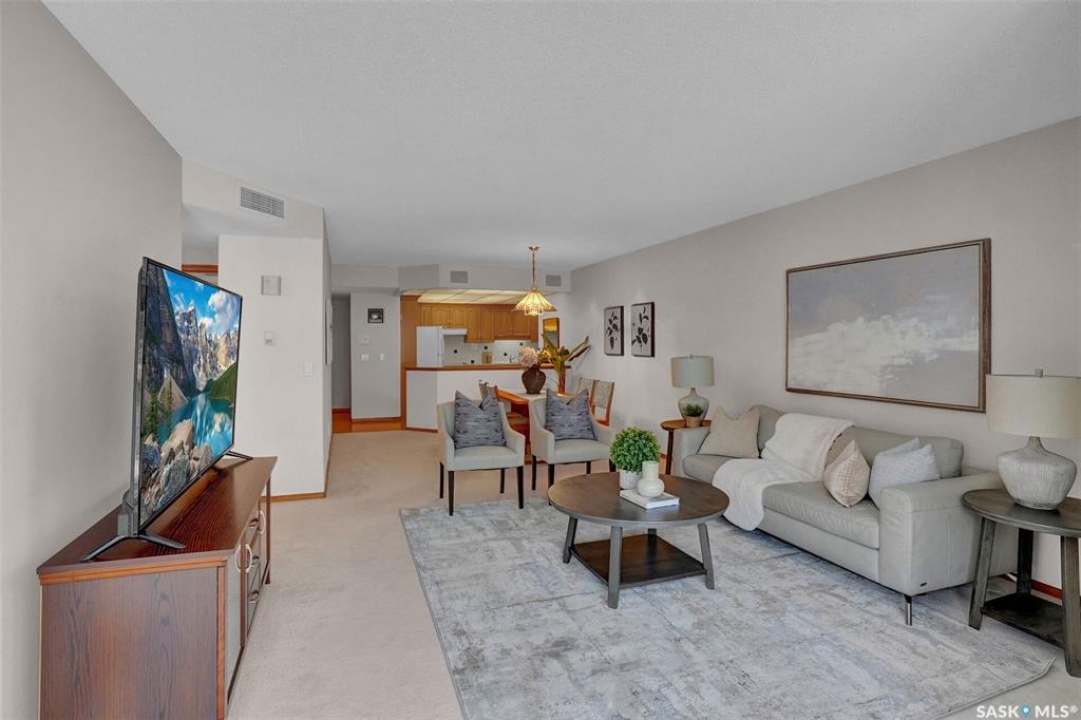 Welcome to this beautifully maintained 1,249 sq ft condo in the prestigious College Gardens complex. Offering 2 bedrooms and 2 bathrooms, this spacious unit combines comfort, functionality, and an unbeatable location directly across from Wascana Park. Filled with natural light, the open-concept living and dining areas are enhanced by a full wall of windows and direct access to your private balcony overlooking peaceful greenspace. The generous dining area easily accommodates large family gatherings, while the oak kitchen is in pristine condition and features a built-in oven and cooktop, tiled backsplash, pantry with pull-out drawers, and a bright eat-in nook. A large front foyer welcomes you into the unit, with a convenient laundry/storage room just off the entrance. The second bedroom is ideally suited as a guest room, home office, or library, with a 4-piece bathroom and linen closet located directly across the hall. The primary bedroom is a true retreat, offering space for a king-sized suite, a cozy reading nook with views of the greenspace, a 6'5" x 5'8" walk-in closet, and a private ensuite complete with a walk-in shower featuring dual seating. Constructed with concrete, this building provides exceptional soundproofing, privacy, and peace of mind. Additional highlights include one heated underground parking stall with a spacious 6'11" x 8'6" storage unit located directly in front of your parking space. Ideally situated with convenient access to downtown, the University of Regina, the airport, and the natural beauty of Wascana Park, this is condo living at its finest.