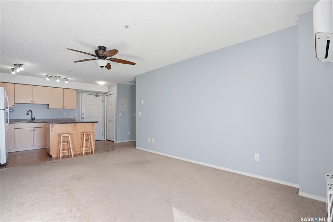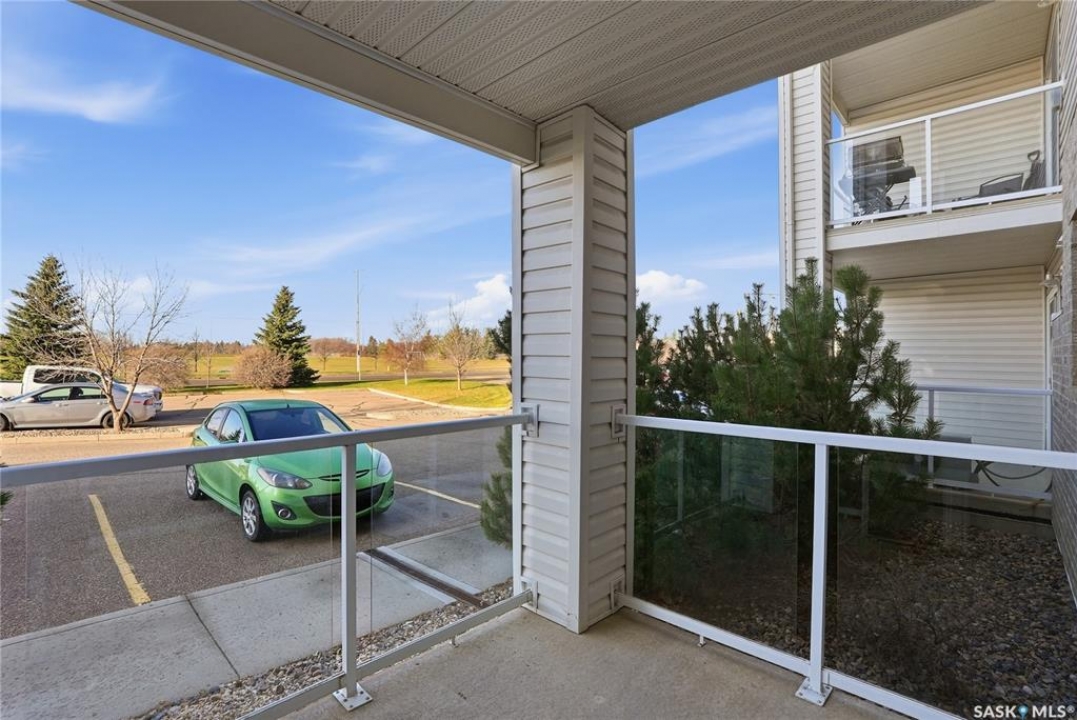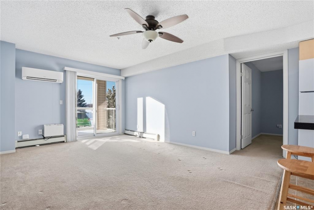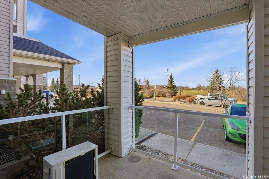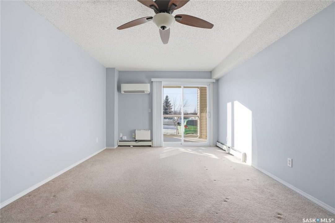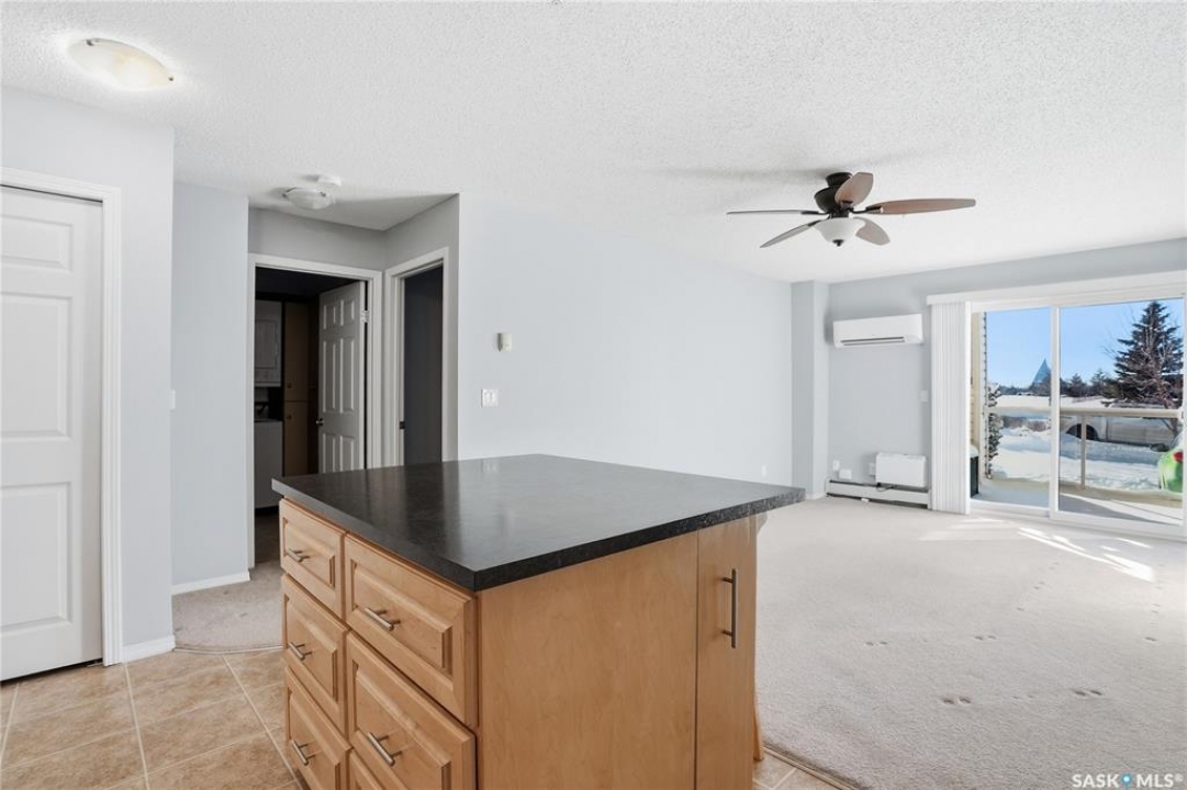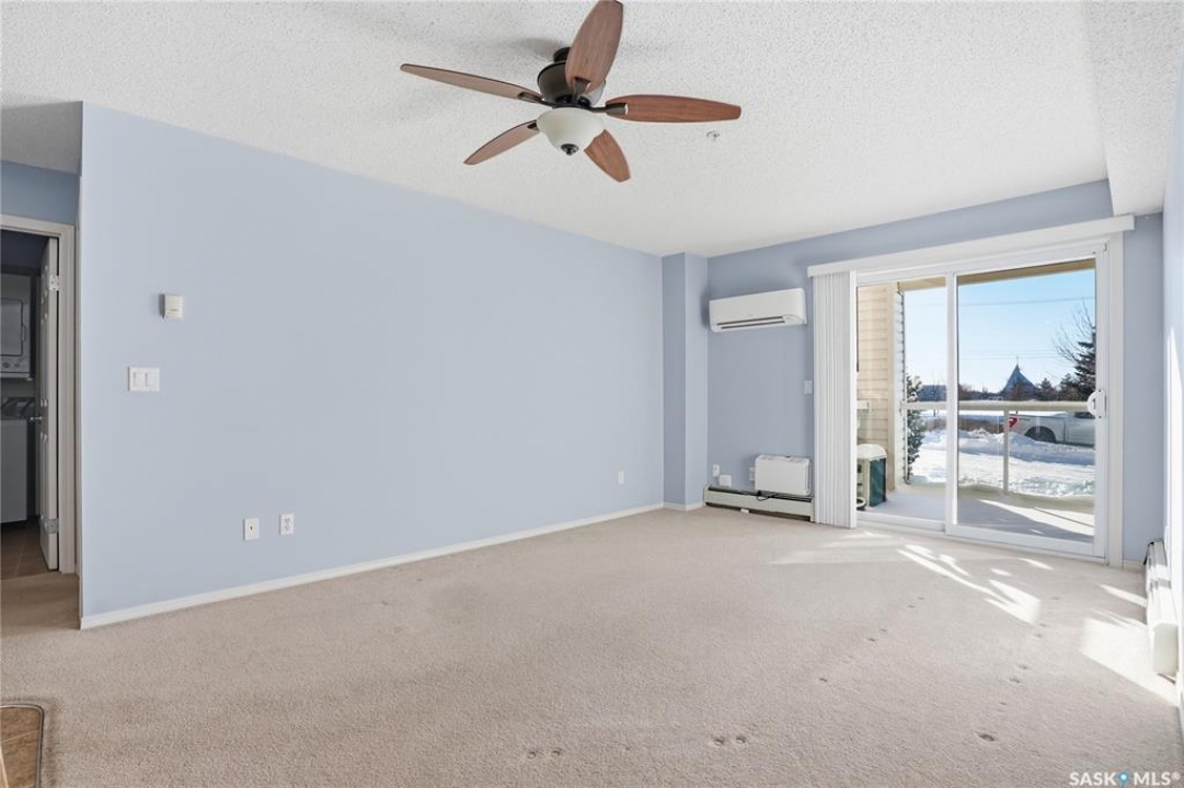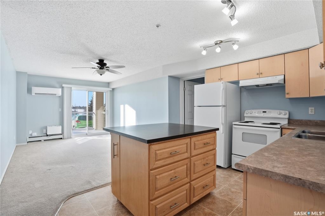 Welcome home to 303 Lowe Road unit 107. West facing views, underground parking, and a 1 + 1 configuration for a primary sized bedroom and large den - this condo shows 10/10! Step inside to find a bright main area with a kitchen that is clean and functional. Ample storage around with a custom built island that hosts drawers on either side! The living room features an updated Air Conditioner and is set for relaxing with plenty of natural light from the large patio doors. From here you have access to your own covered patio space. Inside you will find that the primary bedroom is a great size with room for a large bed and dresser. Opposite to this bedroom is a large den that could accommodate a bed and has an included closet system. The bathroom is a clean 4 piece design with laundry included. Located in University Heights you will find this to be one of the most walkable locations in Saskatoon! Steps to the bus stop and a short walk to grocery stores, restaurants, gyms, and walking paths through the Forestry Farm and the north swale. Amenities include an exercise room, elevator, and plenty of visitor parking. Well cared for and turn-key! Call today to see this exceptional home!