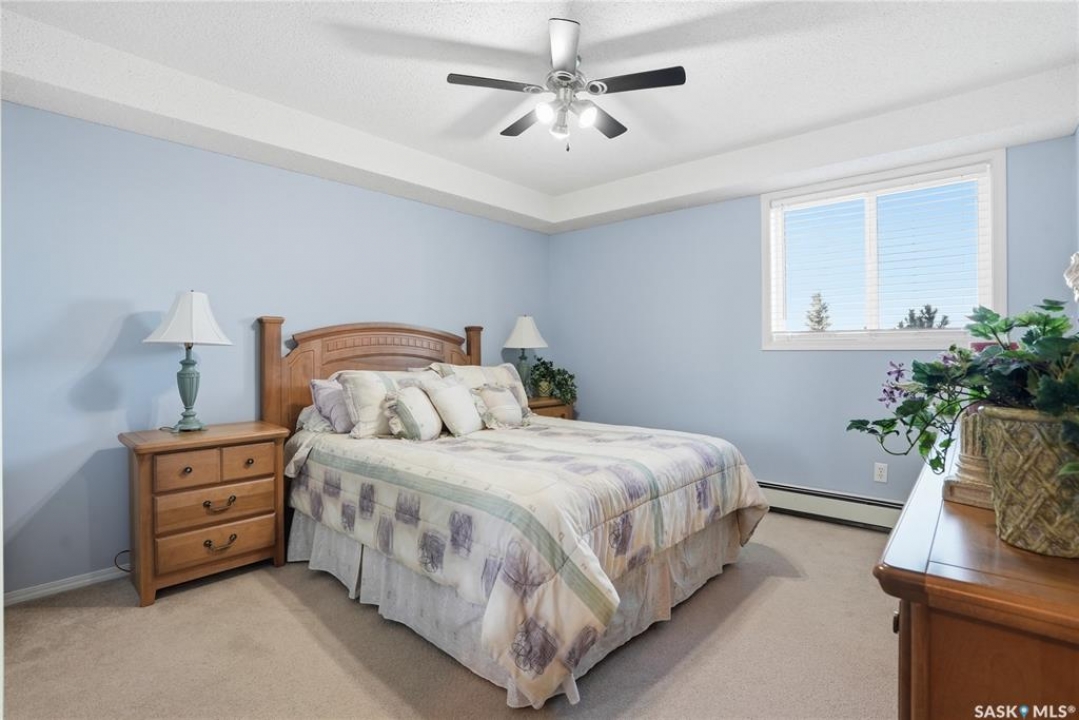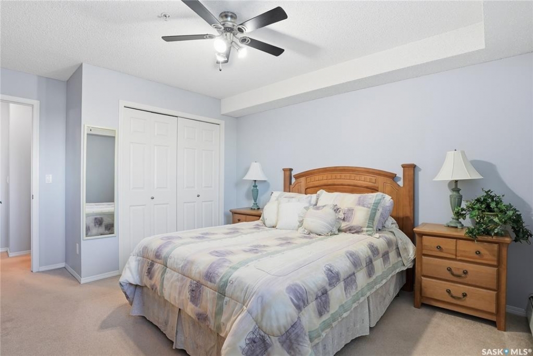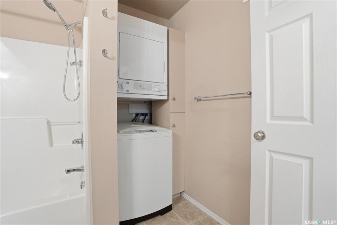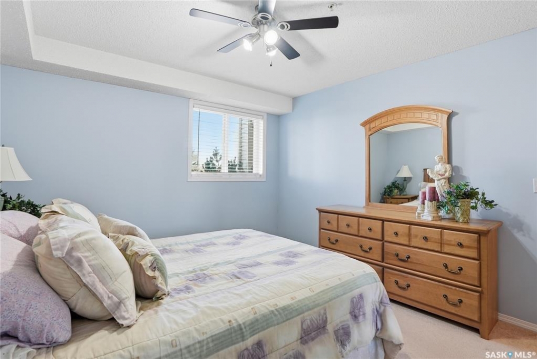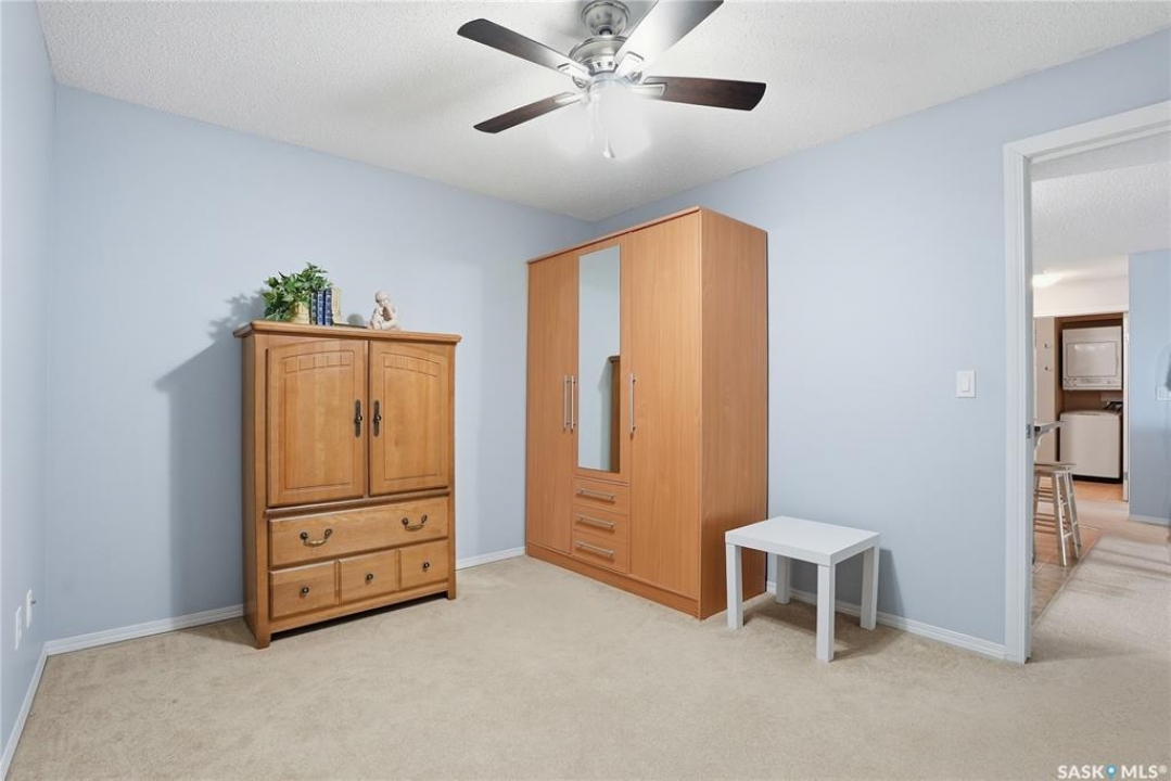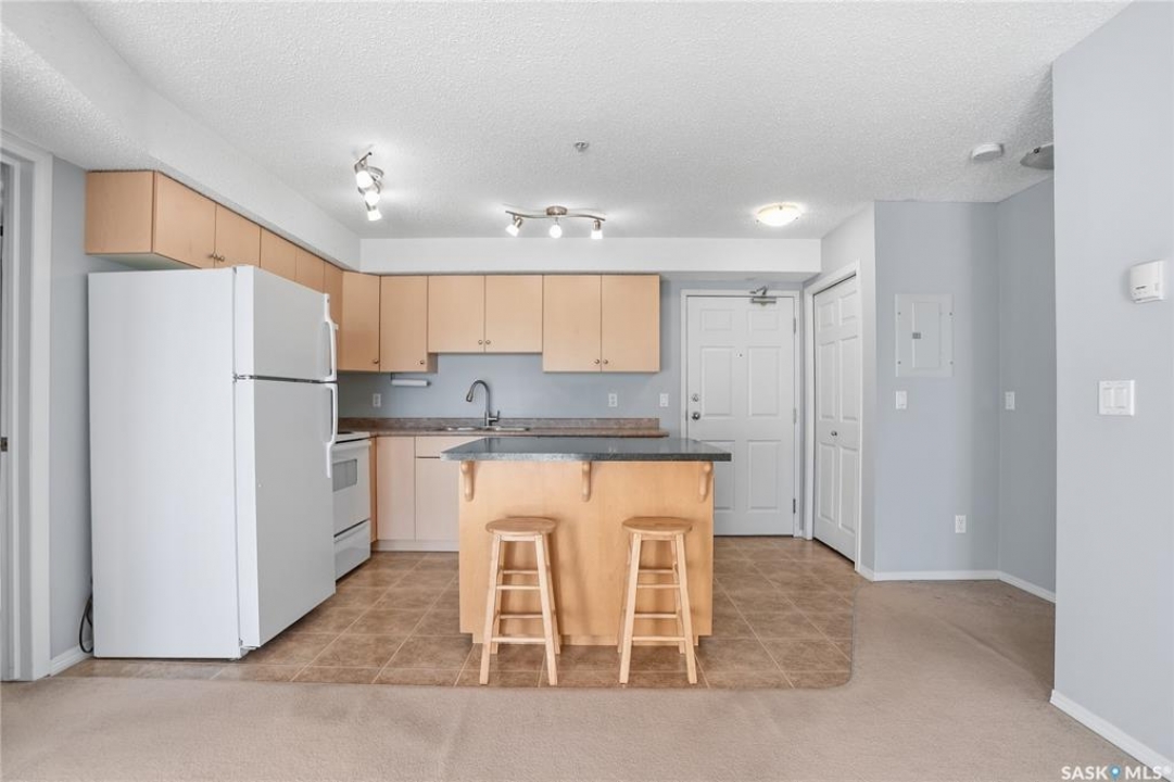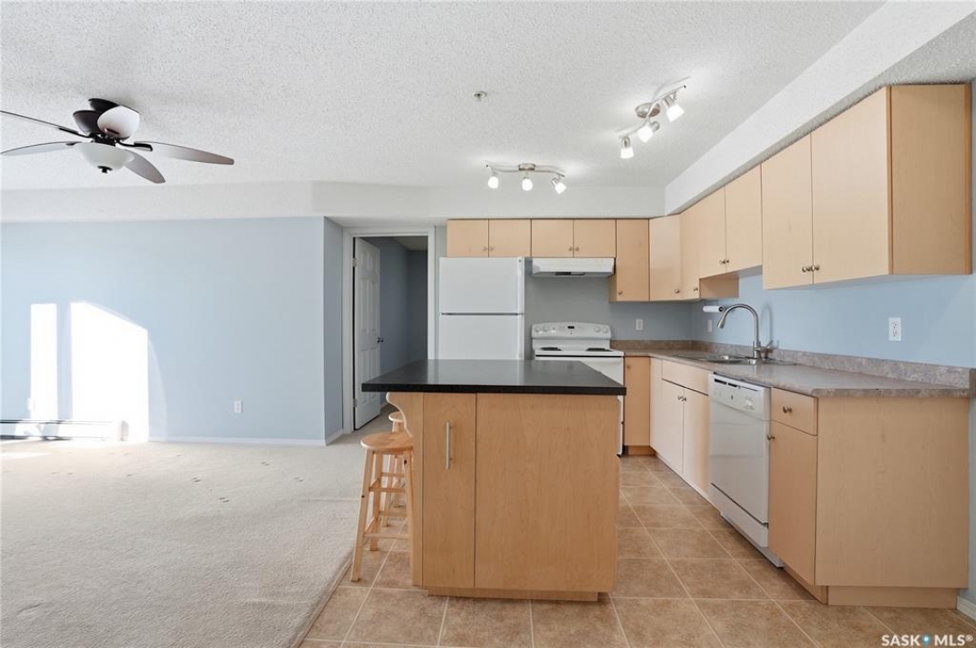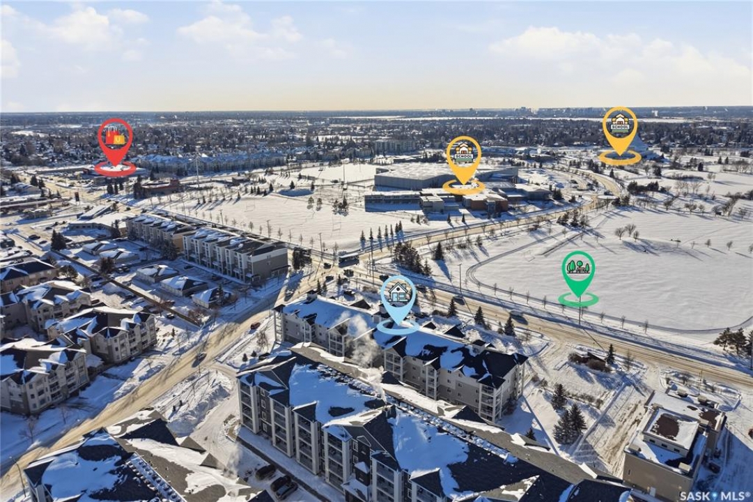 Welcome home to 303 Lowe Road unit 107. West facing views, underground parking, and a 1 + 1 configuration for a primary sized bedroom and large den - this condo shows 10/10! Step inside to find a bright main area with a kitchen that is clean and functional. Ample storage around with a custom built island that hosts drawers on either side! The living room features an updated Air Conditioner and is set for relaxing with plenty of natural light from the large patio doors. From here you have access to your own covered patio space. Inside you will find that the primary bedroom is a great size with room for a large bed and dresser. Opposite to this bedroom is a large den that could accommodate a bed and has an included closet system. The bathroom is a clean 4 piece design with laundry included. Located in University Heights you will find this to be one of the most walkable locations in Saskatoon! Steps to the bus stop and a short walk to grocery stores, restaurants, gyms, and walking paths through the Forestry Farm and the north swale. Amenities include an exercise room, elevator, and plenty of visitor parking. Well cared for and turn-key! Call today to see this exceptional home!