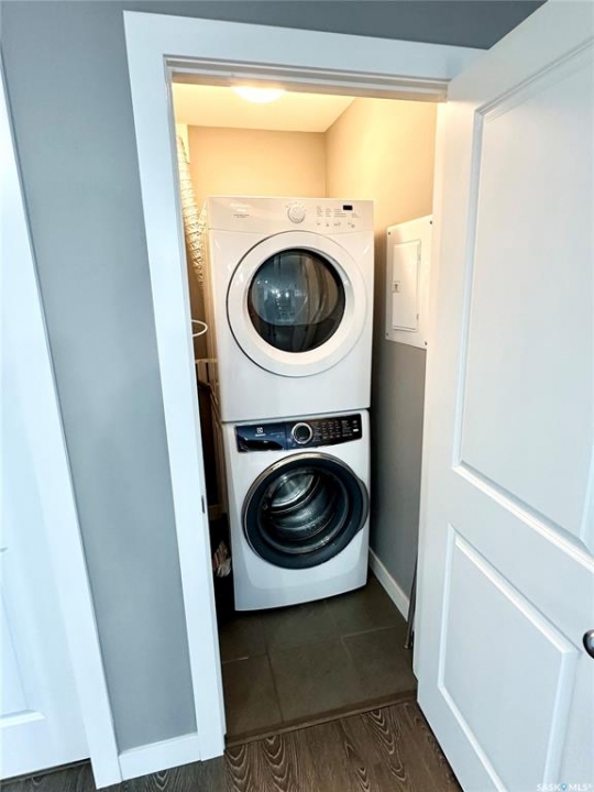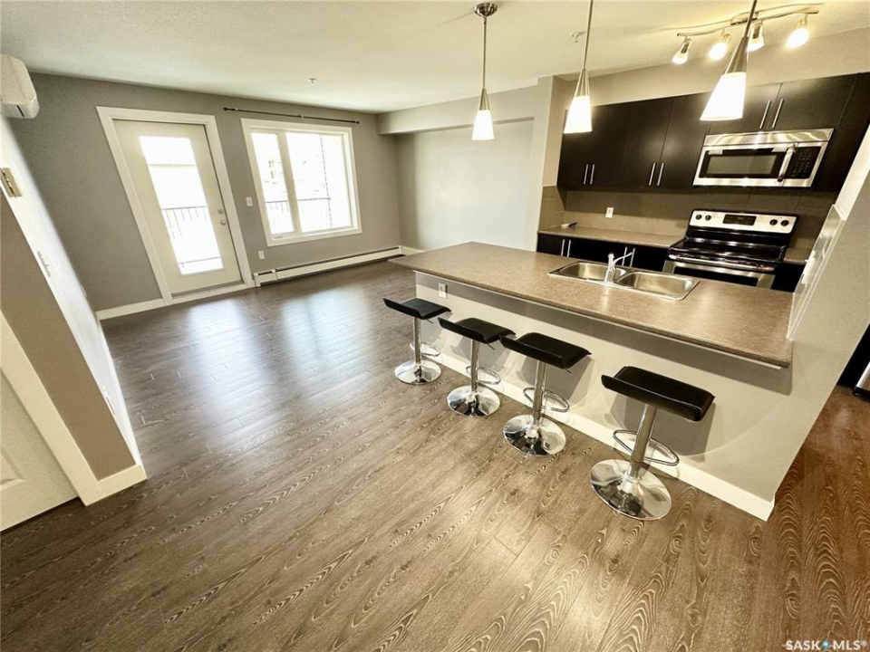 Welcome to this stylish 907 sq ft condo in the modern Fifth & 5th building. This beautifully designed two-bed two-bath suite offers an open-concept layout that seamlessly connects the kitchen, dining, and living areas, perfect for both everyday living and entertaining. You will love the contemporary finishes throughout. The spacious kitchen features stainless steel appliances, abundant cabinet and counter space, and a large island that serves as the heart of the home. The primary bedroom includes a walk-in closet and a private 4-piece ensuite, creating a comfortable retreat. A second bedroom offers flexibility for guests, a home office, or growing families. Enjoy the convenience of in-suite laundry and unwind on your private southwest-facing balcony with great natural light. This unit also includes a designated parking stall in the heated underground parkade which will keep your vehicle warm and protected all winter long. Call today to book your private viewing.